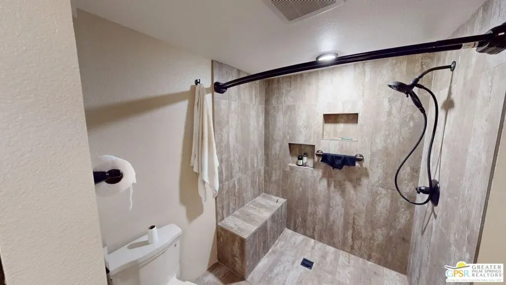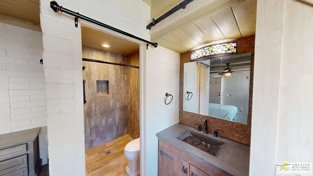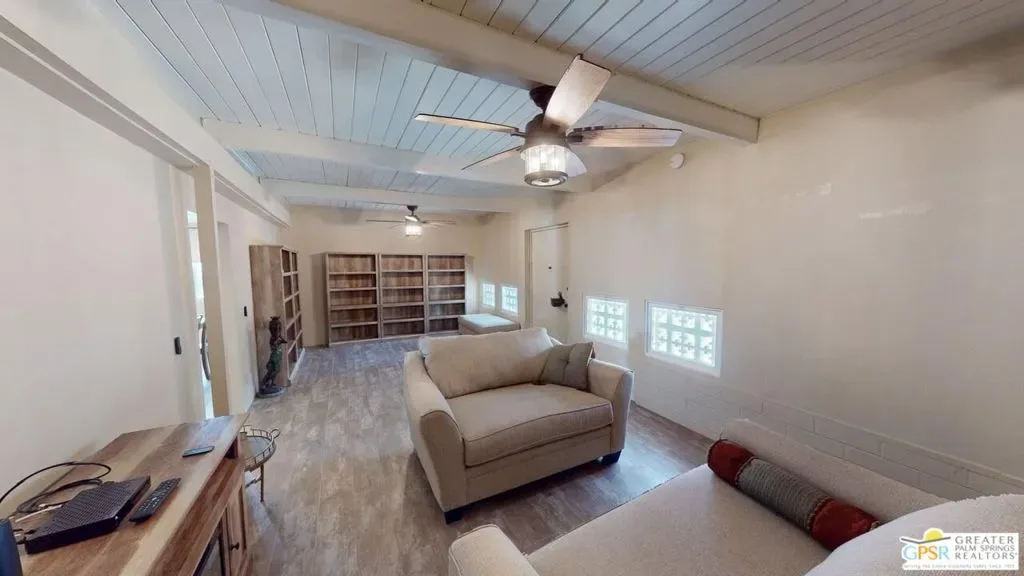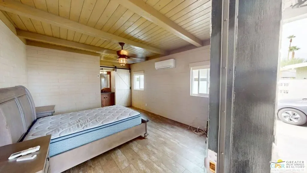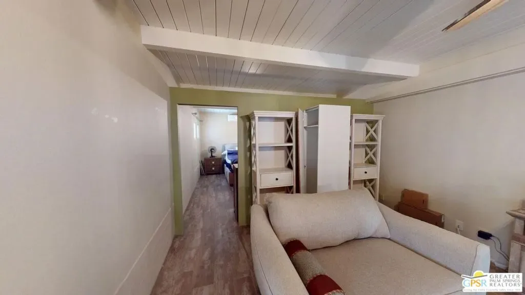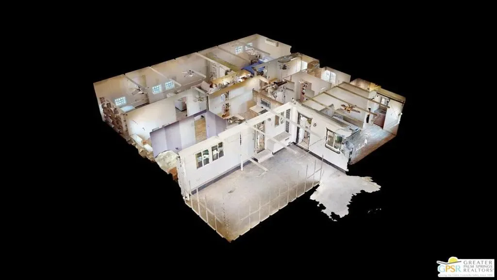 Blue Skies at it’s finest and thank you Bing Crosby for opening Blue Skies many years ago for the non – actors who wanted a lifestyle in the desert but couldn’t afford a pool home. But I digress. Here is a whimsically designed 3 Bedroom 2 Bath home and one of the bedrooms is actually an attached Casita with it’s own bath and private entrance. A 1960’s mobile home is surrounded with stick-built construction lending to it’s solid feeling and quiet interior space. Approaching this home, one can’t actually tell where the living room windows are because of the intricate concrete facade. Once inside, the living room windows are close to the floor, but with some slight upgrading, there is potential for larger windows. Forward from the living room, with built-in bookshelves, is the dining area and access to the second bedroom and then to the left is the well detailed galley kitchen with the walk-in pantry across from it. Further on is the stacked washer and dryer in it’s own closet and then beyond that is the Primary Bedroom Suite Closet and large stall shower bathroom – roll in variety. Then to the left is the primary bed chamber with direct access to the front living room. Outside the back door there is access to the Casita with it’s own entrance and bath area. There is covered carport parking and extra uncovered parking as well. Blue Skies offers a clubhouse and exercise room and the community pool and spa. Blue Skies is also close to restaurants and shopping especially on El Paseo – the Rodeo Drive of the Desert!