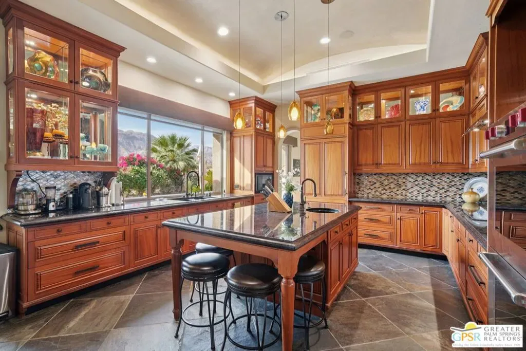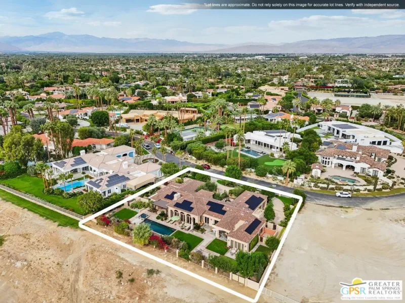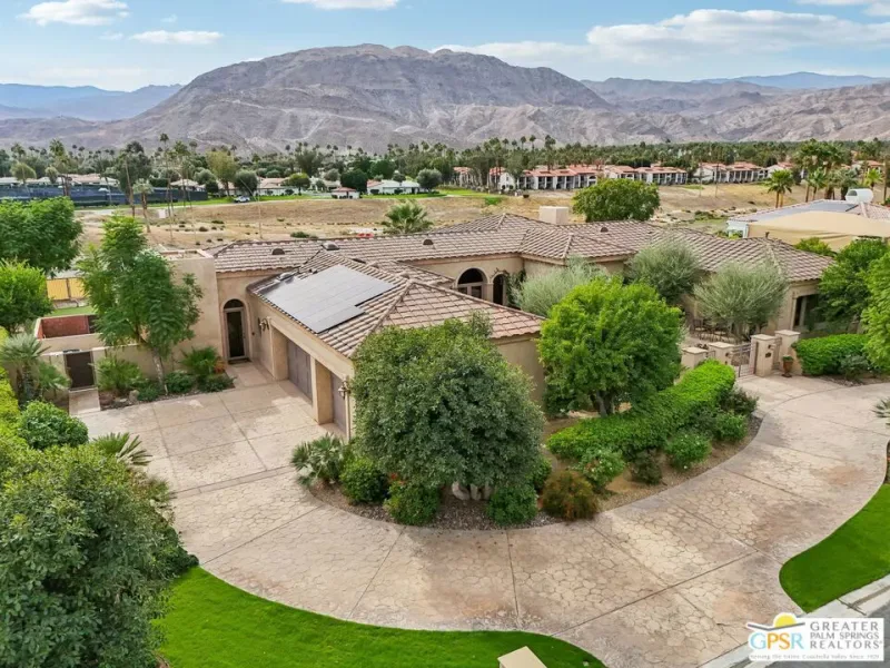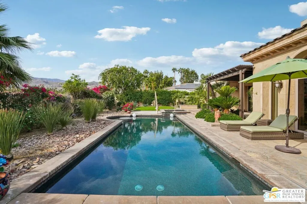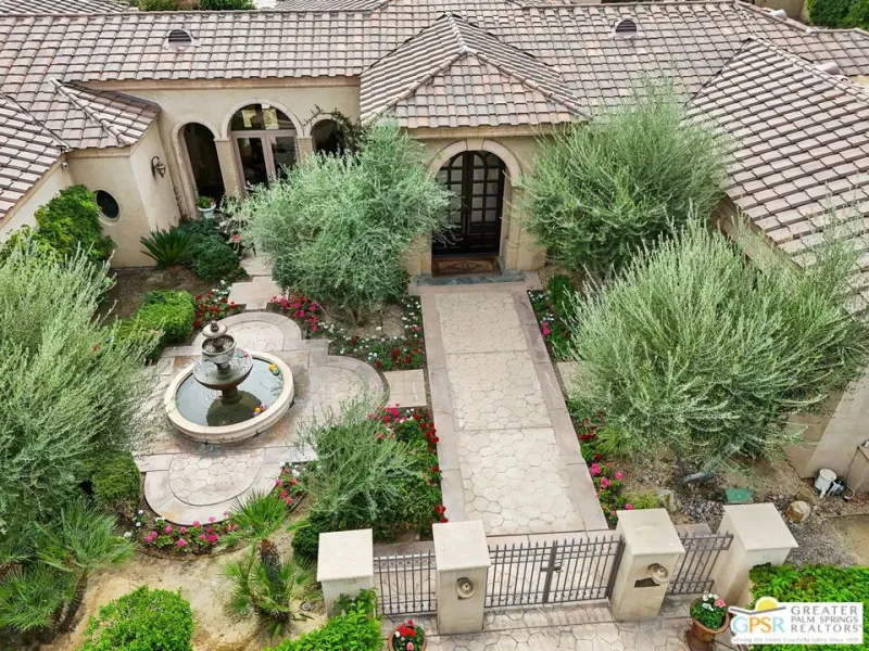 Sophisticated luxury meets timeless elegance in this exceptional Clancy Lane estate in one of Rancho Mirage’s most prestigious addresses. From the moment you arrive via the circular drive and enter the gated courtyard with its tranquil fountain and grand custom doors, the home sets a tone of refined desert living. A dramatic foyer leads to the formal living room, where a stacked-stone fireplace, soaring ceilings, and French doors showcase sweeping south-facing mountain views. The chef’s kitchen is a culinary masterpiece, featuring illuminated mahogany cabinetry, granite surfaces, a generous prep island with counter seating, 100-bottle wine cooler, and elite appliances including buit-in Sub-Zero refrigerator, Dacor Range top, Miele Dishwasher, Wolf double ovens, and a warming drawer. Seamless flow connects the kitchen to both the intimate dining area and the inviting family room. Designed for effortless indoor-outdoor living, the residence features an expansive entertainment pavilion complete with built-in gas BBQ, mini refrigerator, mini dishwasher, sink, granite counters, ceiling fan, and outdoor TV. The resort-style half acre plus backyard offers a PebbleTec pool and spa, each with independent heating systems plus a new ‘Estate Green’ putting green, Sonus outdoor speakers, automatic landscape lighting, and a cooling misting system for warm desert days. The thoughtfully designed floor plan provides exceptional privacy with two primary suites and an additional ensuite guest bedroom, each with patio access and electric roller shades. Additional highlights include a finished 3-car garage with extensive cabinetry and refrigerator, a spacious interior laundry room with office niche, and a host of significant upgrades: double insulation, owned new solar panels, four new A/C condensers, two new furnaces, two new tankless water heaters, and a new Kinetico water softener and filtration system, plus a built-in lighting control system . The home is also equipped with a security system 8 exterior and 2 interior Ring cameras. 20 Clancy Lane Estates is a rare offering of elegance, comfort, and impeccable craftsmanship. This Clancy Lane estate embodies the pinnacle of Rancho Mirage luxury living.