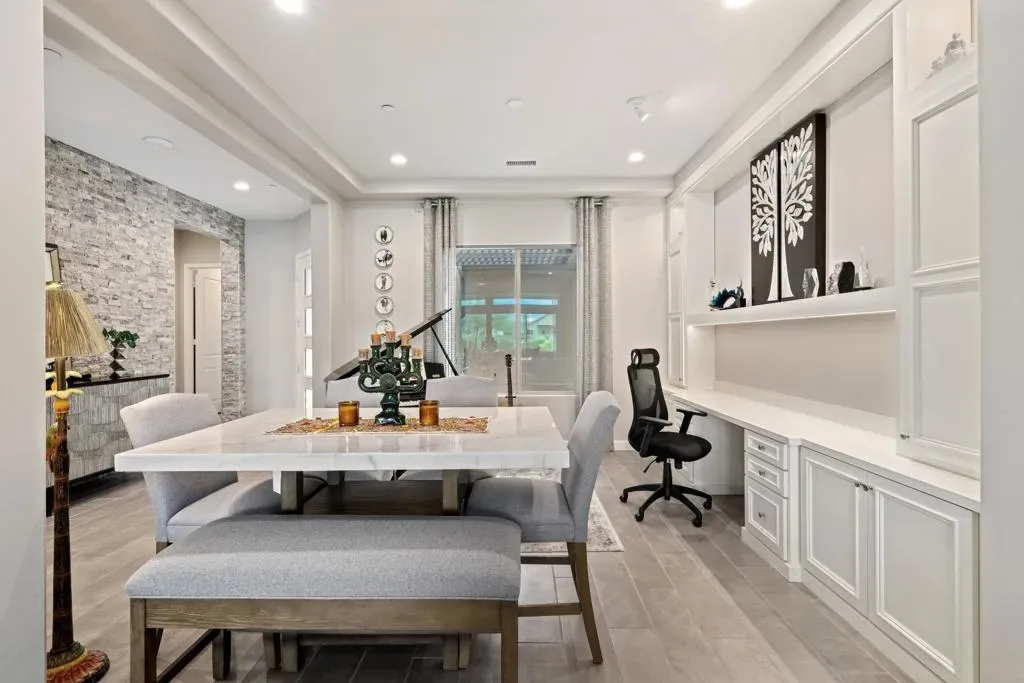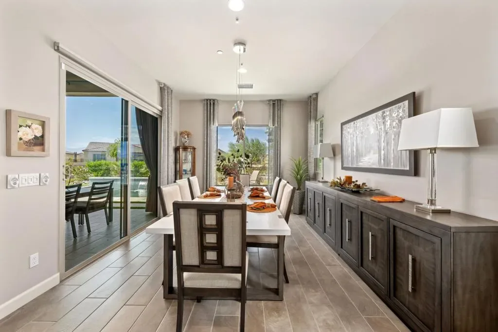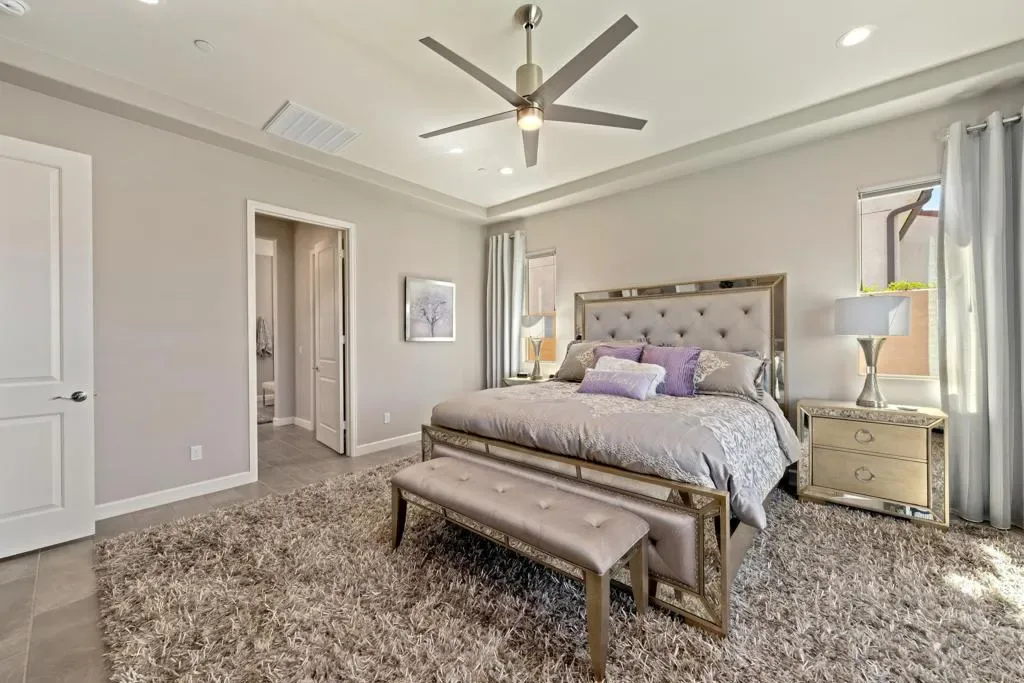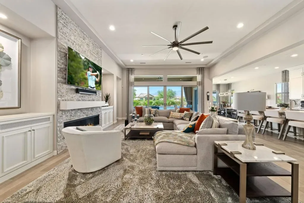 Welcome to 140 Cabernet, an impressively upgraded Voyage plan — the largest model offered in the popular 55+ Del Webb community. This three-bedroom, four-bath home, with its seamless indoor-outdoor living spaces, sits on a premium interior lot with sweeping south-to-west mountain views — a gateway to classic desert moments.Step inside, and the attention to detail is clear. The owners have invested over $320,000 in builder upgrades alone, plus the addition of a custom private pool and so much more. You’ll also enjoy owned Tesla solar, professional landscaping with turf lawn, and a three-space garage that includes a dedicated golf cart bay. A secured, gated front courtyard welcomes you in.Inside, plank tile flooring flows throughout the home. A striking ledgestone feature wall greets you at the entry, while a matching stone fireplace surround anchors the great room. An open flex space with custom built-ins located just off the entry makes an excellent office or additional living area. The kitchen is a standout, featuring custom ceiling-height cabinetry, a walk-in pantry, exquisite stone countertops, stainless steel appliances, and a gas range — all bathed in natural light and open to the great room.The elegant primary suite features two walk-in closets with custom built-ins and an en-suite bath with an expansive frameless glass shower. The laundry room is thoughtfully designed with a utility sink and ample storage.Outdoors, the home truly shines. Double sliding doors open to a spacious loggia with the flooring transitioning seamlessly from the main interior living space, a stone accent wall with mounted television, and ample room for al fresco dining and lounging. Just beyond lies a private pool with a soothing water ledge feature, a covered built-in outdoor barbecue with seating area, and a side-yard putting green, making this backyard a prime spot for gatherings. With low HOA dues, residents of Del Webb enjoy access to a manned gate, a world-class clubhouse, two resort-style pools and spas, a fitness center, pickleball, tennis, walking trails, and a wide variety of social and recreational activities. This is a special property that deserves to be seen in person. A detailed upgrade list is available upon request, and furnishings are negotiable. Make your appointment today to experience everything 140 Cabernet has to offer.