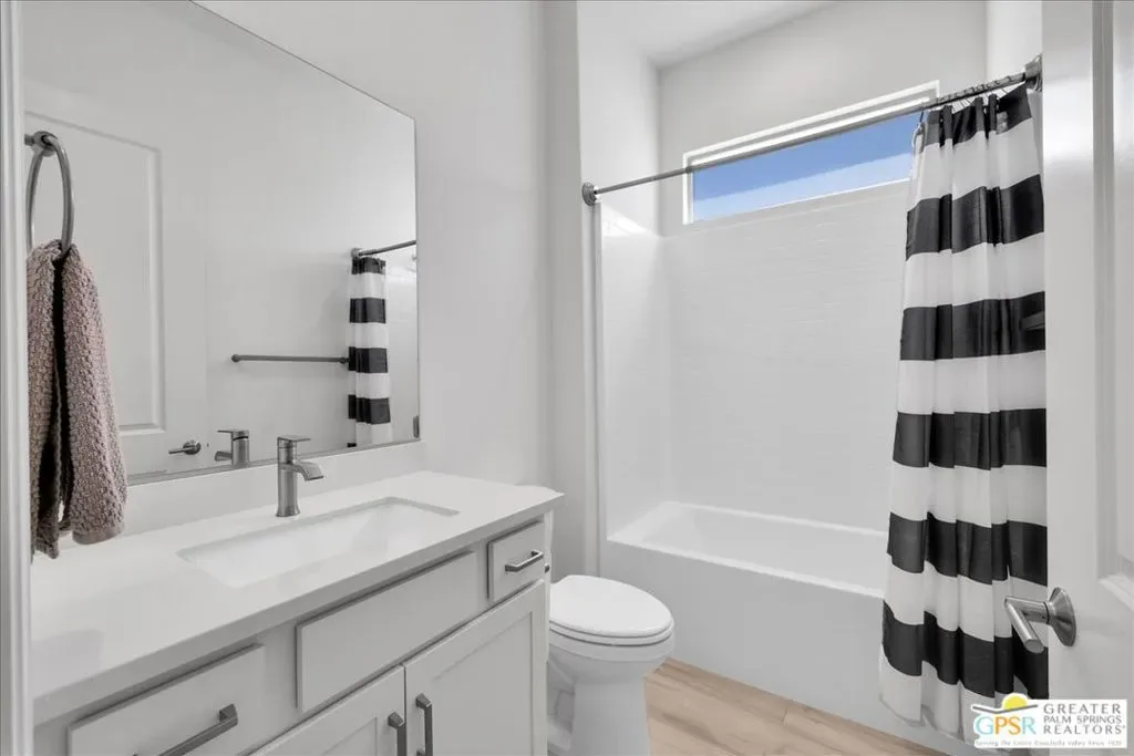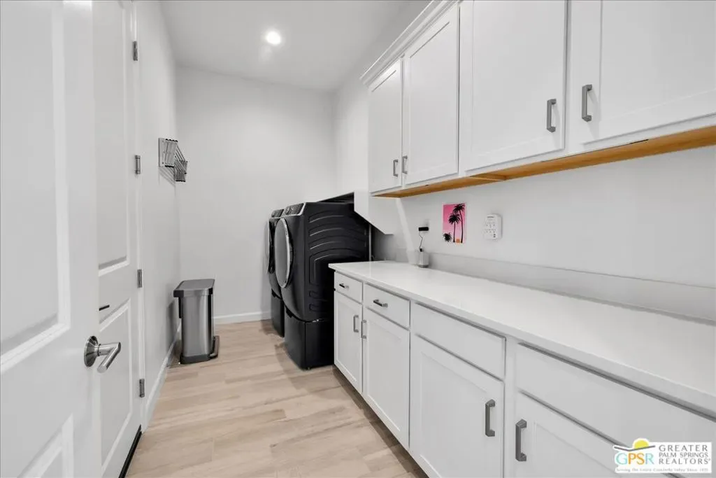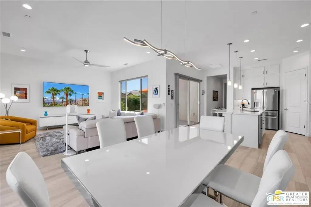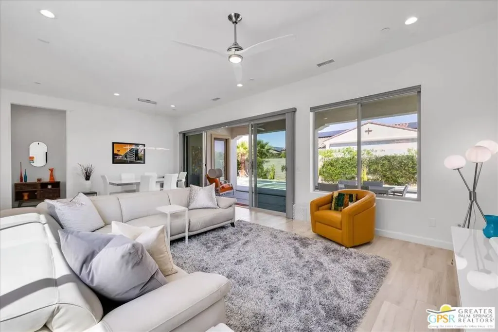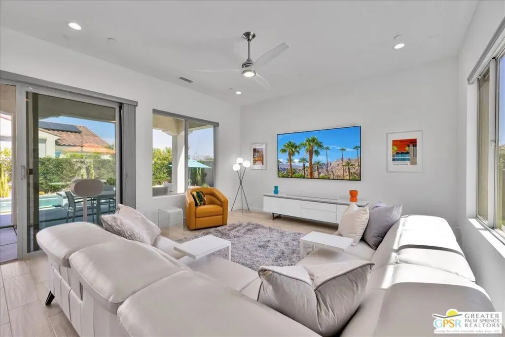 Rare Three-Bedroom Haven with Pool, Spa & Mountain Views | Del Webb Rancho Mirage. Located on a spacious lot in the final phase of the 55+ community of Del Webb Rancho Mirage, this beautifully upgraded Phase 7, Plan 5 Haven with Spanish facade offers a rare combination of features, including the highly sought-after three-bedroom configuration, OWNED SOLAR, and sweeping MOUNTAIN VIEWS. Thoughtfully designed for both comfort and style, this home features WOOD-LOOK PORCELAIN PLANK TILE FLOORING, custom window treatments, and modern brushed nickel fixtures throughout, creating a fresh and inviting atmosphere. The kitchen is the heart of the home and has been extensively upgraded with white shaker cabinetry, 42-inch upper cabinets, Jewel topper cabinets with crown molding, and Level 5 QUARTZ COUNTERTOPS complemented by a full-height backsplash. A large reach-in pantry has been enhanced with custom shelving, additional storage, and added power outlets for convenience. The oversized island offers generous seating and additional lighting, making it ideal for gathering and entertaining. Unique to the Haven floorplan is the charming secondary courtyard patio just off the kitchen – a wonderful extension of the living space and the perfect setting for morning coffee, al fresco dining, or enjoying the desert climate year-round. The kitchen flows seamlessly into the dining and living areas, all filled with natural light and opening to the spectacular backyard through expansive glass. Outside, the large covered patio overlooks a stunning 43-foot pool and spa with tanning shelf, all framed by beautiful mountain views and generous outdoor space. The primary suite is a peaceful retreat with views of the backyard and direct access to the patio through an upgraded access door. The spacious ensuite bath features dual separate vanities, each with its own undermount sink, a large glass-enclosed shower, and an exceptionally large walk-in closet with custom built-in cabinetry and shelving. The two additional bedrooms are privately located on the opposite side of the home and each feature custom closet systems, making them ideal for guests or family. They share convenient access to a well-appointed secondary bath. This oversized lot is especially well suited to the Haven floorplan, offering abundant outdoor living space both in the backyard and around the secondary courtyard patio. Mature landscaping, mountain views, and multiple entertaining areas make this home feel like a private resort. Additional highlights include a 2.5-car garage with epoxy-sealed floors, climate control, extensive custom cabinetry and workbench space, plus a NEMA 50-amp outlet ready for a future electric vehicle charger. Ideally located within close proximity to the clubhouse, this home provides easy access to all that Del Webb Rancho Mirage has to offer, including a resort-style pool and spa, state-of-the-art fitness center, tennis and pickleball courts, and a vibrant calendar of activities and events and more! The community is also conveniently located near shopping, dining, entertainment, and the renowned Eisenhower Medical Center. HOA dues now include cable and internet for added convenience and value. A rare opportunity to enjoy one of Del Webb’s most desirable floorplans with exceptional indoor-outdoor living, generous space, and stunning desert views.