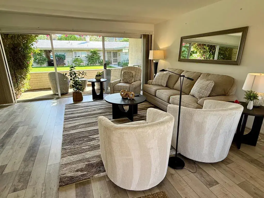 MAJOR PRICE REDUCTION! Rarely available desirable ground floor unit boasts 2 patios, 2 bedrooms and 2 baths. Located in one of the premier locations within Desert Braemar with no views of cars or roadways. Bright and sunny this home has been lovingly maintained and is an unbelievable value in upscale Rancho Mirage. Often called the hidden gen of the desert the 12+ acres are impeccably maintained by 6 full time staff including 3 gardeners, 2 maintenance crew and an on-site manager. Enjoy care-free resort style living with every possible amenity including clubhouse, gym, library, pickleball, tennis, lawn bowling, shuffleboard, pool, spa , dog park, putting green, water, sewer, trash, maintenance and cable TV with premium channels. Your HOA covers all of this plus PROPETY TAXES! Another bonus, the home comes totally turnkey furnished. This fabulous location with easy access to Palm Springs and Palm Desert affords plenty of dining and shopping close by. A 55+ gated community with warm and welcoming neighbors this is a great place to call home. Stock Co-Op requires cash offers only. Agent is well versed in all that co-op living affords including monthly unit safety/security checks for seasonal residents. Please check out this rarely available unit located in this premium quiet location.