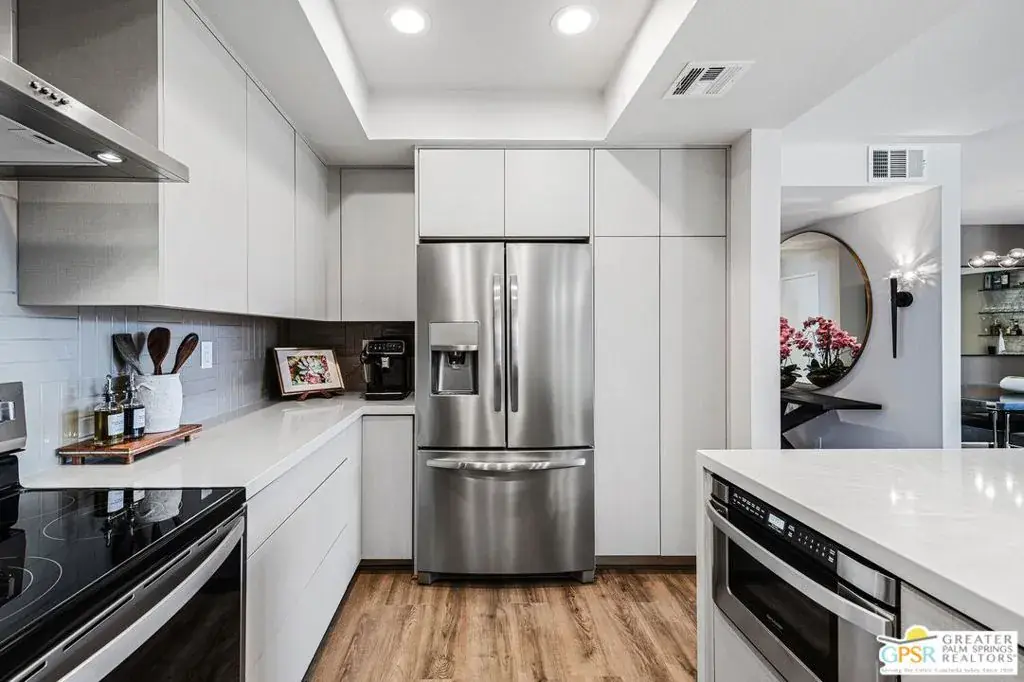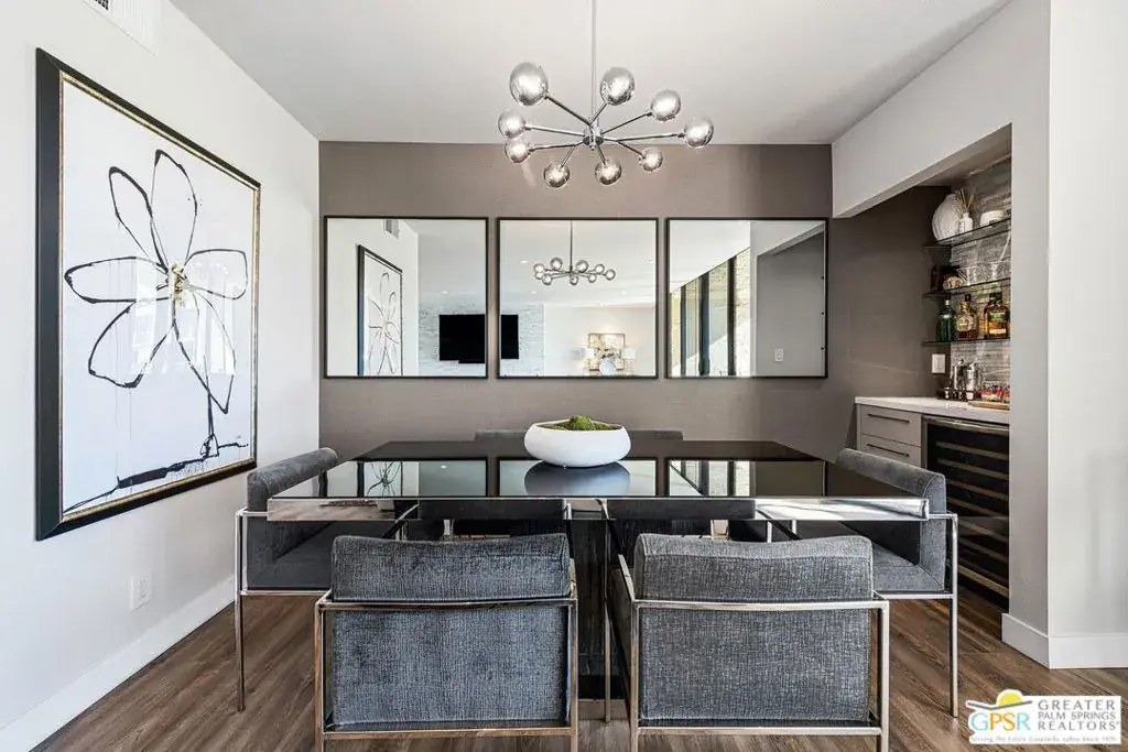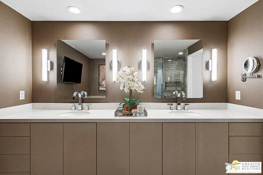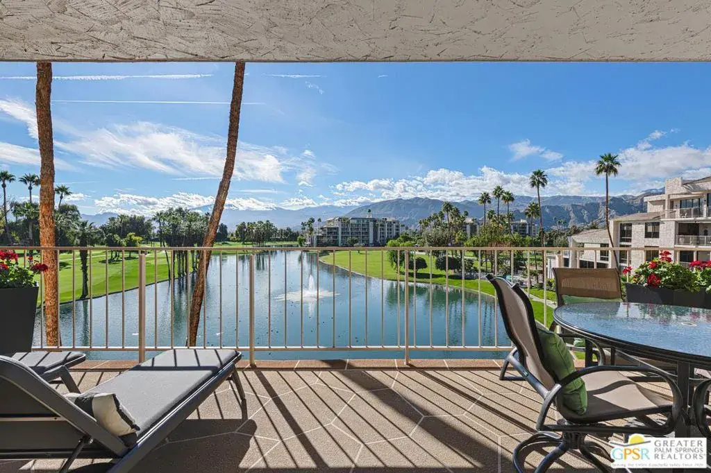 Beautifully renovated and impeccably styled, this residence at 910 Island Drive, Unit 410 offers quintessential Desert Island living with panoramic lake, golf course, and mountain views. Located within the prestigious 24-hour guard-gated Desert Island community in Rancho Mirage, this upper-level home blends modern design with resort-style comfort. A dramatic double-door entry opens to a light-filled interior featuring warm wood-tone flooring, recessed lighting, and a spacious open layout ideal for entertaining. The living room is anchored by a sleek stacked-stone fireplace and flows seamlessly into the dining area with a custom built-in bar perfect for hosting guests. Floor-to-ceiling glass frames tranquil water views and opens to a generous covered balcony, ideal for outdoor dining, relaxing, and enjoying desert sunsets over the lake and fairway. The remodeled kitchen showcases contemporary flat-panel cabinetry, quartz countertops, stainless steel appliances, designer tile backsplash, and a large peninsula with seating. The expansive primary suite offers stunning views, a sitting area, ceiling fan, and multiple closets, including a walk-in. The spa-like primary bath features a dual-sink vanity, modern lighting, a soaking tub, and a large walk-in shower with designer tile and rain shower head. A well-appointed guest bedroom and updated guest bath provide comfort and privacy for visitors. Additional features include a formal foyer, in-unit laundry room, tasteful finishes throughout, and a thoughtful floor plan that feels both open and refined. Desert Island amenities include lakes, lush landscaping, multiple pools and spas, fitness center, tennis and pickleball courts, clubhouse, and on-site management just minutes from shopping, dining, and Eisenhower Medical Center.