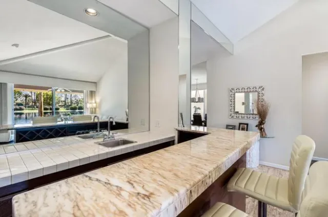 Now for lease — Season Rate $8,750 Oct-May. June- Sept $5,500. Arguably the best view in Lake Mirage. This lakefront condo offers stunning 180-degree unobstructed south and west mountain views with no condos across the lake, creating a truly open and private setting.This desirable single-level end unit features approximately 1,888 sq ft with an excellent floor plan. The spacious primary suite is separated from the guest bedrooms for privacy, and all three bedrooms include their own en-suite bathrooms. The living room offers a fireplace and wet bar, while the home also includes newer appliances, newer A/C, no carpet, and is offered fully furnished.Enjoy outdoor living on the expanded lakefront tiled patio with automatic awning and misters–perfect for relaxing while taking in the mountain and water views. Additional highlights include direct access from the attached two-car garage and abundant guest parking nearby.Residents of Lake Mirage enjoy resort-style amenities including two scenic lakes, 11 pools and spas, 9 tennis courts, pickleball courts, a 3-hole pitch-and-putt golf course, and a clubhouse with fitness center and recreation facilities.Ideally located near Eisenhower Health, shopping and dining along El Paseo Shopping District, and entertainment at McCallum Theatre. A rare opportunity to lease a premier lakefront home with exceptional views.