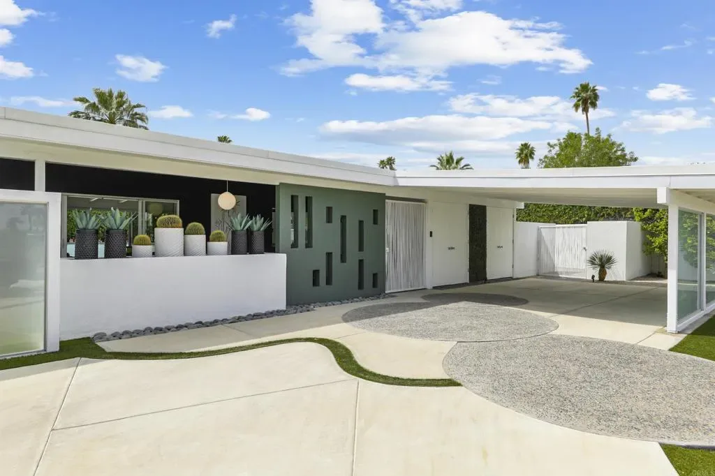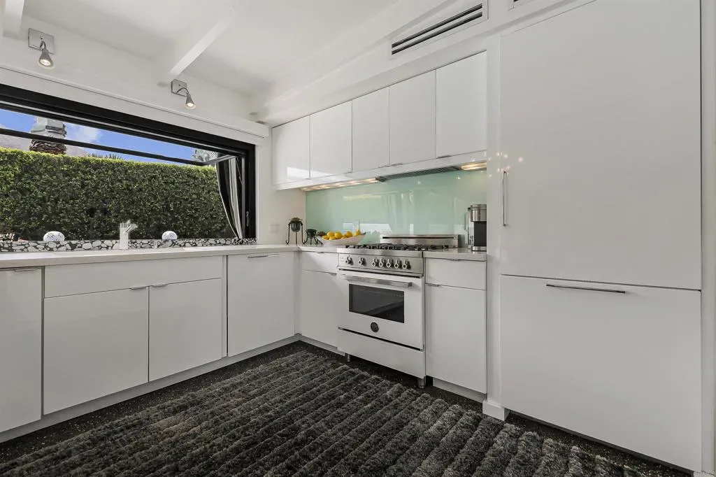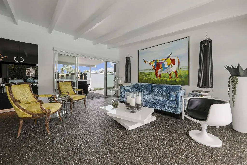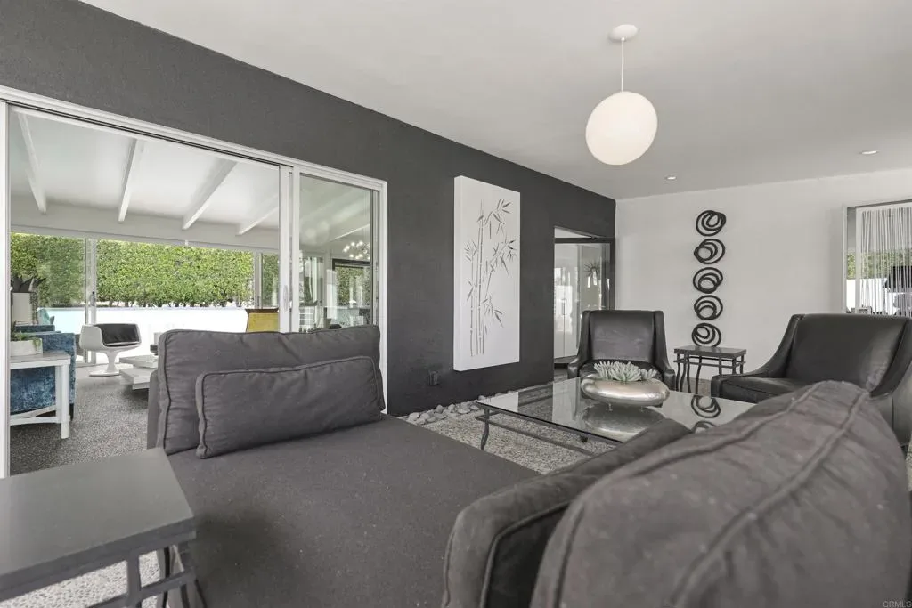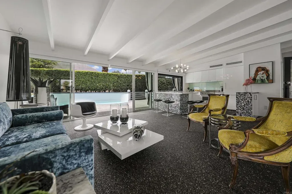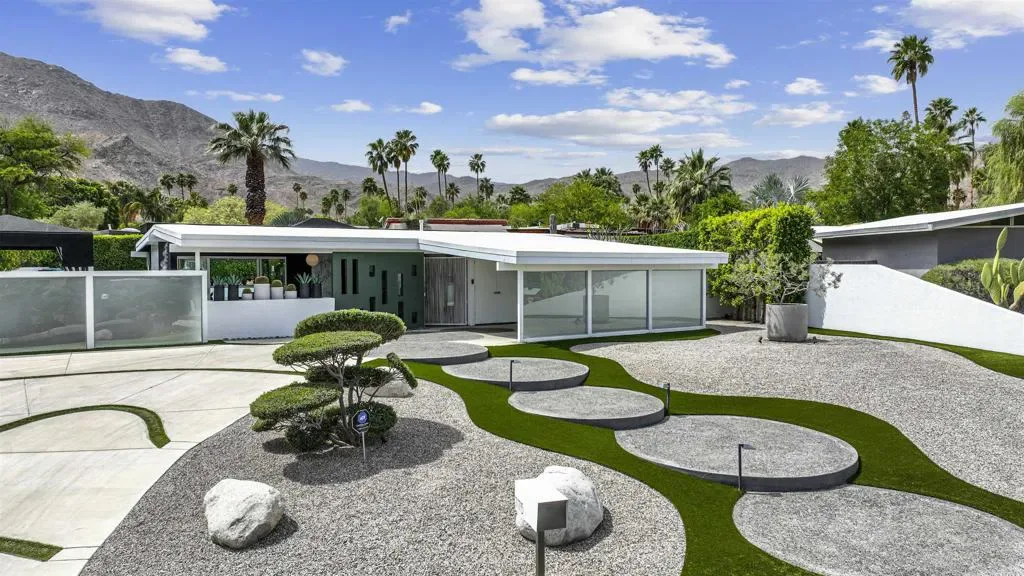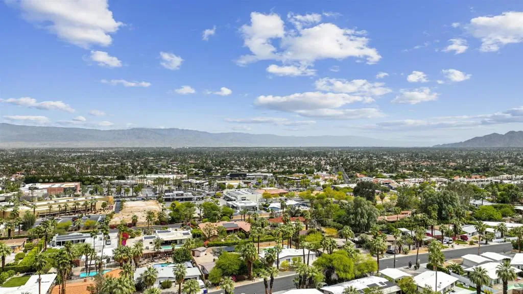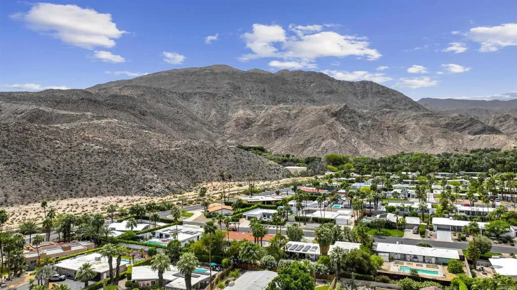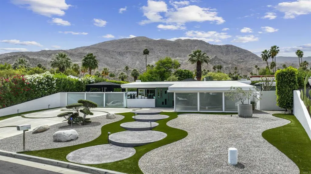 This beautifully reimagined 1956 mid-century residence in coveted Magnesia Falls Cove captures the essence of classic desert modernism with stunning mountain views. A striking arrival begins with custom gates, architectural entry walls, and curated desert landscaping, opening to a private courtyard that sets a serene, sophisticated tone. Inside, light-filled spaces and an open-concept floor plan create effortless flow for both everyday living and entertaining, seamlessly connecting to the outdoor retreat. The thoughtfully designed kitchen features Bertazzoni and Bosch appliances, quartz and marble surfaces, a mint glass backsplash, and a flip-up serving window for true indoor-outdoor living. Clean lines, custom built-ins, pebble-tech flooring, and a dramatic pivot entry door reflect a refined interpretation of mid-century design while offering modern comfort throughout. A detached bonus casita provides flexible space ideal for guests, a private office, or studio (not included in square footage). Furnishings are offered per inventory, creating a seamless turnkey desert retreat that allows buyers to move in and immediately enjoy the lifestyle this home provides. Outdoors, a classic kidney-shaped pool, outdoor shower, multiple lounge areas, and a cozy fireplace create a private resort-like setting, all perfectly positioned to take in breathtaking mountain vistas. Just minutes from the shopping and dining of El Paseo Shopping District, as well as world-class golf, this exceptional property offers a rare opportunity to own a true desert retreat where style, privacy, and location converge.