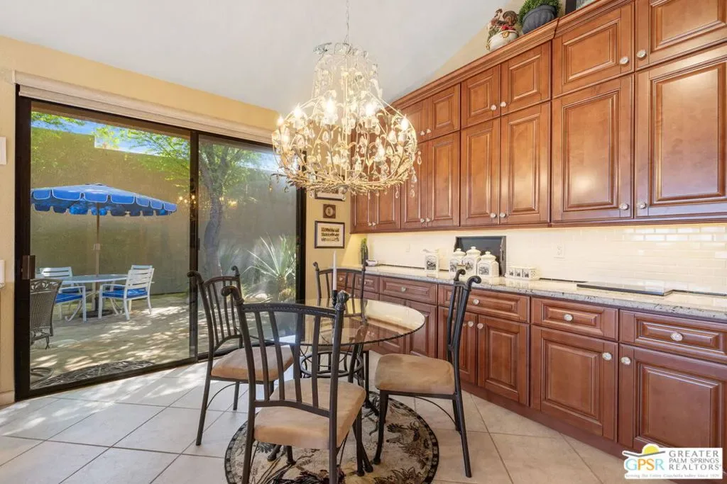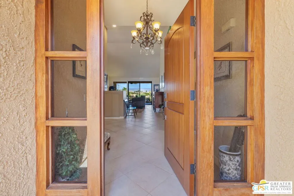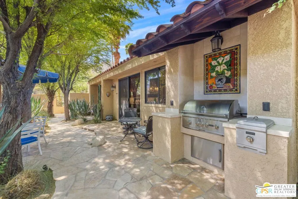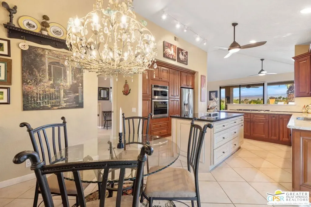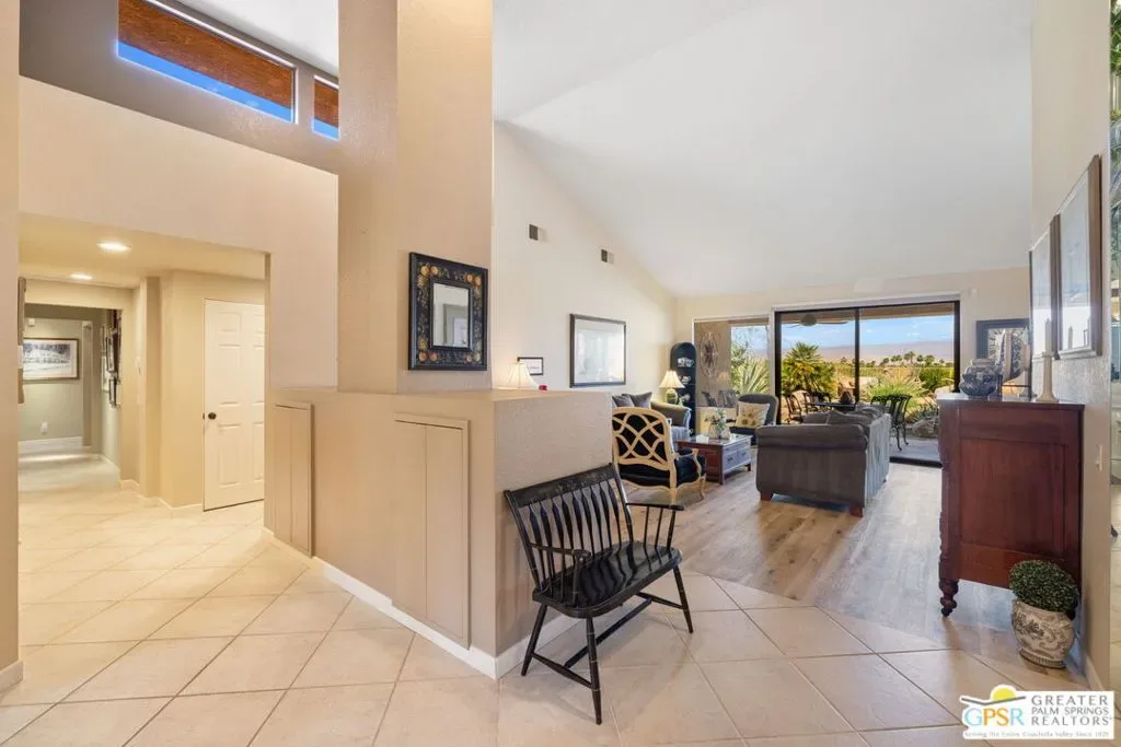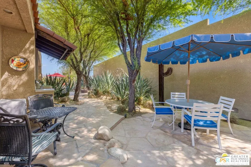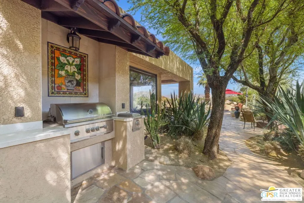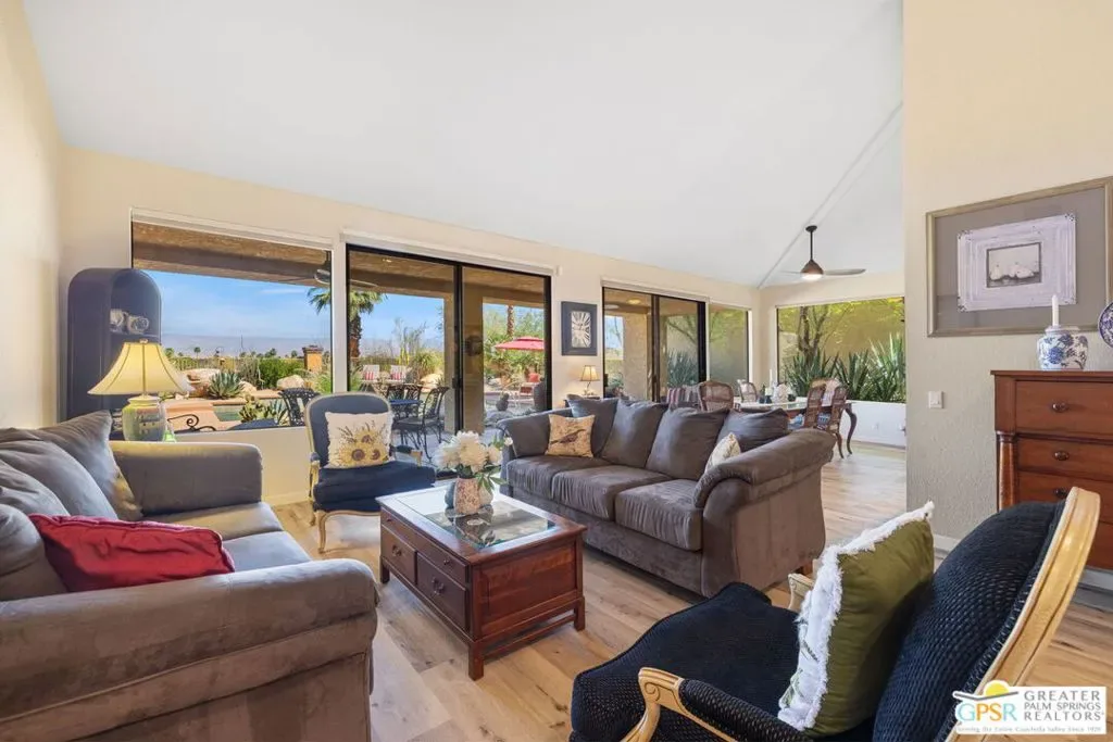 ELEVATED views. WIDE OPEN skies. FABULOUS Rancho Mirage living. Set within the private gated enclave of Mirage Cove, this 5 bedroom, 3 bath residence delivers unobstructed mountain and valley vistas from a prized end of cul de sac setting, notable for its flat lot and just one immediate neighbor. A true sense of arrival begins at the gated courtyard and custom Brazilian mahogany front door. Inside, vaulted ceilings and a dramatic fireplace set the tone in the living room, while clerestory windows frame the space and a series of sliders open to covered patio, pool terrace, and multiple outdoor conversation areas designed for relaxed desert living. The gourmet kitchen with oversized island opens to a dining area with wet bar and wine fridge on one side and a breakfast area with built in buffet on the other, plus direct access to a side patio with barbecue. Bedrooms are nicely separated, creating the feel of two primary suites on opposite ends of the home. The main primary suite opens to the pool terrace and features a walk in closet and separate tub and bath. Junior Ensuite 2 enjoys vaulted ceilings, an oversized walk in closet, and a private bath with separate tub and shower. Guest bedrooms 3 and 4 are positioned together and share a full bath with skylight, with bedroom 3 opening to its own private patio, while bedroom 5 currently serves as a den. Direct garage access adds convenience, and a utility room is thoughtfully positioned off the central hall. Pride of ownership is felt throughout and OWNED SOLAR adds to the appeal. Mirage Cove, with just 69 homes, offers a rare blend of privacy and amenities including pools, tennis, and pickleball, all in a peaceful mountainside setting.