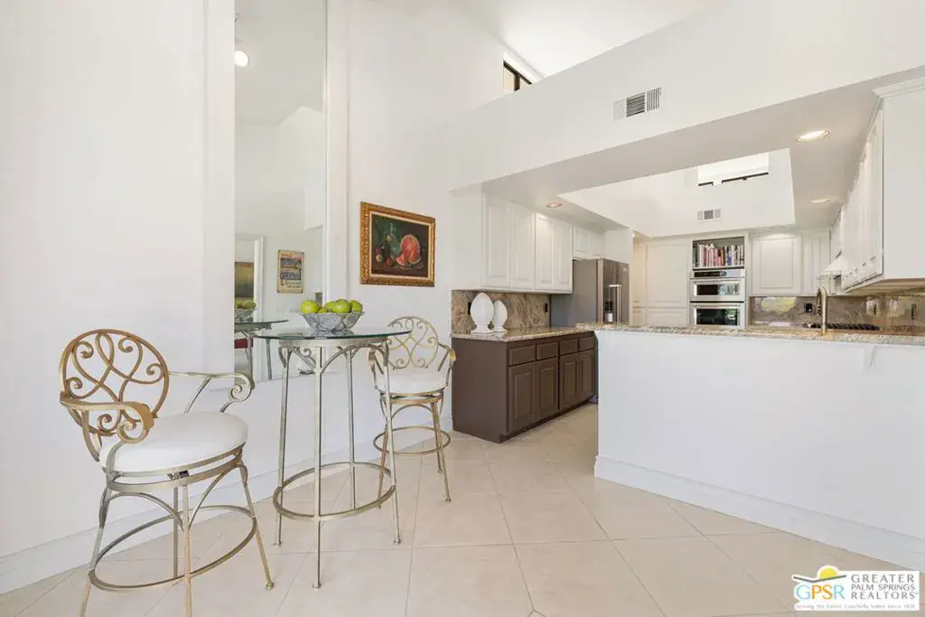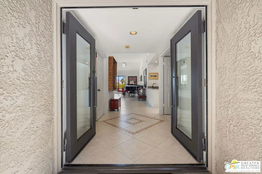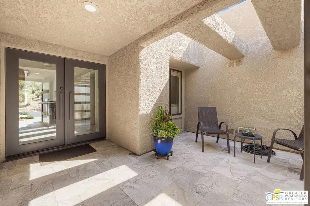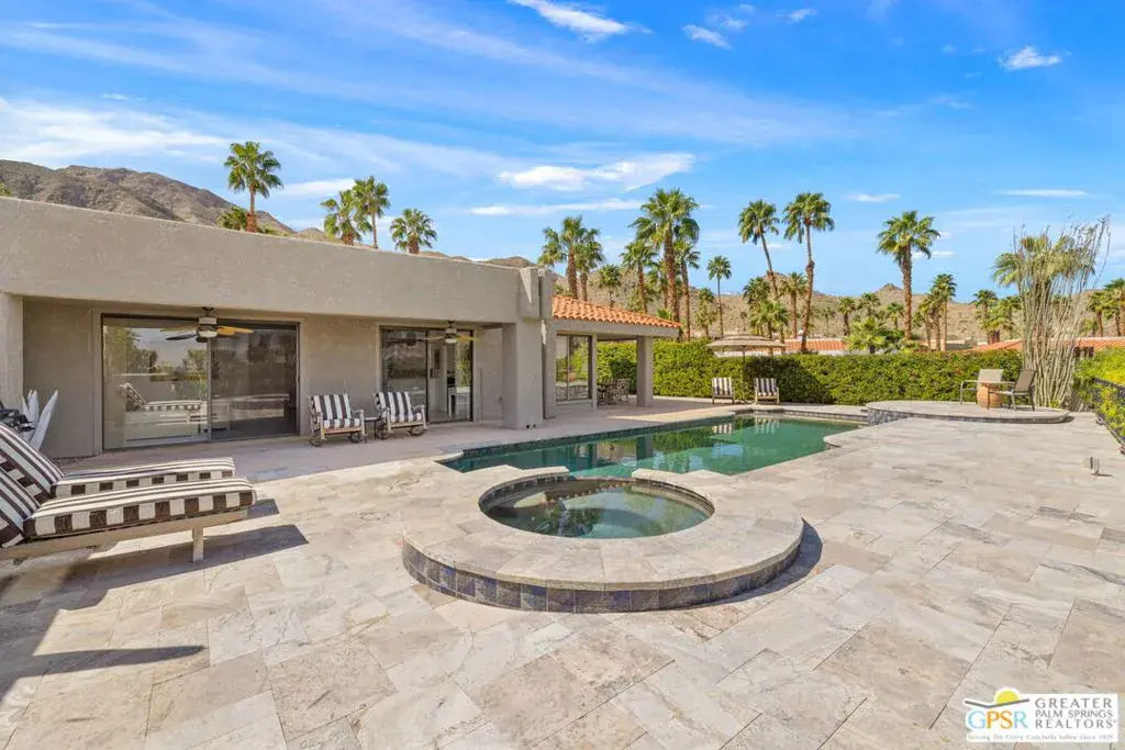 Perched above the valley floor in the private gated enclave of Mirage Cove, this 3 bedroom, 3 bath detached residence captures unobstructed mountain and valley views from a prized corner lot setting. With just 69 single-family homes, Mirage Cove offers a rare combination of privacy and on-site amenities including swimming, tennis, and pickleball – an ideal retreat for those who value both serenity and community. A private south-facing courtyard sets the stage for arrival before double doors open to a light-filled living space defined by vaulted ceilings, floor-to-ceiling glass, a gas fireplace, and a wet bar. Expansive sliders connect the living and dining areas to a covered patio and a generous backyard designed for indoor/outdoor living. The pool and in-ground spa are positioned to maximize sweeping views of the valley floor and surrounding mountains – an ideal vantage point for relaxing evenings and even the occasional sighting of Big Horn sheep across the hillside terrain. The separate kitchen features clerestory windows, granite countertops, abundant cabinetry, and a casual dining area, with direct access to the outdoor entertaining spaces. The Primary Suite enjoys mountain views, patio access, and a spa-inspired bath with dual vanities, soaking tub, walk-in shower, and walk-in closet. Junior Ensuite Two is privately positioned on the opposite side of the home with its own patio, dual vanities, soaking tub, and walk-in shower. Junior Ensuite Three also captures views and offers convenient access to a bath with shower/tub combination. Additional highlights include an inside laundry room, attached two-car garage, and rare RV parking – an exceptional feature in this setting. A private hillside retreat with scale, views, and lifestyle that is minutes from the heart of Rancho Mirage.