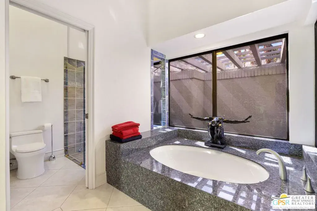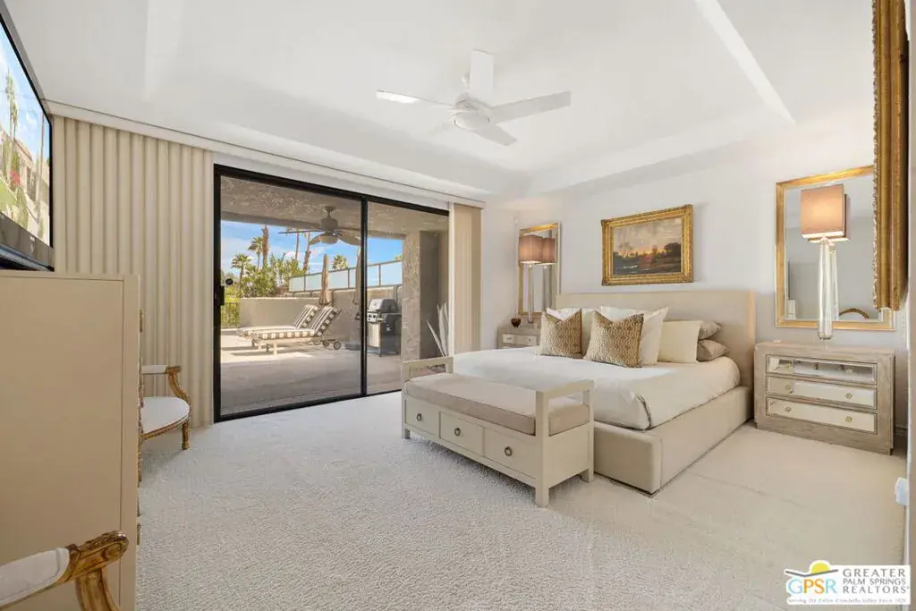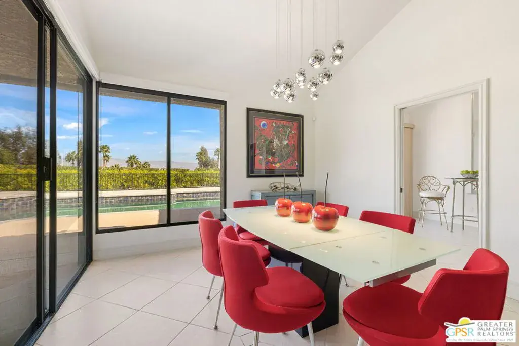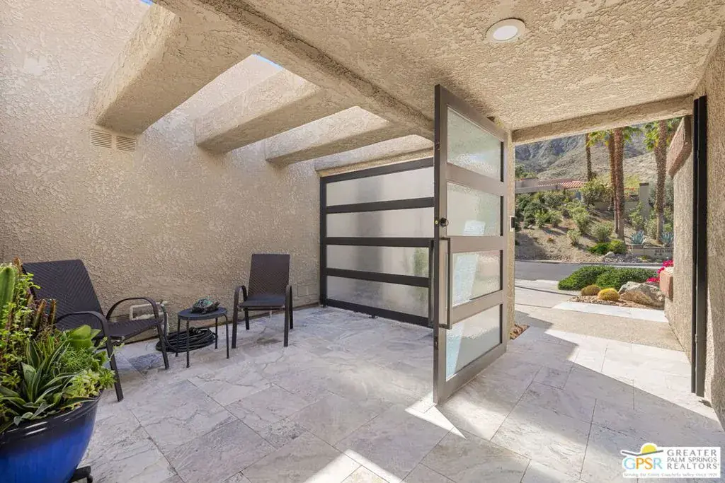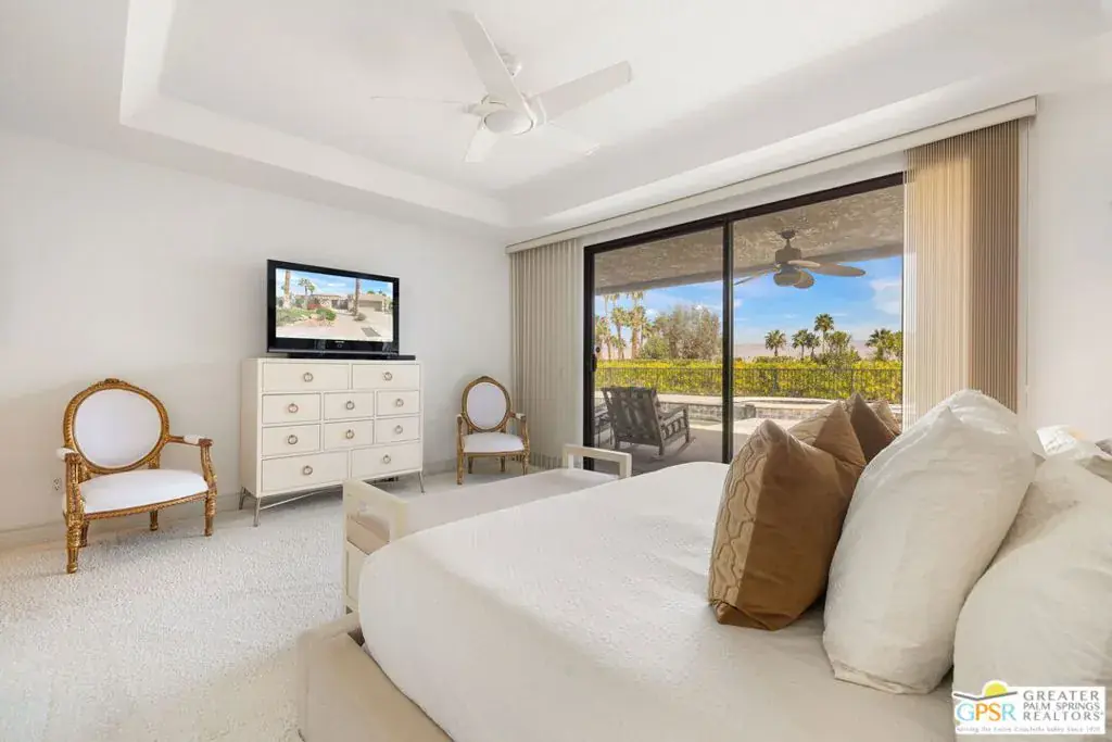 Perched above the valley floor in the private gated enclave of Mirage Cove, this 3 bedroom, 3 bath detached residence captures unobstructed mountain and valley views from a prized corner lot setting. With just 69 single-family homes, Mirage Cove offers a rare combination of privacy and on-site amenities including swimming, tennis, and pickleball – an ideal retreat for those who value both serenity and community. A private south-facing courtyard sets the stage for arrival before double doors open to a light-filled living space defined by vaulted ceilings, floor-to-ceiling glass, a gas fireplace, and a wet bar. Expansive sliders connect the living and dining areas to a covered patio and a generous backyard designed for indoor/outdoor living. The pool and in-ground spa are positioned to maximize sweeping views of the valley floor and surrounding mountains – an ideal vantage point for relaxing evenings and even the occasional sighting of Big Horn sheep across the hillside terrain. The separate kitchen features clerestory windows, granite countertops, abundant cabinetry, and a casual dining area, with direct access to the outdoor entertaining spaces. The Primary Suite enjoys mountain views, patio access, and a spa-inspired bath with dual vanities, soaking tub, walk-in shower, and walk-in closet. Junior Ensuite Two is privately positioned on the opposite side of the home with its own patio, dual vanities, soaking tub, and walk-in shower. Junior Ensuite Three also captures views and offers convenient access to a bath with shower/tub combination. Additional highlights include an inside laundry room, attached two-car garage, and rare RV parking – an exceptional feature in this setting. A private hillside retreat with scale, views, and lifestyle that is minutes from the heart of Rancho Mirage.