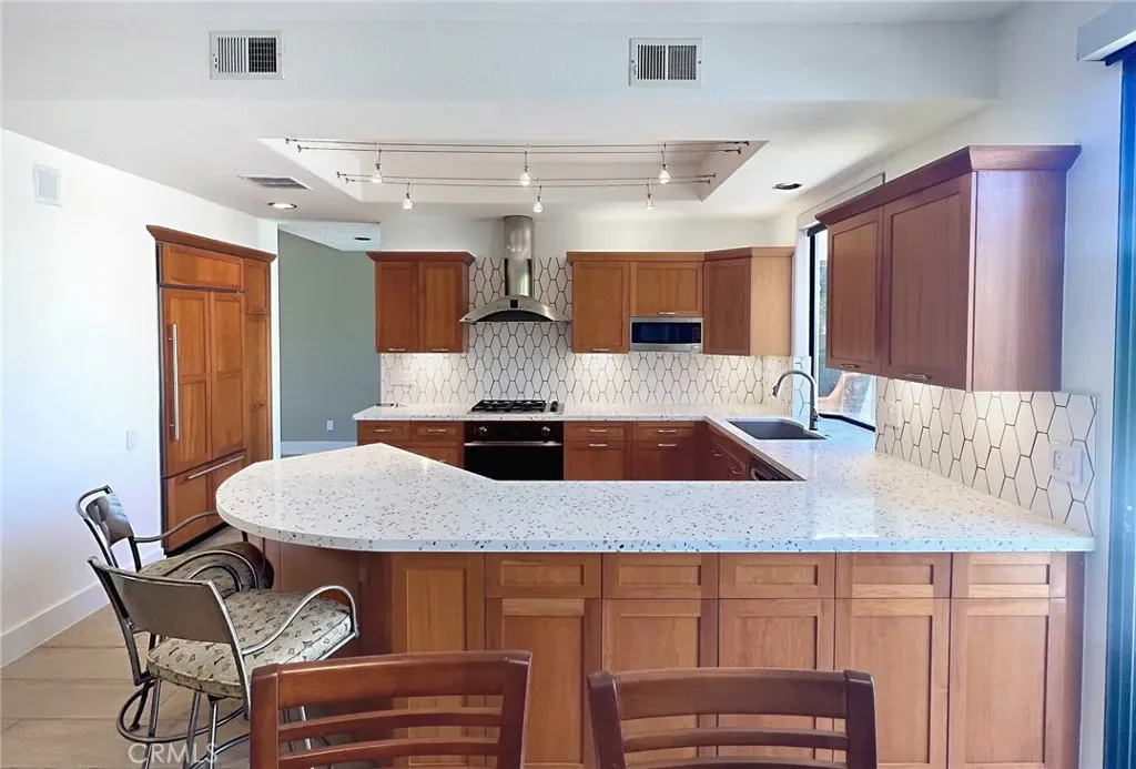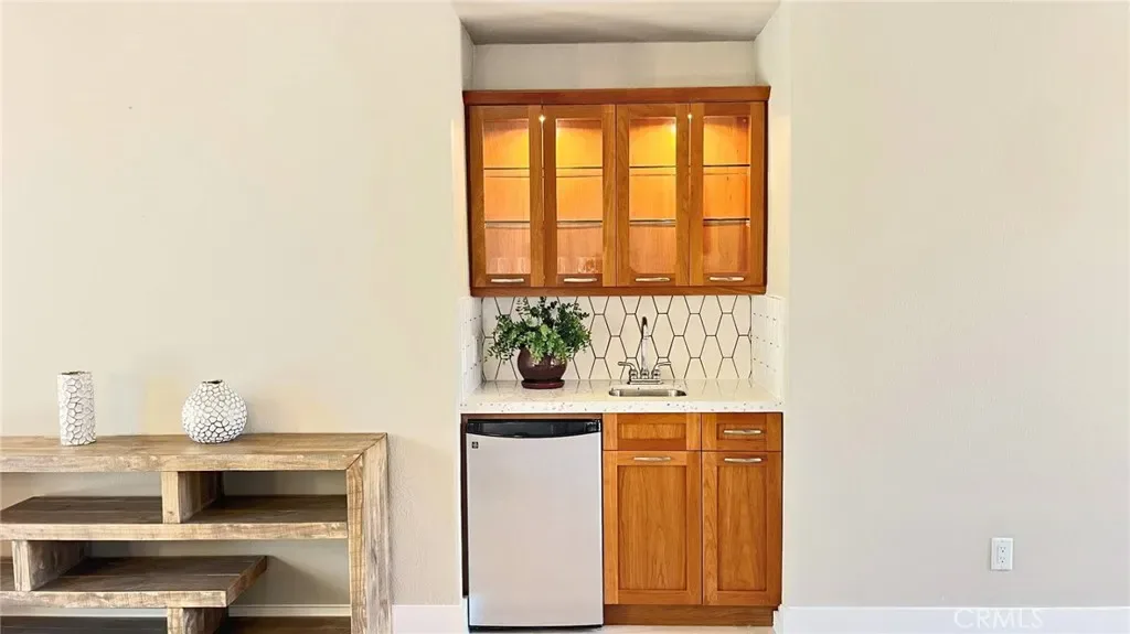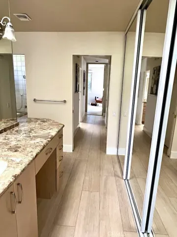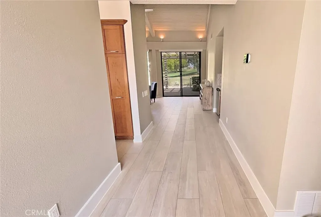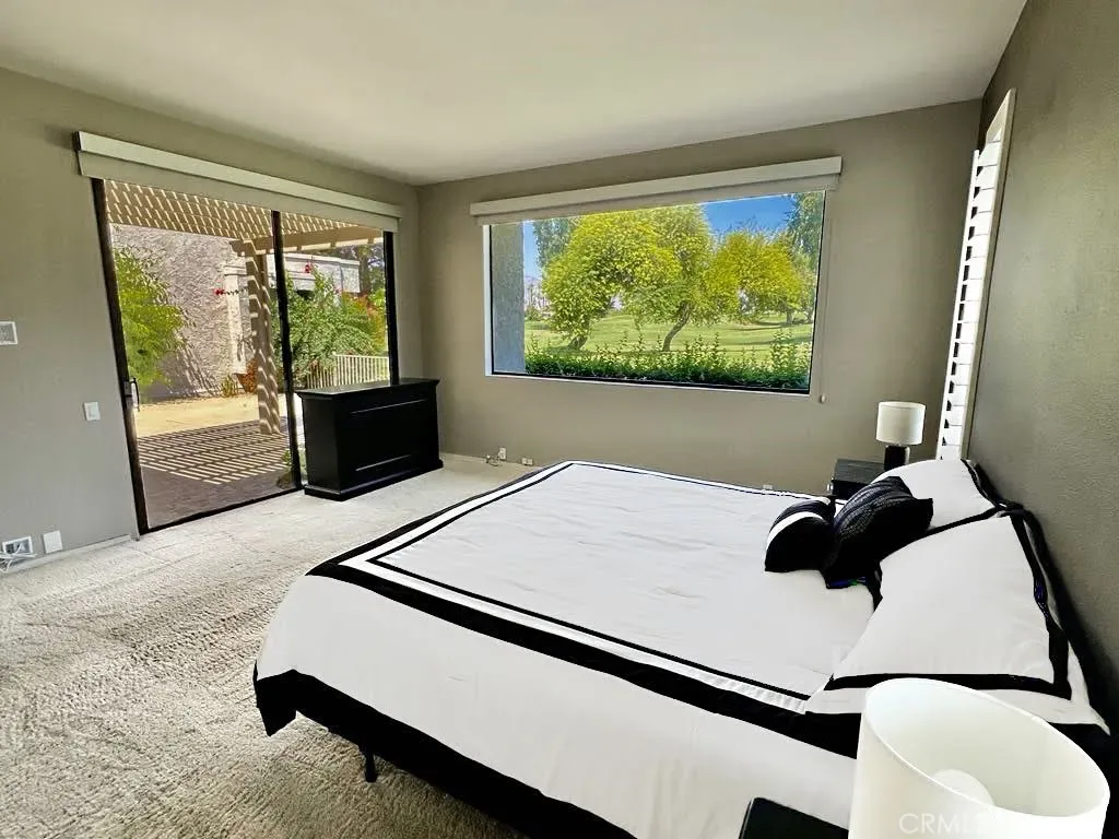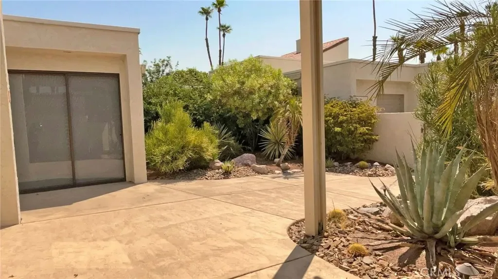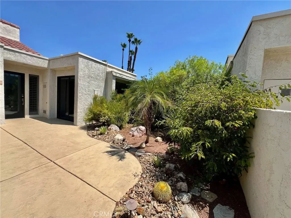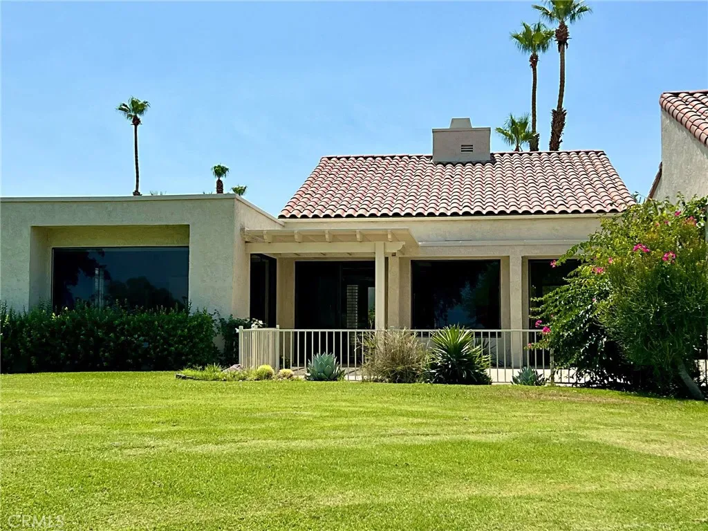 Quietly tucked away on a cul-de-sac within Mission Hills Country Club, this two bed/two full bath condo offers an abundance of upgrades. A private luxury getaway with peek-a-boo mountain views and uninterrupted vistas of the famed Dinah Shore course. Inside the gated front courtyard enjoy a professionally landscaped desert oasis. The interior features updated wood-look ceramic flooring and high-gloss 6” real wood trim. A newly remodeled open kitchen with stunning quartz countertops and modern tile backsplash, new double sink with touch on/off faucet, dimmable LED lighting, plus a 42” sub-zero paneled refrigerator, Dacor gas cooktop and new Samsung Flex Duo oven – its two separate ovens in one. Living room has a matching wet bar area with sink and mini fridge. A slider opens off the dining area to the courtyard for morning coffee. New Hunter Douglas smart powered designer roller shades in main living, dining and kitchen areas and blackout shades in bedrooms. Thoughtful upgrades and contemporary finishes can be found throughout. Generous master suite has amazing views and a spa bath featuring custom dual marble-top vanities (extra tall for the Gents) and a large tub/shower. Guest bedroom and bath have consistent highly upgraded finishes, lighting and closet organizers. A large, fenced rear patio offers late afternoon shade and plenty of entertaining space along with fabulous views of hole #11, all safely outside the range of an errant golfer. For energy savings year round, the unit has a new Lennox 28 SEER HVAC system. The most energy efficient AC unit available anywhere. Large two car + golf cart garage has built-in storage. Community pool and spa nearby. No steps or stairs. Updated 2121 land lease is paid. HOA road resurfaced in fall of 2024. Near shopping (6 minutes to Costco), dining, Eisenhower Hospital & the new Disney Cotino development. Mission Hills Country Club offers three championship golf courses, expansive clubhouse, restaurants, fitness center, tennis, pickleball, croquet and bocci. Membership required. Furnishings are available.
