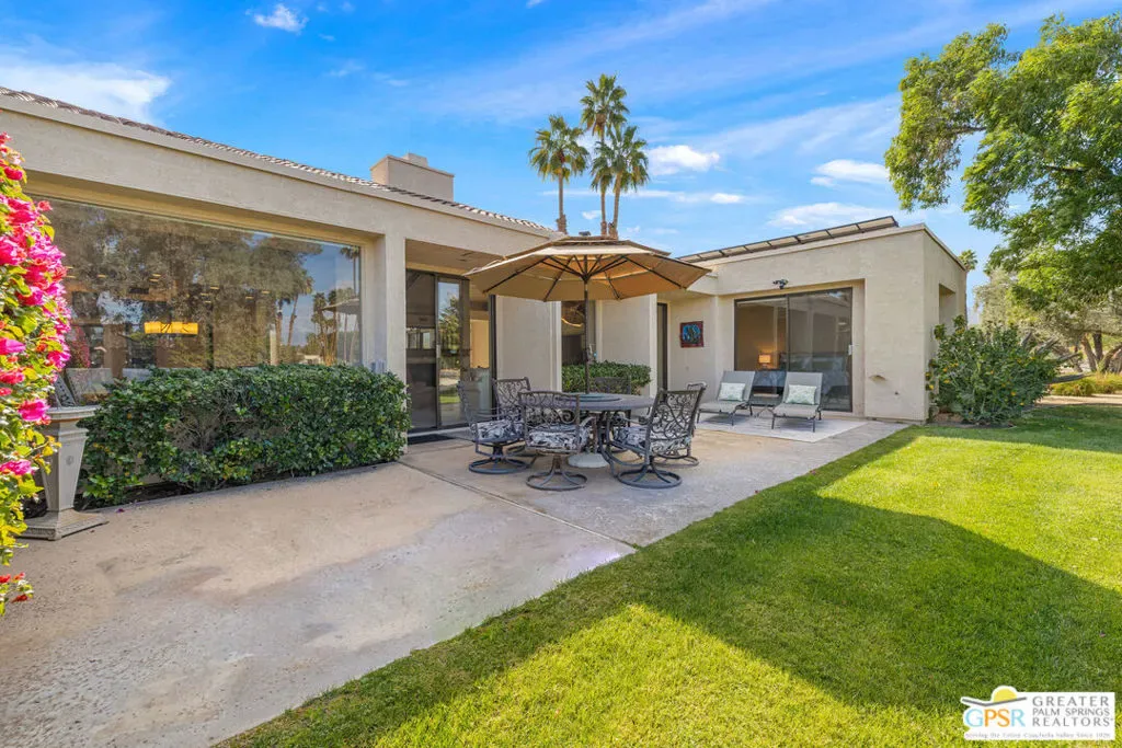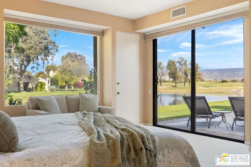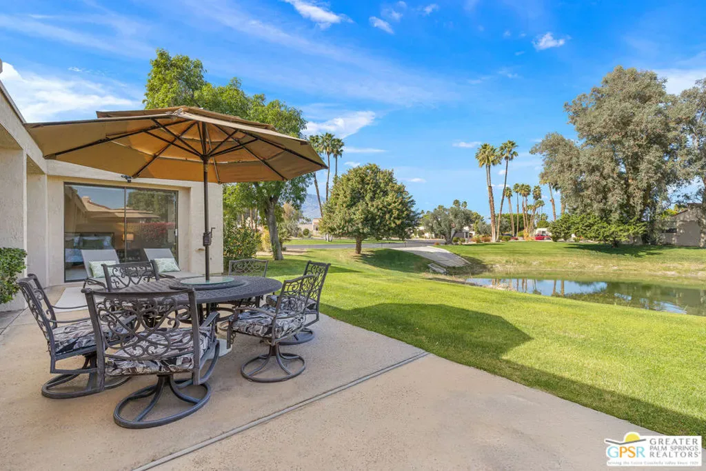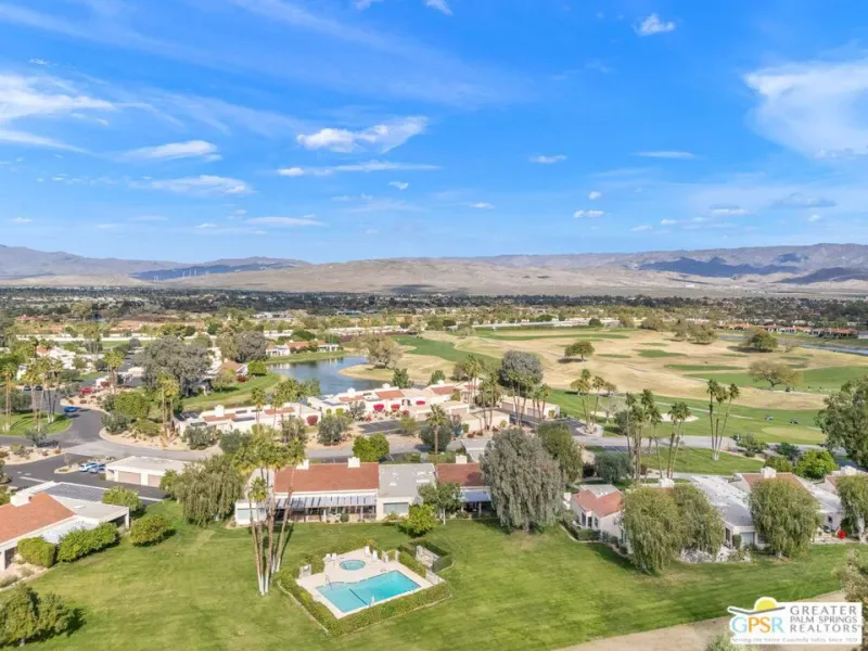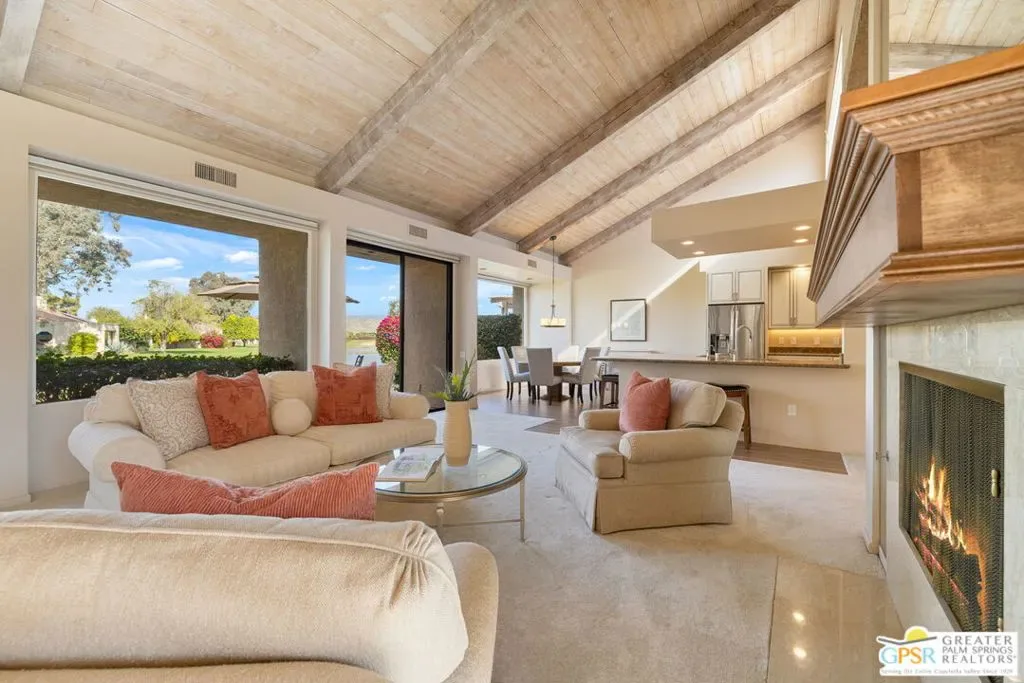Location truly sets this one apart. Ideally positioned near the clubhouse at Mission Hills Country Club, this single-level, single-story 3 bedroom, 3 bathroom furnished condo captures panoramic lake, fairway, and mountain views across to the Pete Dye Course. Spanning approximately 2,400 square feet, the upgraded residence is thoughtfully designed to embrace its surroundings, with expansive windows and sliding glass doors creating seamless indoor-outdoor living. The main living area is both dramatic and inviting, highlighted by a vaulted wood-beam ceiling, gas fireplace, and open sightlines that frame the scenic backdrop. The open kitchen has been updated and features a clerestory window, counter seating, and an adjacent dining area filled with natural light ideal for everyday living and entertaining. The bedroom layout offers excellent separation and privacy. The Primary Ensuite includes a retreat area, direct patio access, sweeping views, and a private bath with dual vanities, expansive closet space, and both tub and shower. Junior Ensuite Two opens to the courtyard and enjoys its own full bath, while Bedroom Three is privately positioned on the opposite side of the condo with an adjacent bath and courtyard access – perfect for guests or flexible use. Additional highlights include rooftop solar, a two-car garage with attached golf cart storage, and close proximity to the community pool and spa as well as the member clubhouse.