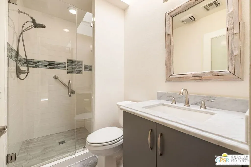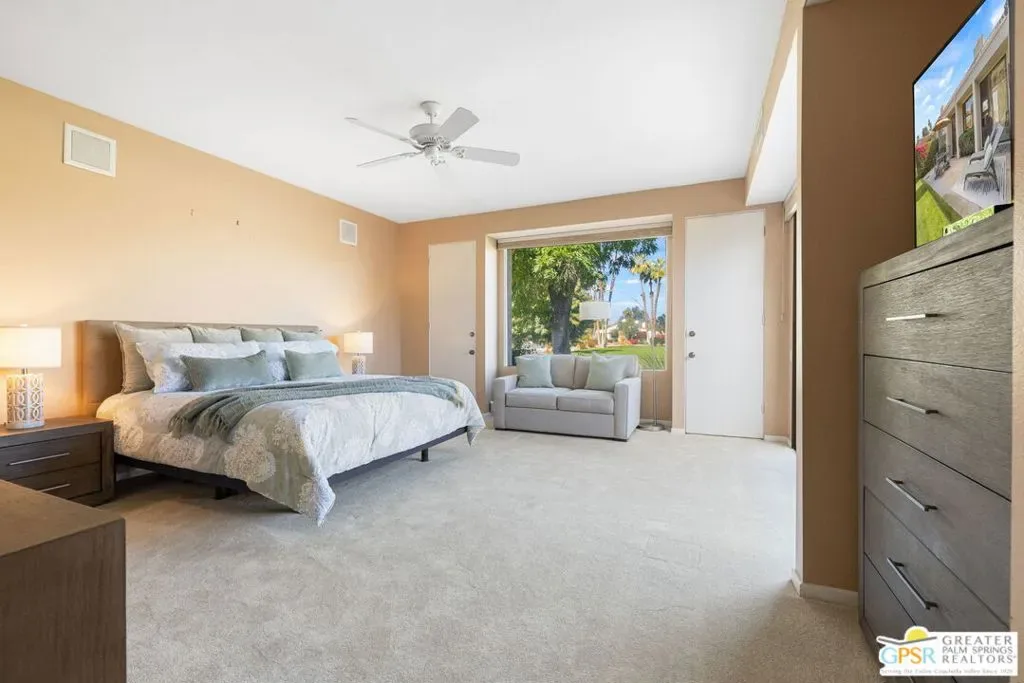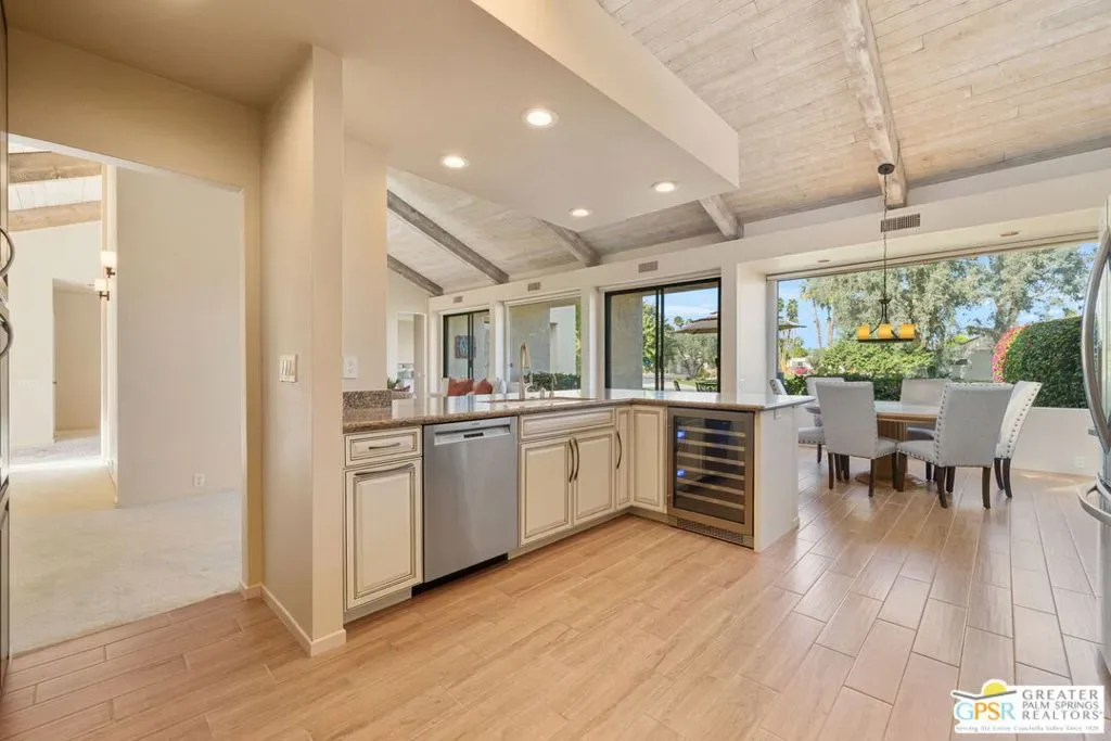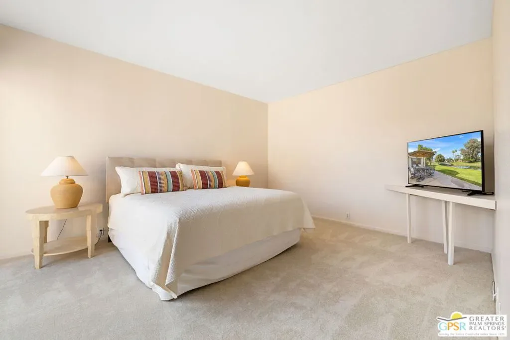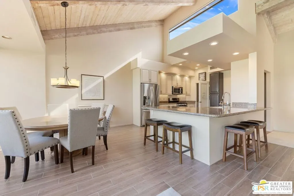Location truly sets this one apart. Ideally positioned near the clubhouse at Mission Hills Country Club, this single-level, single-story 3 bedroom, 3 bathroom furnished condo captures panoramic lake, fairway, and mountain views across to the Pete Dye Course. Spanning approximately 2,400 square feet, the upgraded residence is thoughtfully designed to embrace its surroundings, with expansive windows and sliding glass doors creating seamless indoor-outdoor living. The main living area is both dramatic and inviting, highlighted by a vaulted wood-beam ceiling, gas fireplace, and open sightlines that frame the scenic backdrop. The open kitchen has been updated and features a clerestory window, counter seating, and an adjacent dining area filled with natural light ideal for everyday living and entertaining. The bedroom layout offers excellent separation and privacy. The Primary Ensuite includes a retreat area, direct patio access, sweeping views, and a private bath with dual vanities, expansive closet space, and both tub and shower. Junior Ensuite Two opens to the courtyard and enjoys its own full bath, while Bedroom Three is privately positioned on the opposite side of the condo with an adjacent bath and courtyard access – perfect for guests or flexible use. Additional highlights include rooftop solar, a two-car garage with attached golf cart storage, and close proximity to the community pool and spa as well as the member clubhouse.