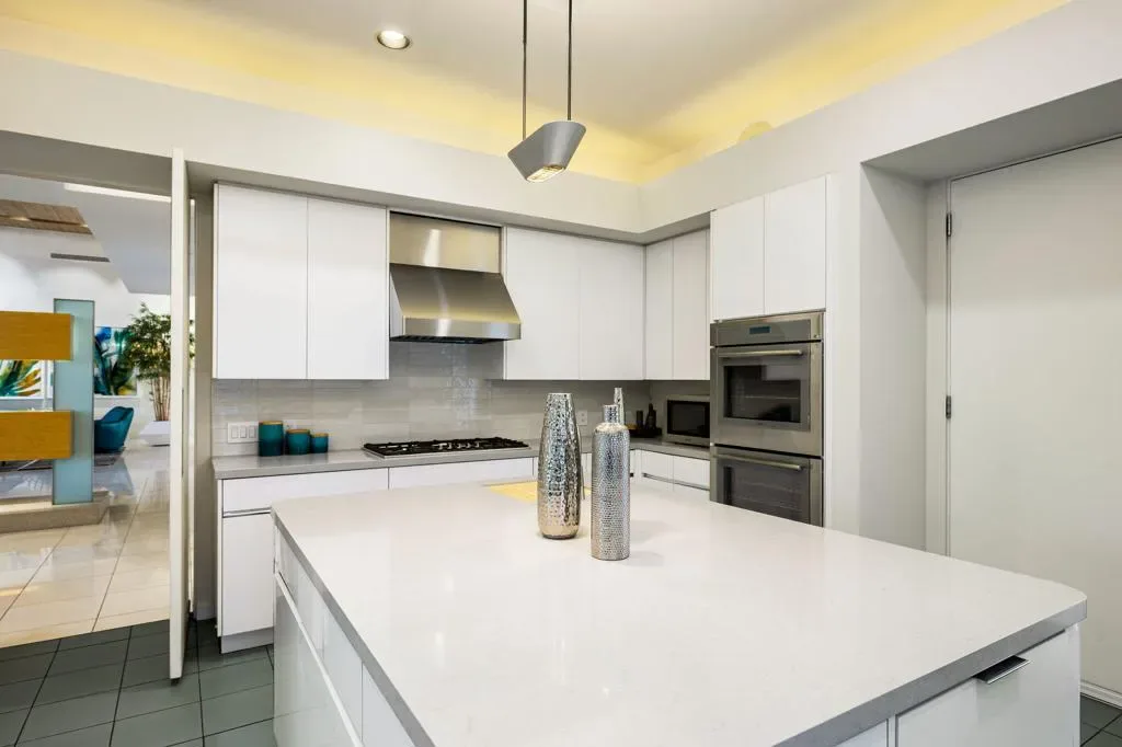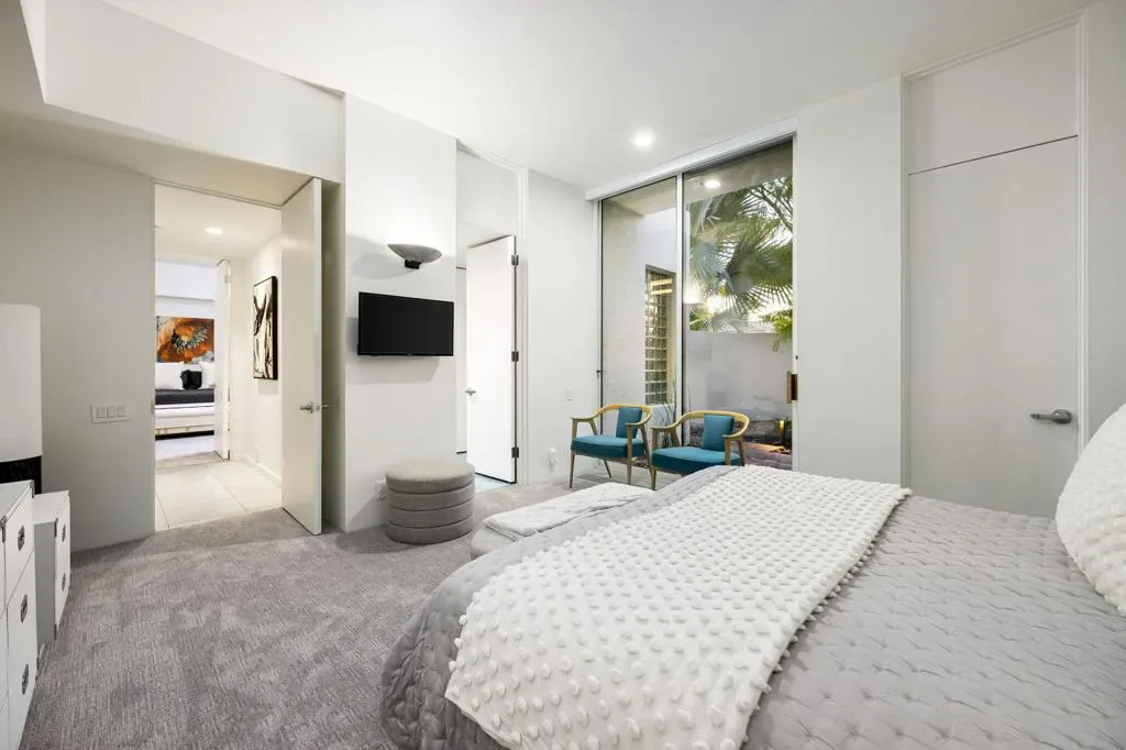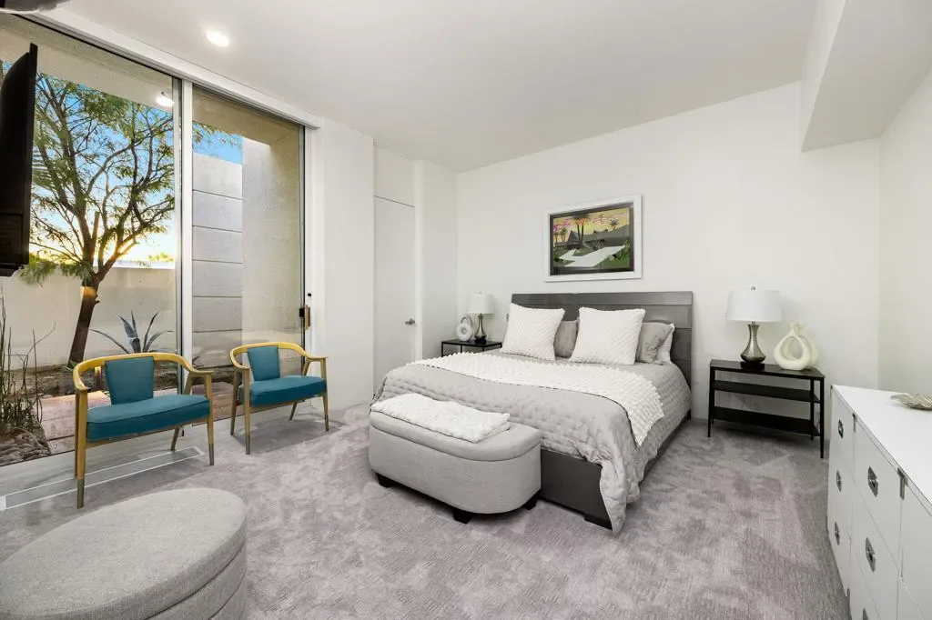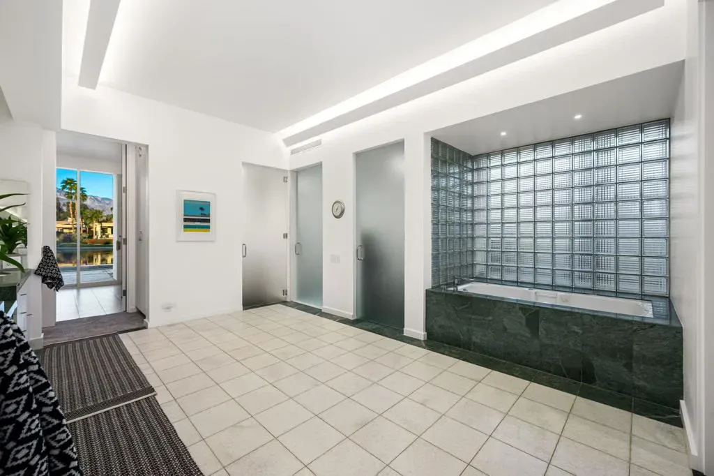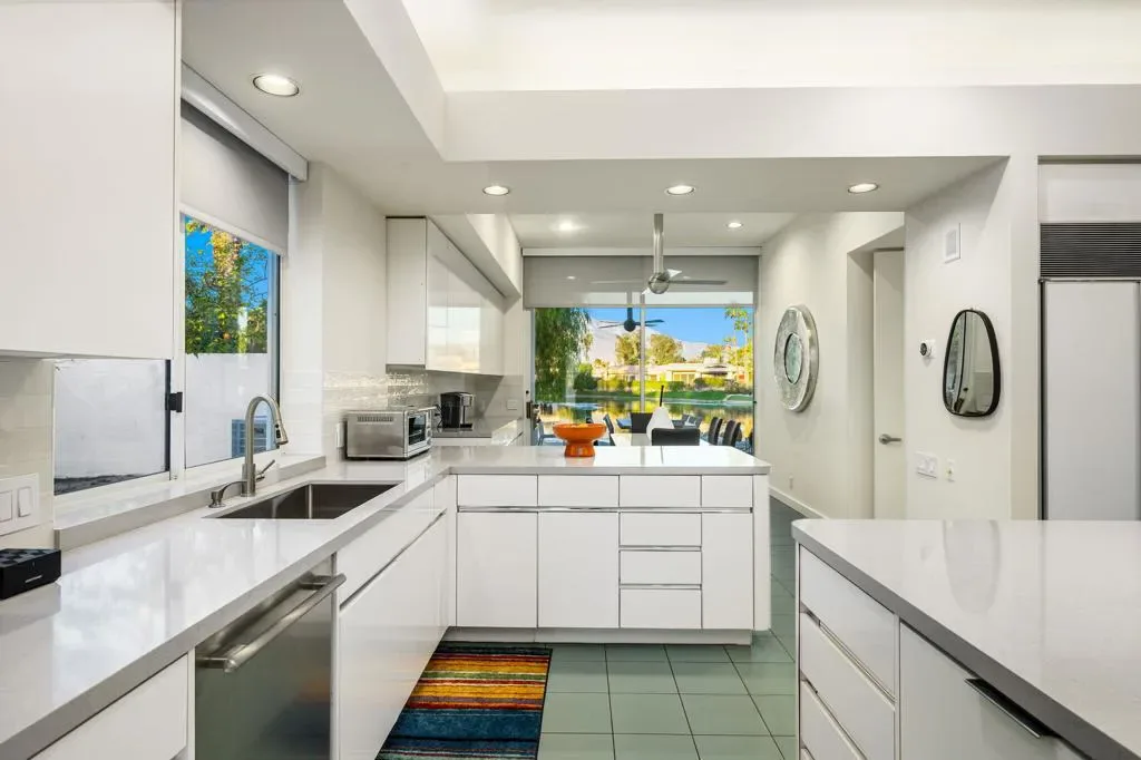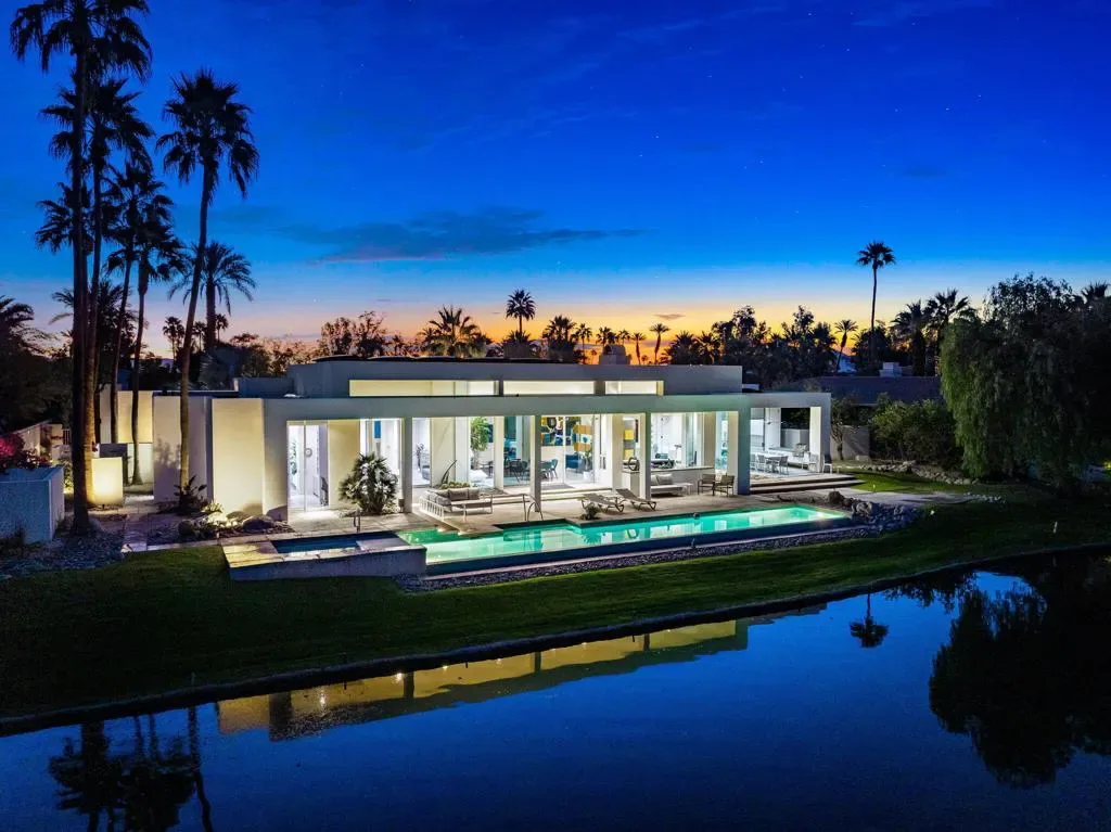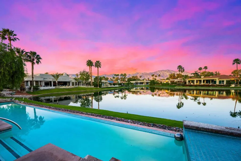Custom Contemporary with Stunning Architecture by Holden and Johnson, Premier Location in Fairway Estates with Spectacular Lakefront and Southwest Mountain Views. Enter through a circular driveway to gated courtyard with custom desert landscaping and double glass door entry. Bespoke finishing with stone tile flooring, wood ceilings, granite accents and walls of glass. Open Great Room features a double sided fireplace separating spaces for living and dining as well as a custom dining buffet and an entertainers bar with those stunning views. Updated Open Kitchen and Morning Room are light and bright with white cabinetry, quartz countertops and island, Subzero Refrigerator and newer Thermador stainless appliances all overlooking the lake and mountain views. Media Room/Den off of Great Room provides a great space for movie nights or an office. Primary Bedroom suite includes stunning views overlooking the pool terrace, lake and mountains,, Updated Spa Bathroom with Dual Vanities, toilets and walk-in closets as well as beautiful tiled shower and spa bath. A gym/ office overlooking the lake could serve as an overflow 4th bedroom. A separate wing of the house features a stunning architectural hallway leading to 2 guest suites, each with ensuite bath, walk-in closet and a patio for guests to enjoy desert outdoor living. Outside are multiple terraces including covered outdoor dining terrace with Built-in BBQ and Poolside and Lakeside Terraces as well as a swimmer’s pool and spa. Solar Powered, Control 4 Smart Lighting System, Automatic Shades and 3 full car garage. Most furniture negotiable. It’s all here for you to enjoy the desert lifestyle with taste and sophistication at a great price – oome home to your own desert retreat!