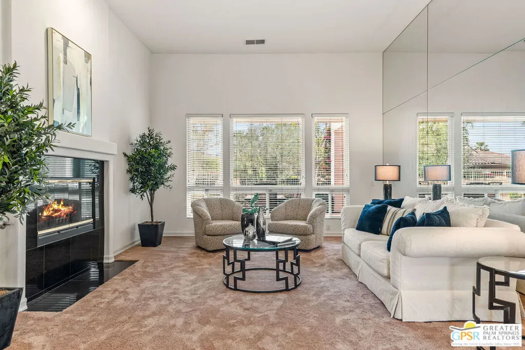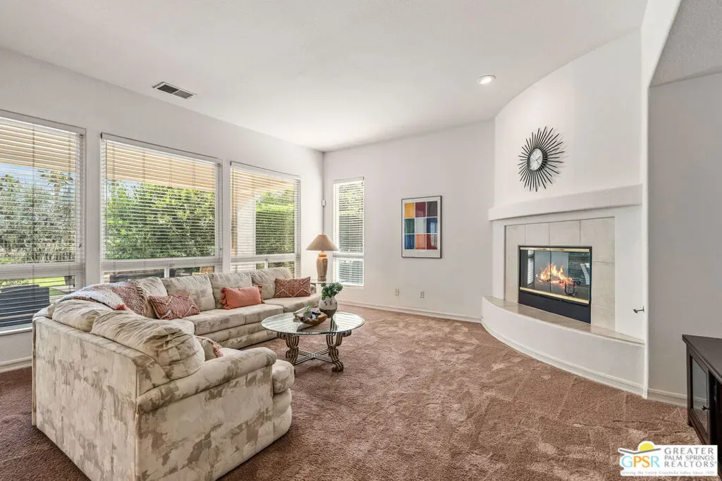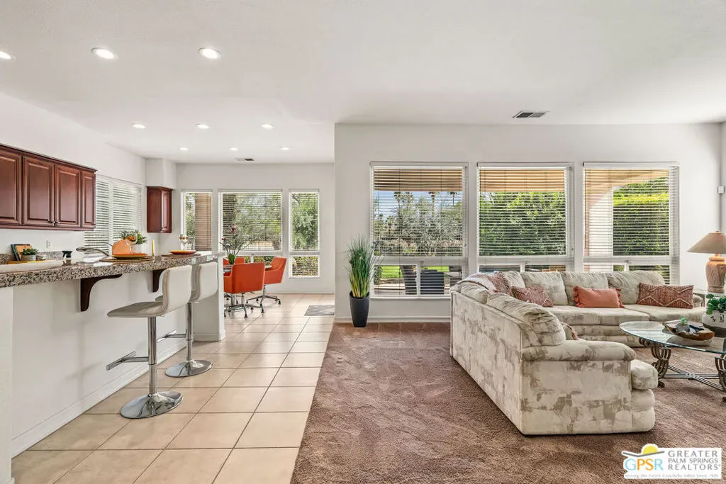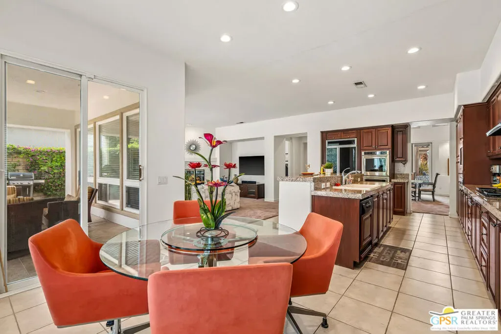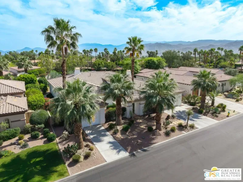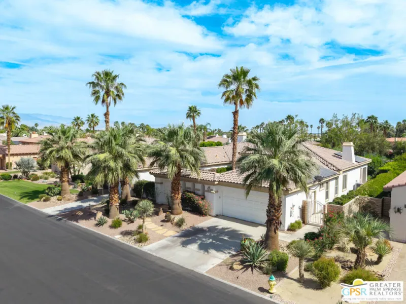 Located within the exclusive, 24-hour guard-gated Oakmont Estates at Mission Hills Country Club, this 3,582-square-foot Spanish-style residence offers a premier desert lifestyle on a spacious lot, 3 bedrooms, 3.5 baths, den/office, family room, on Fee land (no land lease) Low HOA’s. Designed for both entertaining and comfortable everyday living, featuring high 9-foot+ ceilings, clerestory windows, and elegant ceramic tile. Living Areas: A spacious floor plan including a formal living room with a fireplace, a formal dining room, and a separate study or media room, Chef’s Kitchen: Features a large center island, breakfast counter/bar, and a separate breakfast room that opens into a spacious great room. The Primary Suite: with dual walk-in closets, a large soaking tub, a separate shower, and private access to the patio and gardens. Guest Accommodations: Two additional en-suite bedrooms provide privacy and comfort for visitors. Bonus Features: A built-in wet bar, dual-glazed windows, and a high-efficiency dual HVAC system, lease solar system, 2 car garage and 1 car golf cart garage. Exterior: a covered concrete patio, lush landscaping, and a fenced yard. The Mission Hills Country Club Amenities offer Three championship golf courses (Dinah Shore Tournament, Arnold Palmer, and Pete Dye Challenge). A 17,000 sq. ft. Spa and Sports Center with a fitness complex and pool. One of the top racquet facilities in the U.S. (Tennis, Pickleball, and Croquet). A massive 55,000 sq. ft. clubhouse with mountain views. Located conveniently located near the Inverness gate, providing quick access to Eisenhower Medical Center, El Paseo shopping, Palm Springs, and the Palm Springs International Airport.