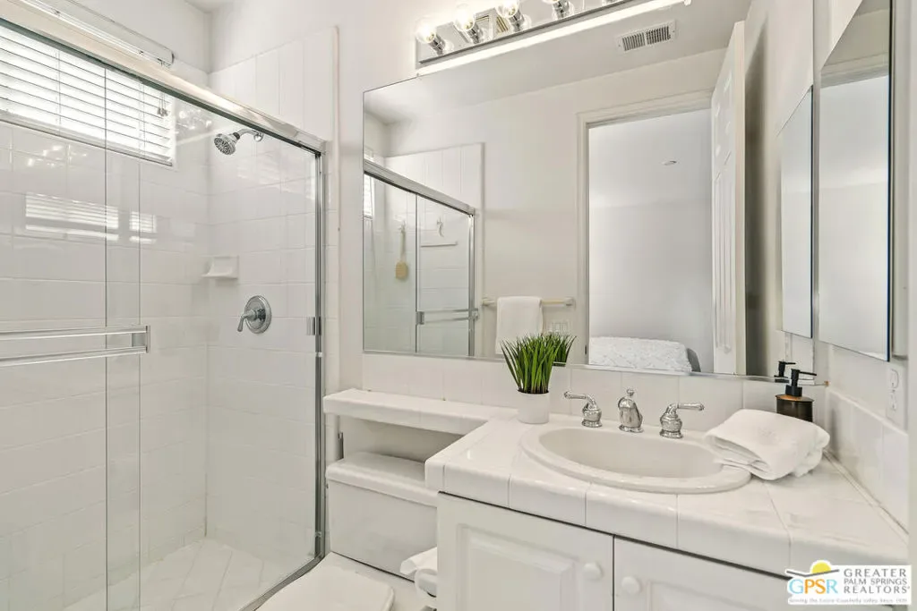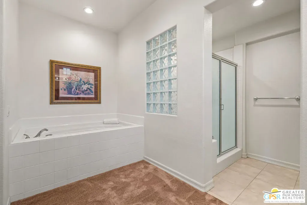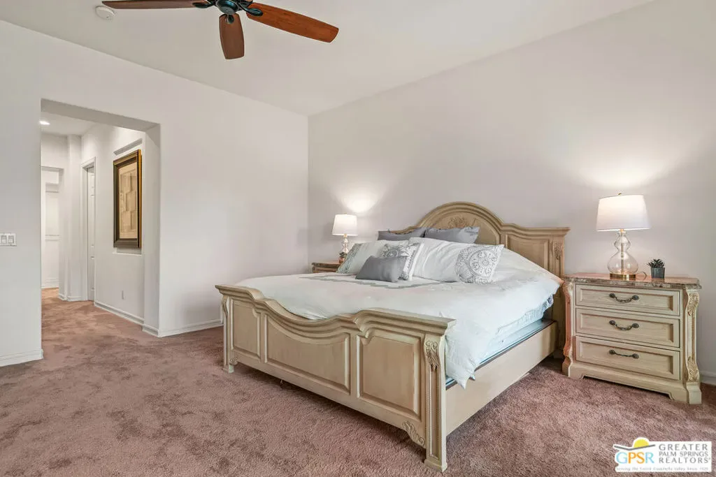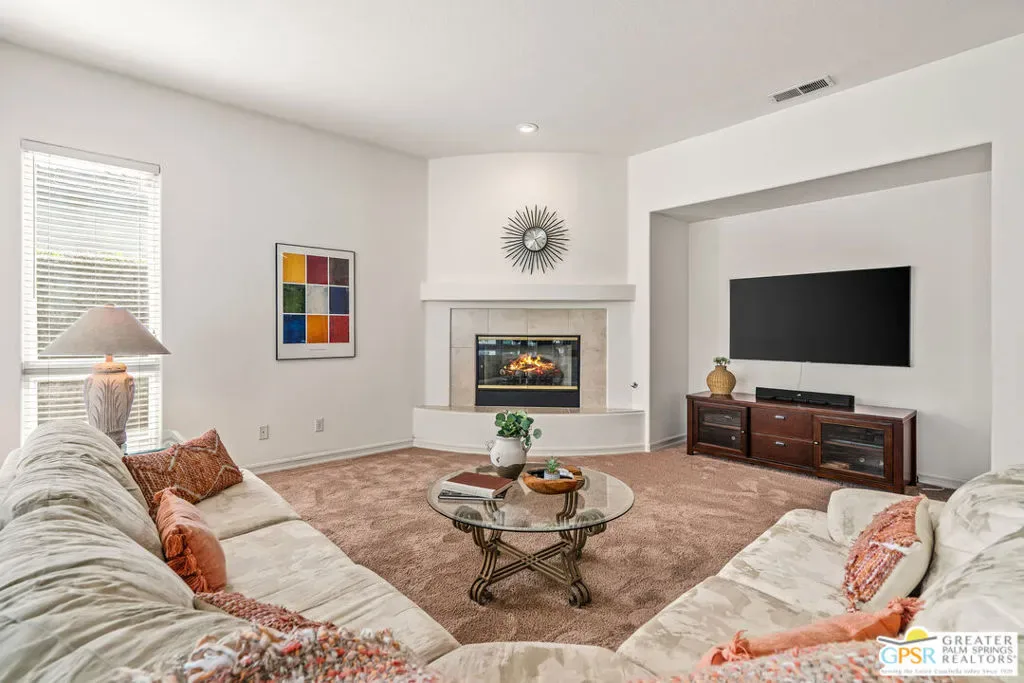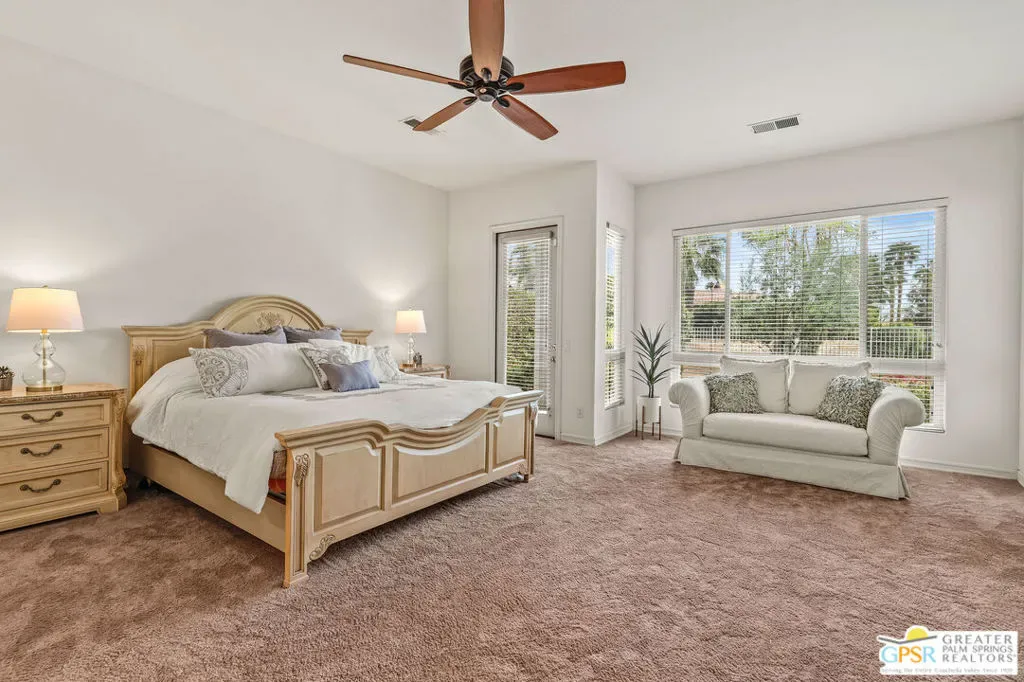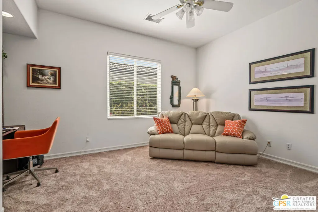 Located within the exclusive, 24-hour guard-gated Oakmont Estates at Mission Hills Country Club, this 3,582-square-foot Spanish-style residence offers a premier desert lifestyle on a spacious lot, 3 bedrooms, 3.5 baths, den/office, family room, on Fee land (no land lease) Low HOA’s. Designed for both entertaining and comfortable everyday living, featuring high 9-foot+ ceilings, clerestory windows, and elegant ceramic tile. Living Areas: A spacious floor plan including a formal living room with a fireplace, a formal dining room, and a separate study or media room, Chef’s Kitchen: Features a large center island, breakfast counter/bar, and a separate breakfast room that opens into a spacious great room. The Primary Suite: with dual walk-in closets, a large soaking tub, a separate shower, and private access to the patio and gardens. Guest Accommodations: Two additional en-suite bedrooms provide privacy and comfort for visitors. Bonus Features: A built-in wet bar, dual-glazed windows, and a high-efficiency dual HVAC system, lease solar system, 2 car garage and 1 car golf cart garage. Exterior: a covered concrete patio, lush landscaping, and a fenced yard. The Mission Hills Country Club Amenities offer Three championship golf courses (Dinah Shore Tournament, Arnold Palmer, and Pete Dye Challenge). A 17,000 sq. ft. Spa and Sports Center with a fitness complex and pool. One of the top racquet facilities in the U.S. (Tennis, Pickleball, and Croquet). A massive 55,000 sq. ft. clubhouse with mountain views. Located conveniently located near the Inverness gate, providing quick access to Eisenhower Medical Center, El Paseo shopping, Palm Springs, and the Palm Springs International Airport.