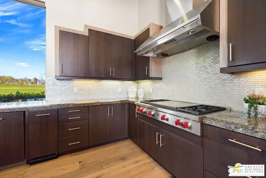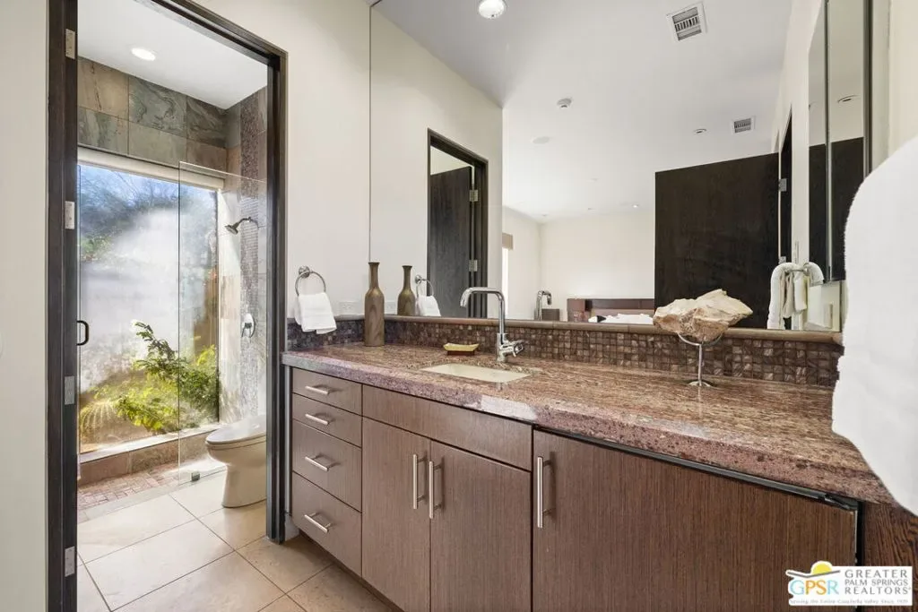 Designed and constructed by Patel Design Group, this fully furnished architectural estate is set on an expansive 28,000 sq ft lot behind the gates of Westgate at Mission Hills Country Club, offering panoramic lake and fairway views across the Pete Dye Course. With TWO PRIVATE POOLS and nearly 4,900 sq ft of living space, the residence delivers a rare blend of scale, privacy, and resort-style living. Soaring 16-foot ceilings, clerestory windows, and walls of glass define the main living areas, filling the home with natural light while electronic shades and integrated LED lighting provide comfort and control. Two fully retractable sliding glass doors create seamless indoor/outdoor flow to both the front and rear entertaining spaces. Designed for hosting at any scale, the home features a dramatic great room, formal dining area, and a step-down wet bar that anchors the entertaining experience. The chef’s kitchen is equally impressive, appointed with a Wolf appliance suite including dual ovens, dual dishwashers, a warming drawer, and a 60-bottle wine cooler – ideal for both everyday living and events. Outdoor living is a true highlight. The private south-facing yard features one pool, while the rear of the property showcases a striking north-facing infinity-edge pool overlooking the lake and fairway. A built-in BBQ island with granite counters and generous seating completes the outdoor experience. The residence offers six bedrooms and seven baths, including four private ensuites in the main house and an attached two-bedroom casita with its own entrance, living room, kitchenette, and two baths – perfect for guests, extended family, or multi-generational living while maintaining privacy. Additional features include a three-car garage, refined natural stone finishes, and thoughtful architectural detailing throughout. Offered fully furnished, this is a rare opportunity to own a turnkey, resort-style estate within one of Mission Hills’ most exclusive enclaves. Sophisticated, private, and designed to impress. This is elevated desert living at its finest.