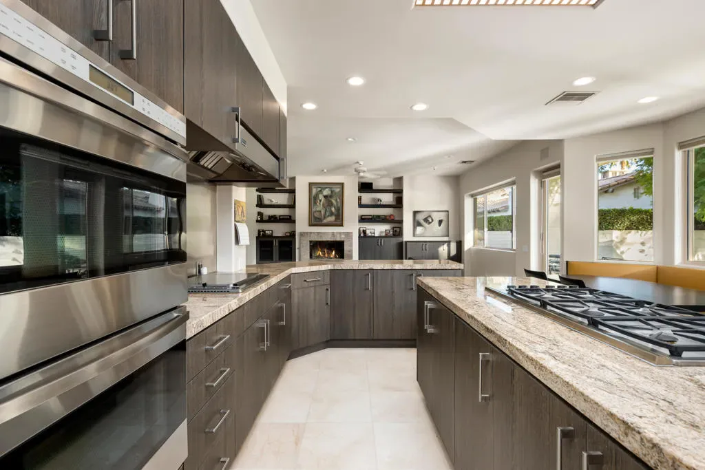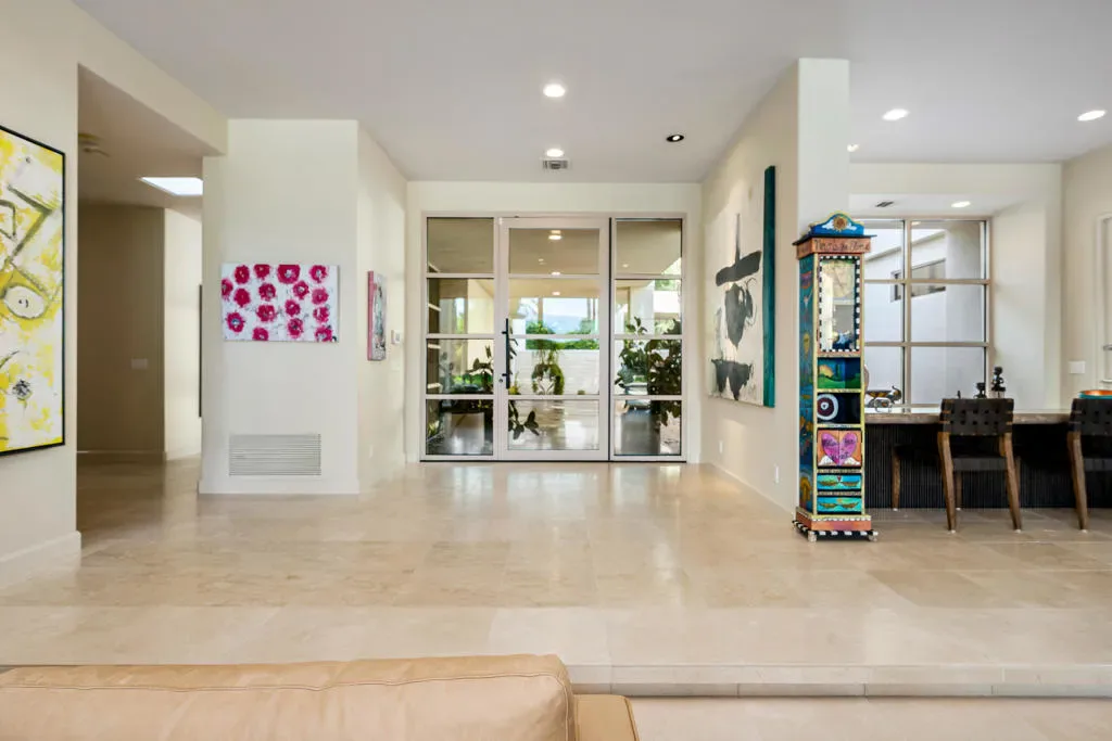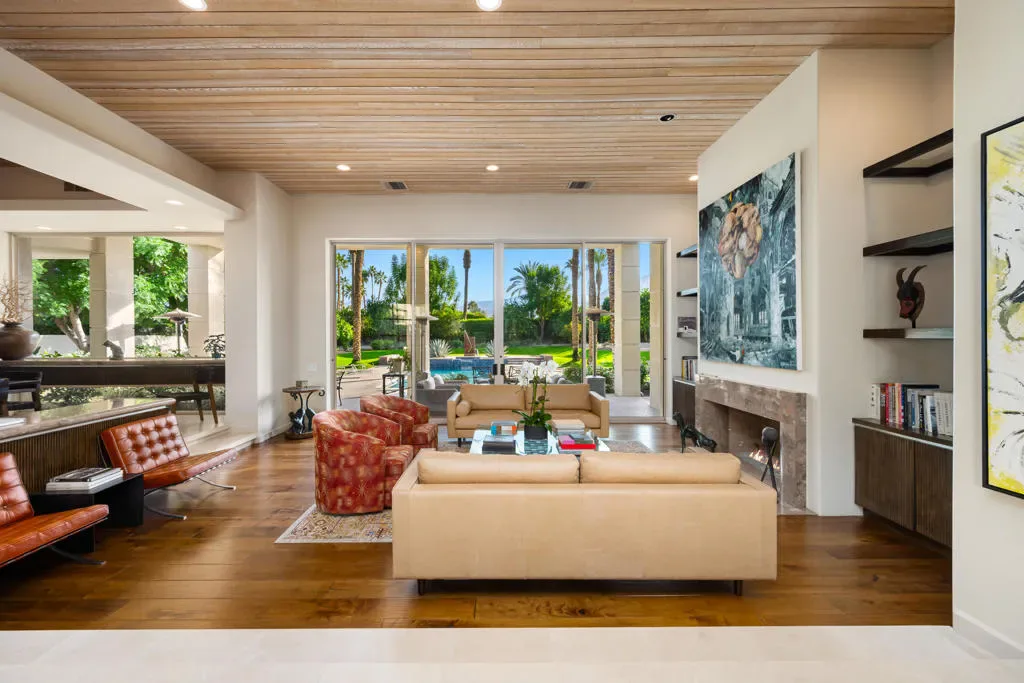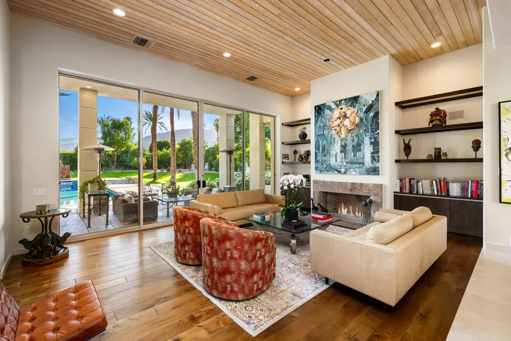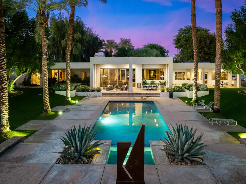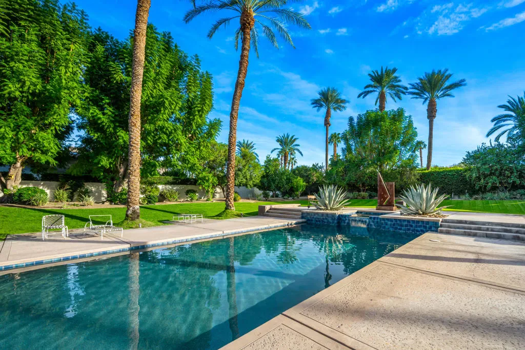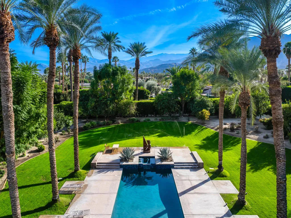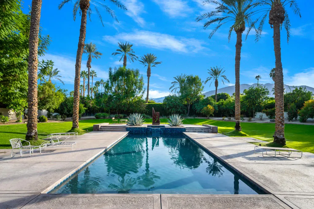 Welcome to 40745 Morningstar Road in the prestigious Mission Ranch community of Rancho Mirage. This stunning 1.1-acre property boasts unobstructed south and west mountain views, complemented by mature citrus trees, including oranges, grapefruits, and tangelos. Designed by renowned architect Tom Jakway, the timeless contemporary architecture is perfect for an art collection, featuring a grand wall of glass that frames the breathtaking views.As you approach, a long paver driveway leads to ample parking, and the elegant entry with glass doors invites you inside. The home features a large owned solar system, ensuring energy efficiency and even providing a mid-year credit. Additional features include a whole-house water softener, filtered and steaming water at the kitchen sink, and an electronic lighting system.For car enthusiasts, there’s a Tesla charger in the three-car garage, which also includes a split-unit air conditioning system. Entertain with ease in the stylish bar area, complete with a fridge, ice maker, and a walk-in wine room, perfectly positioned near the living and dining spaces.The expansive primary bedroom offers a cozy sitting area, dual oversized master closets, and a gym area in the luxurious primary bathroom. There are also three en-suite guest bedrooms, and Sonos music throughout the home.The gourmet kitchen is a chef’s dream, featuring double Sub-Zero refrigerators, double Wolf wall ovens, a warming drawer, a Miele dishwasher, and stunning views of the landscaped yard and mountains. The home is adorned with stone floors, and three of the bedrooms feature warm wood floors.Located in Mission Ranch off Clancy Lane, residents enjoy access to tennis courts and an equestrian center. Furniture may also be available for purchase, making this home the epitome of luxury living. Seller is a licensed California Real Estate Broker