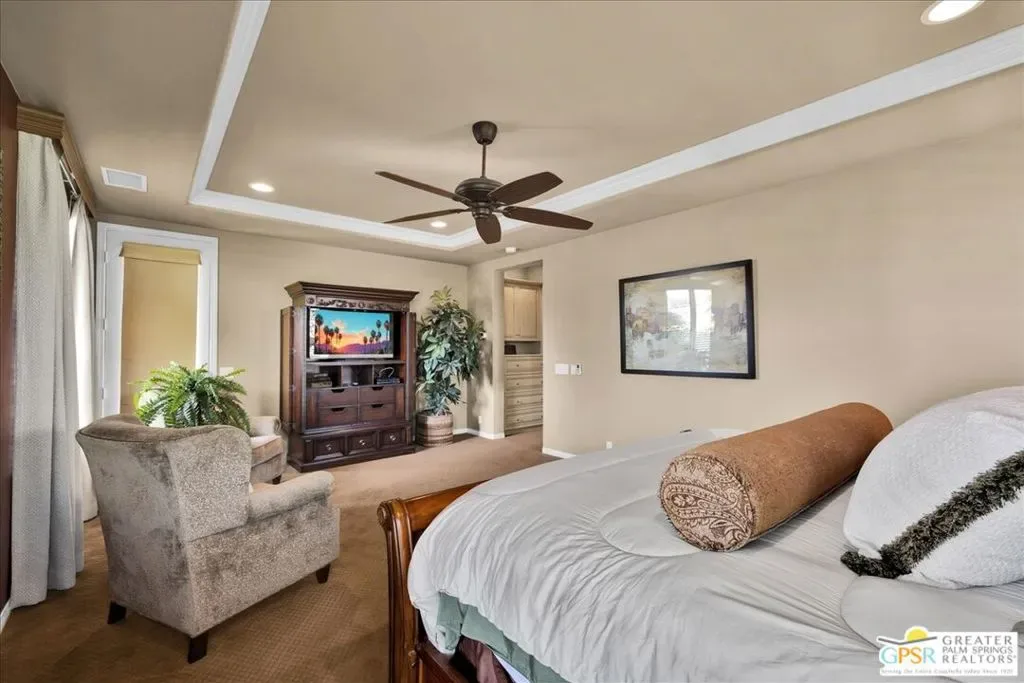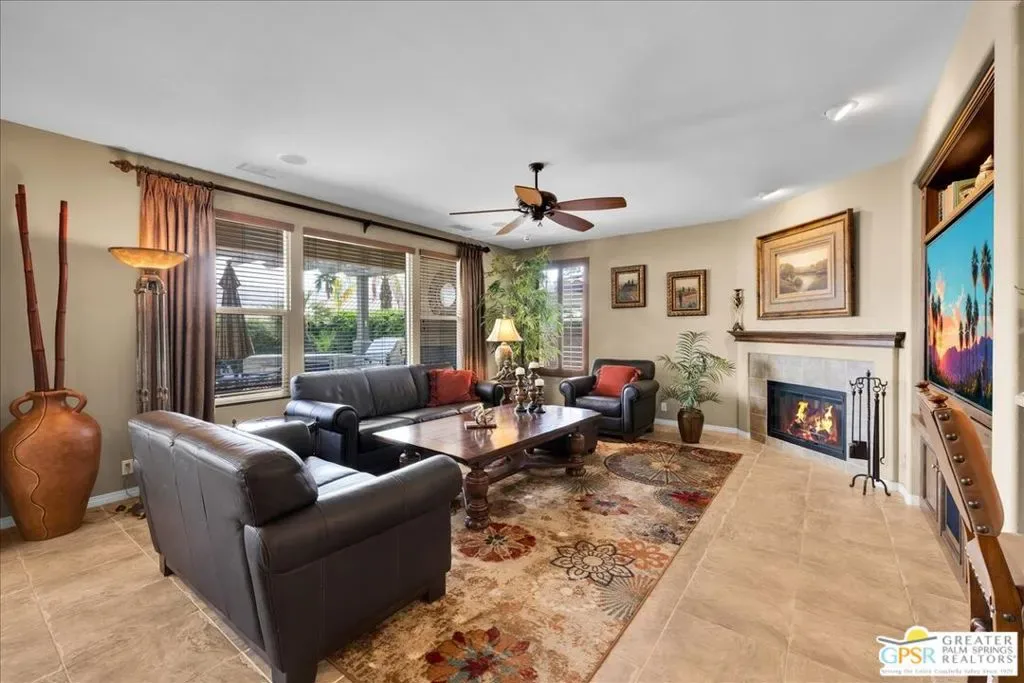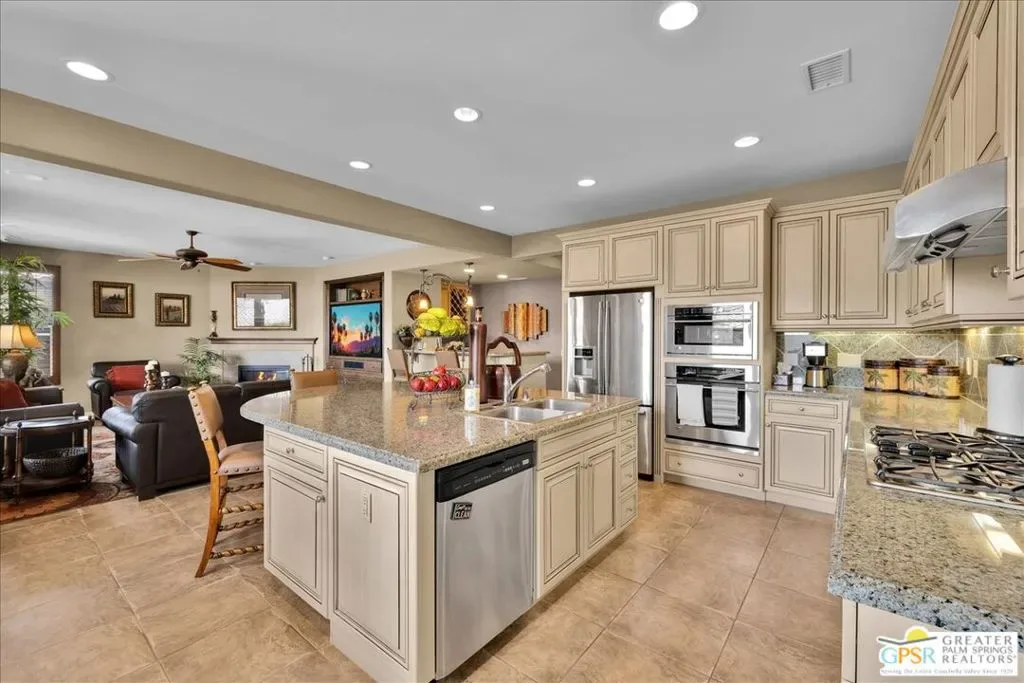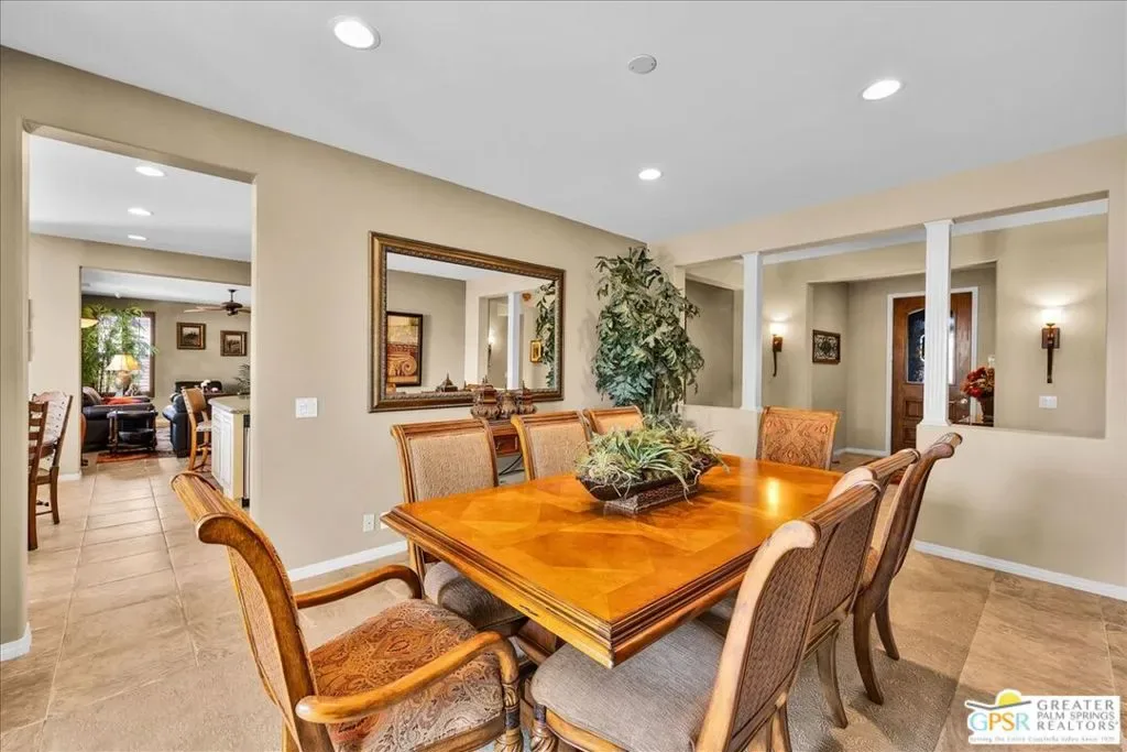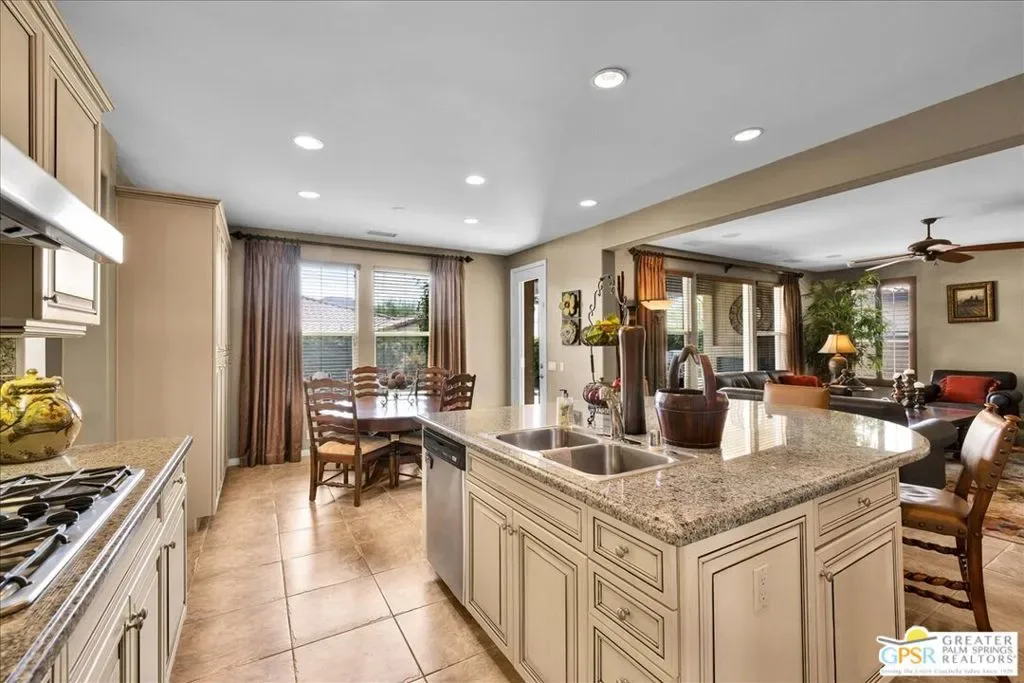 Bring your toothbrush and move right in to this fully turnkey furnished home in Aviara at Mission Shores. As a former model home for the community, this 4 bedroom, 3 1/2 bath corner home is highly upgraded with custom flooring and cabinetry, designer decor, high-end furnishings, even crown molding – a rarity in the desert – and too many options to mention. After admiring the commanding street presence, you can open the custom iron gate and choose to enter the home through either the front door or the attached casita bedroom with full bath. There is a combined great room, kitchen, wet bar area and a separate large formal dining room in addition to the very large primary bedroom with en-suite bath. The two guest bedrooms that share a Jack and Jill bath round out the inside. Outside is a sunny, south facing backyard with both southern and western mountain views, a pool and spa, and a built-in outdoor kitchen with grill, wine cooler and fireplace. Mission Shores LOW $390 HOA fees include front yard maintenance, an upgraded Spectrum TV/Streaming package, 1 gig of Internet speed and well funded reserves.
