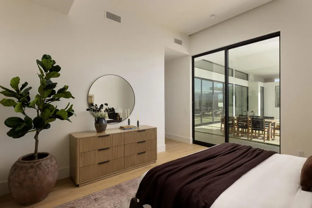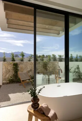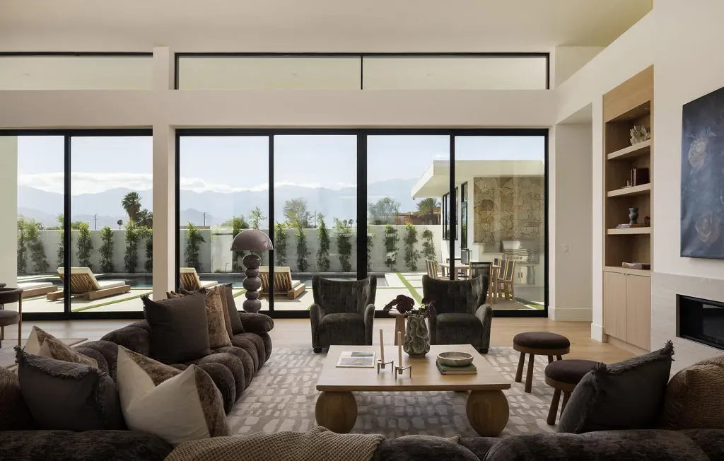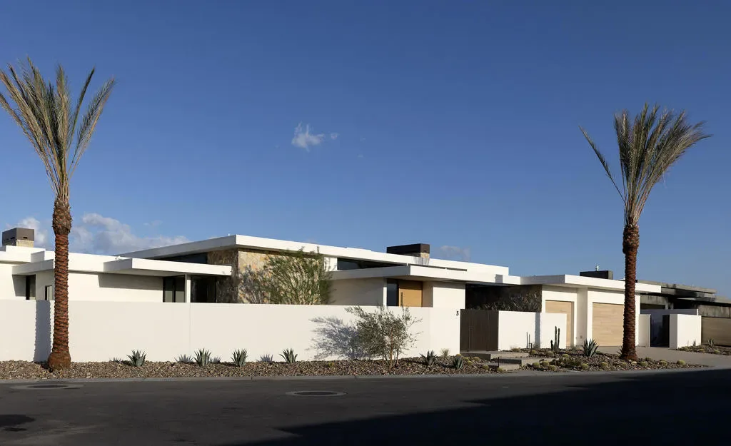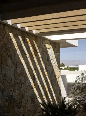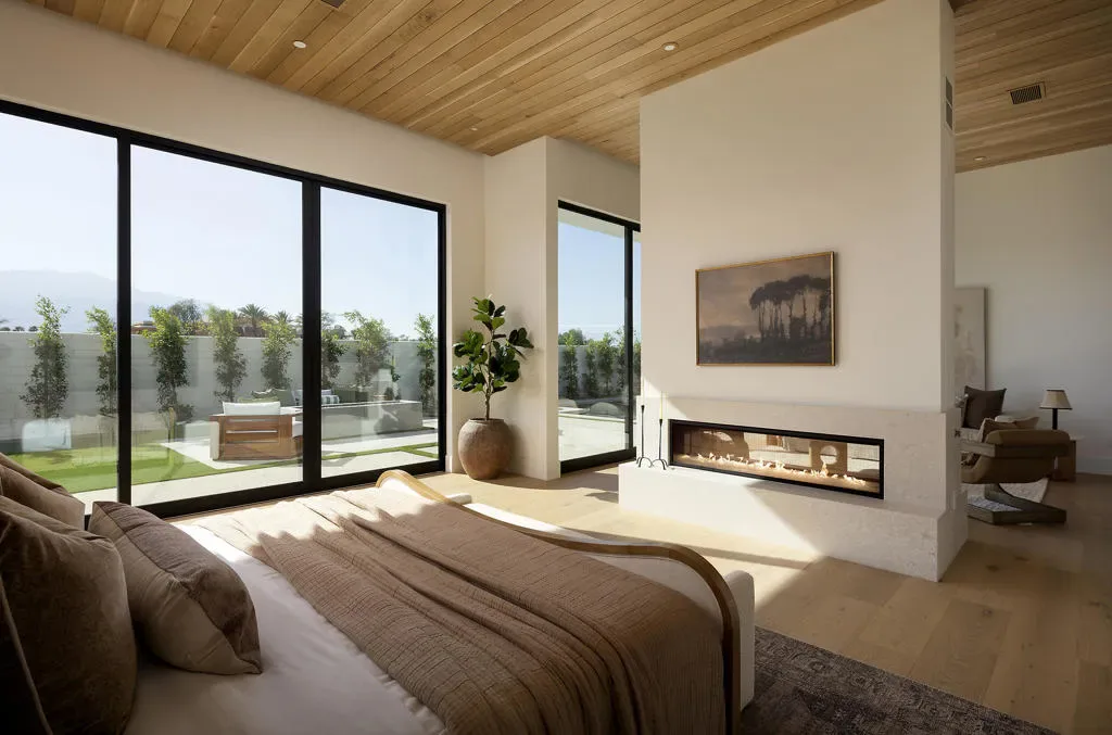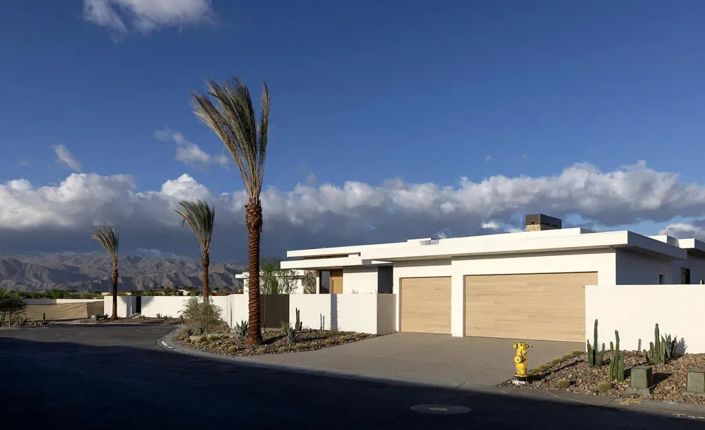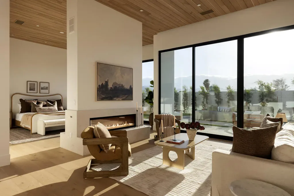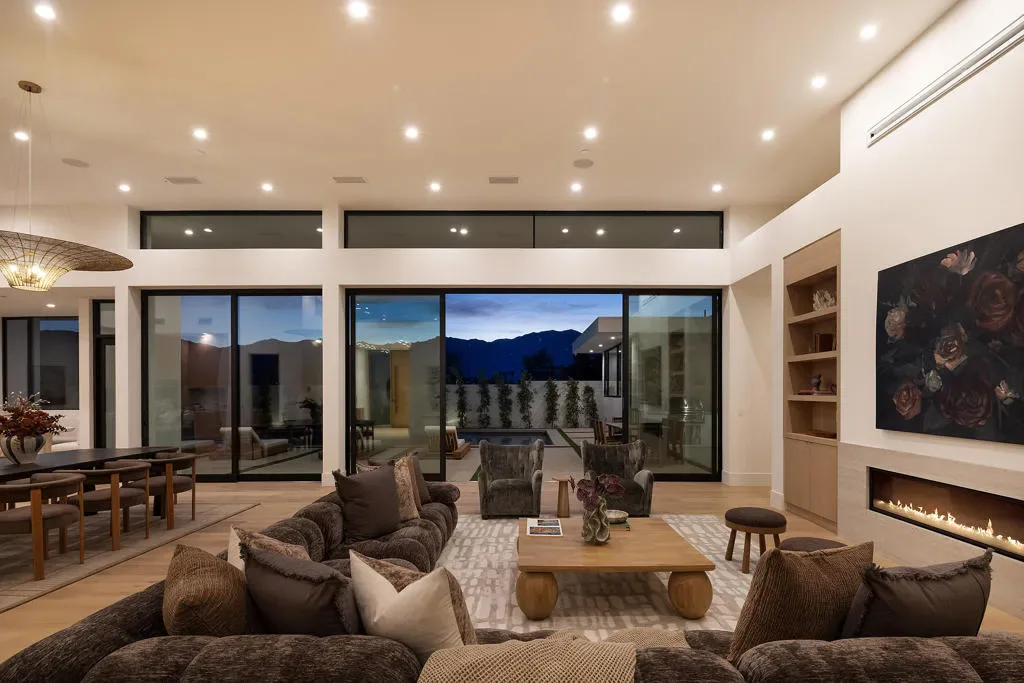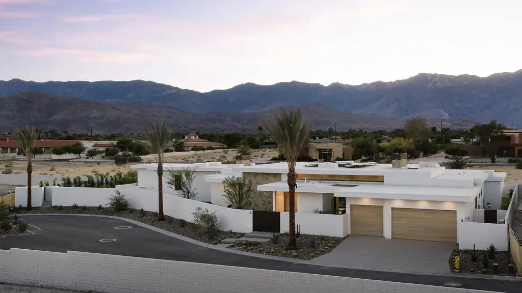 Behind private gates in the heart of Rancho Mirage lies Sanctuary–a private enclave of four newly built architectural homes designed by architect James M. McEachern and built by Coda Construction. Blending clean contemporary lines with warm natural textures, these residences are designed for modern living, featuring open-concept interiors, expansive glass walls, and a seamless flow between indoor and outdoor spaces. Welcome to 3 Sanctuary Way, a 4 bedroom, 5 bathroom residence spanning approximately 4,687 square feet, where soaring 14-foot living room ceilings and engineered light oak flooring set an elegant tone. A limestone fireplace with a custom limestone surround anchors the great room, framed by soft natural light and mountain views. The kitchen is both functional and refined, showcasing light oak pre-finished wood veneer cabinetry, Calacatta Vagli polished porcelain countertops, natural stone surfaces, and an oversized island ideal for gatherings. A striking 10-foot white oak entry pivot door creates a grand first impression, while exterior finishes feature Tuscan mosaic limestone and exposed aggregate concrete detailing, adding texture and architectural depth. The primary suite offers direct access to the pool and spa, highlighted by white oak ceilings in the master bedroom, a generous walk-in closet, and a spa-style bath featuring porcelain Taj Mahal countertops. A private outdoor shower brings a resort-inspired touch, while every finish reflects craftsmanship and care. An attached ADU provides a private guest retreat complete with its own bedroom, bath, and a thoughtfully designed kitchenette featuring a fridge, cooktop, sink, and pantry. Outside, a Mini Pebble Tec pool and spa create the centerpiece for desert relaxation, surrounded by lounge areas and thoughtfully designed landscaping. Every detail was selected to balance beauty, comfort, and enduring quality. Located minutes from El Paseo’s world-class shopping and dining, the art and gardens of Sunnylands, and premier golf clubs including Tamarisk and Thunderbird, Sanctuary offers the best of desert living. Whether for quiet retreat or stylish entertaining, this is the ultimate expression of modern architecture in Rancho Mirage.
