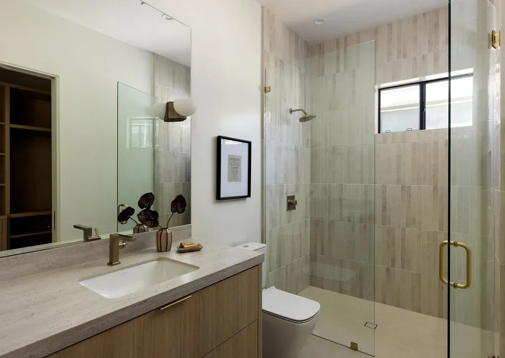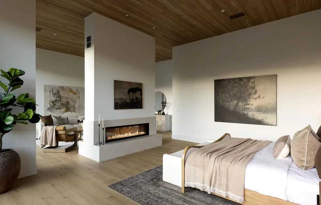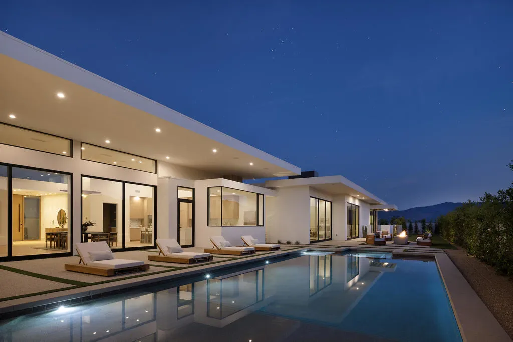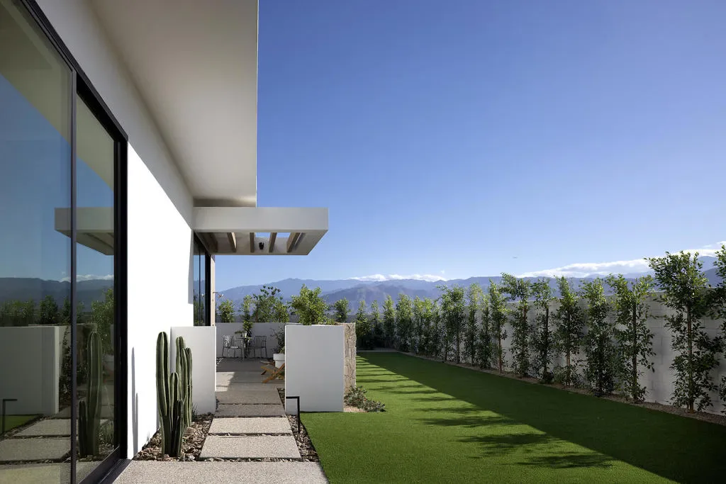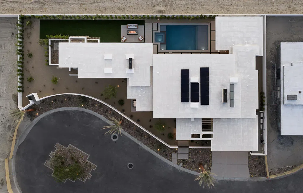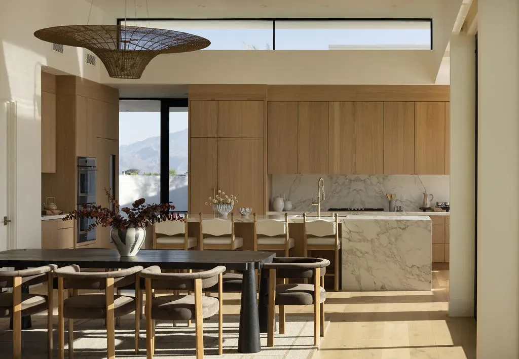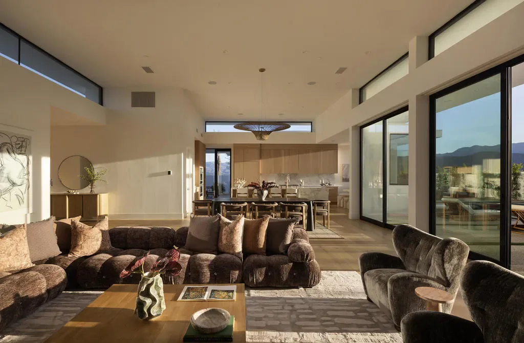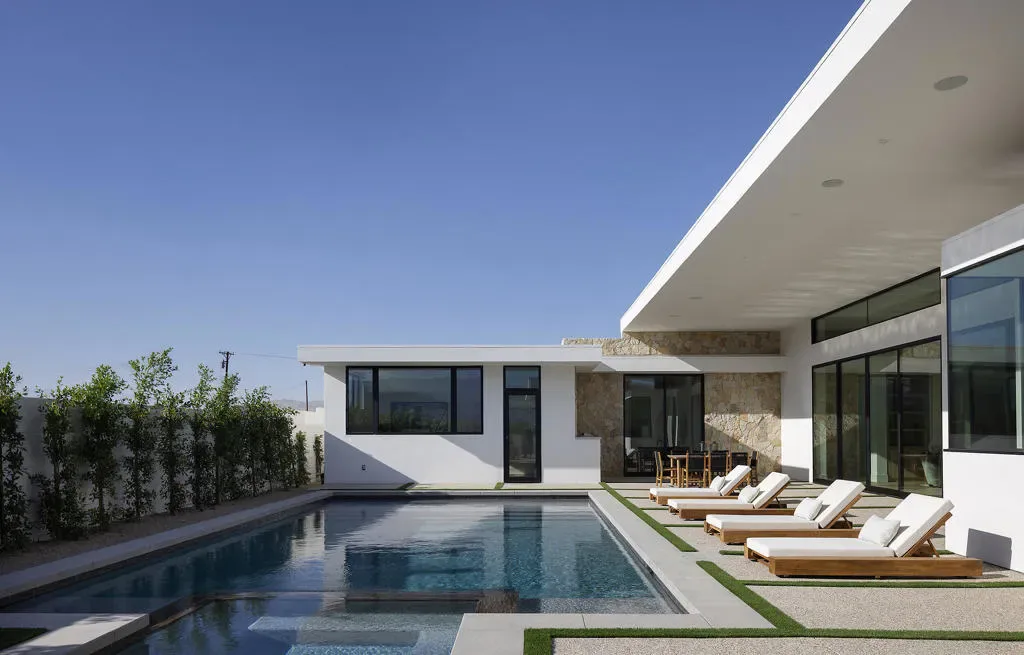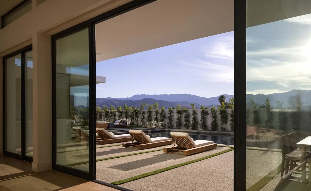 Behind private gates in the heart of Rancho Mirage lies Sanctuary–a private enclave of four newly built architectural homes designed by architect James M. McEachern and built by Coda Construction. Blending clean contemporary lines with warm natural textures, these residences are designed for modern living, featuring open-concept interiors, expansive glass walls, and a seamless flow between indoor and outdoor spaces. Welcome to 3 Sanctuary Way, a 4 bedroom, 5 bathroom residence spanning approximately 4,687 square feet, where soaring 14-foot living room ceilings and engineered light oak flooring set an elegant tone. A limestone fireplace with a custom limestone surround anchors the great room, framed by soft natural light and mountain views. The kitchen is both functional and refined, showcasing light oak pre-finished wood veneer cabinetry, Calacatta Vagli polished porcelain countertops, natural stone surfaces, and an oversized island ideal for gatherings. A striking 10-foot white oak entry pivot door creates a grand first impression, while exterior finishes feature Tuscan mosaic limestone and exposed aggregate concrete detailing, adding texture and architectural depth. The primary suite offers direct access to the pool and spa, highlighted by white oak ceilings in the master bedroom, a generous walk-in closet, and a spa-style bath featuring porcelain Taj Mahal countertops. A private outdoor shower brings a resort-inspired touch, while every finish reflects craftsmanship and care. An attached ADU provides a private guest retreat complete with its own bedroom, bath, and a thoughtfully designed kitchenette featuring a fridge, cooktop, sink, and pantry. Outside, a Mini Pebble Tec pool and spa create the centerpiece for desert relaxation, surrounded by lounge areas and thoughtfully designed landscaping. Every detail was selected to balance beauty, comfort, and enduring quality. Located minutes from El Paseo’s world-class shopping and dining, the art and gardens of Sunnylands, and premier golf clubs including Tamarisk and Thunderbird, Sanctuary offers the best of desert living. Whether for quiet retreat or stylish entertaining, this is the ultimate expression of modern architecture in Rancho Mirage.