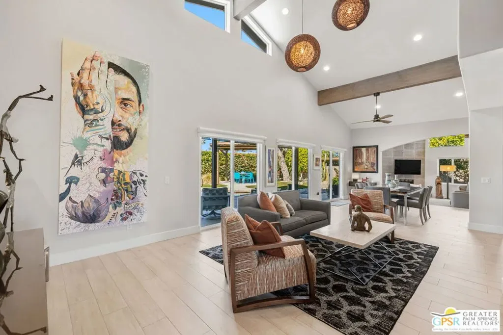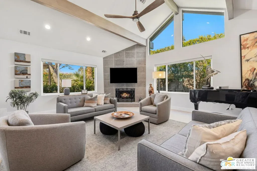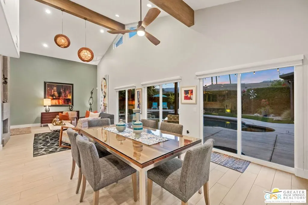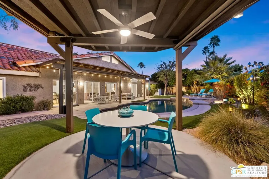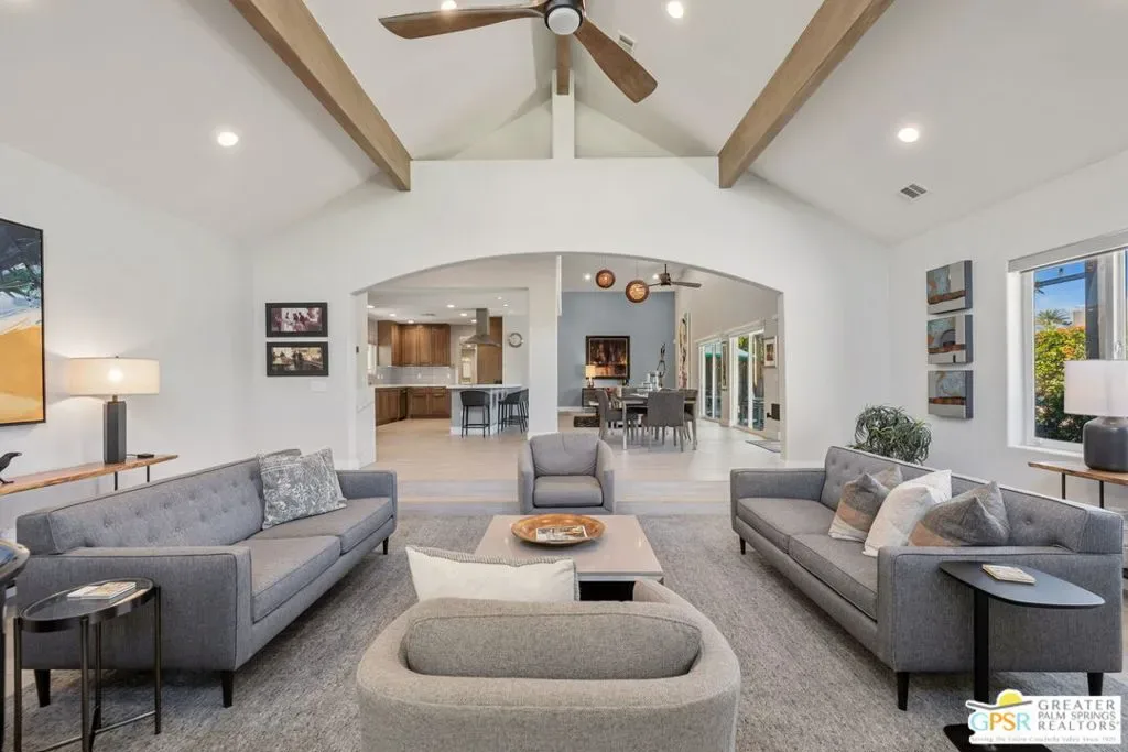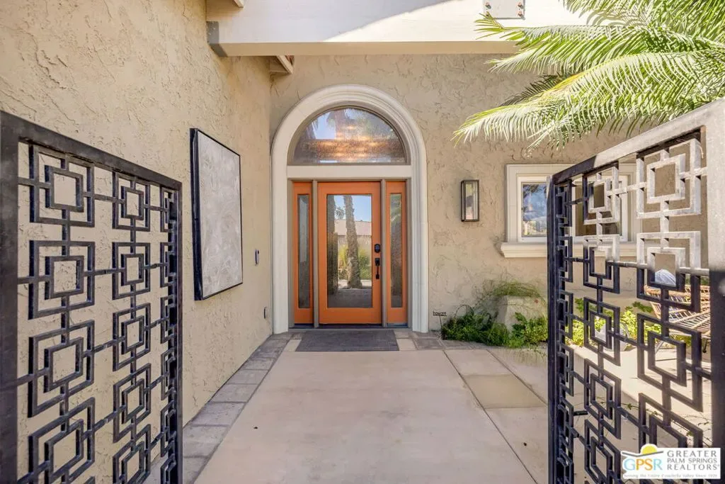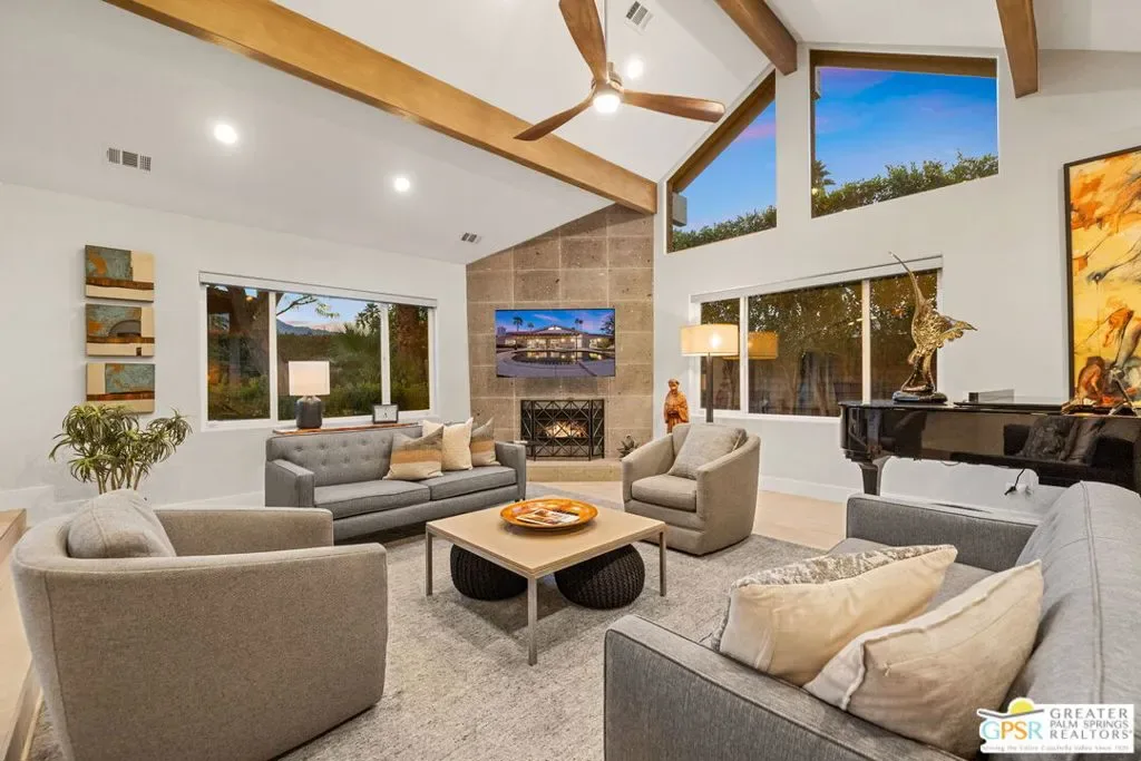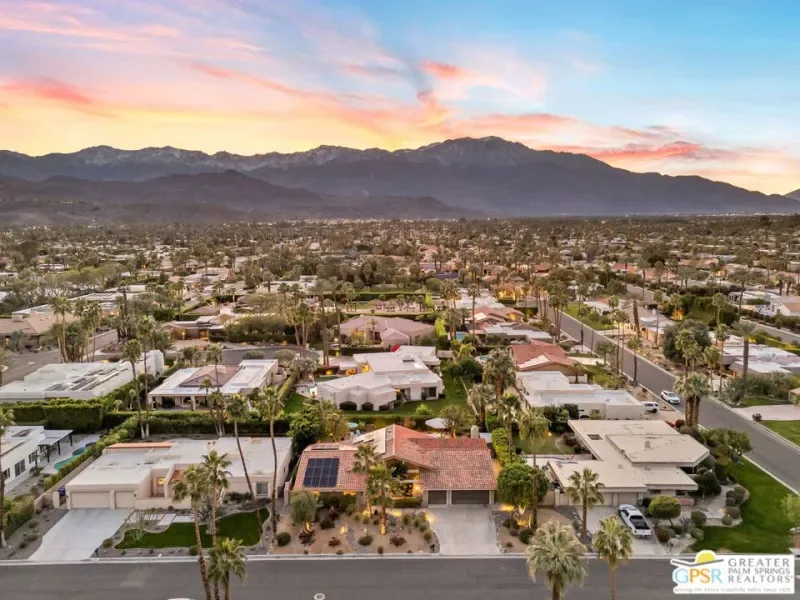 Don’t let the curb fool you…this one’s a jaw-dropper the moment you walk through the door! Welcome to one of Tamarisk’s most treasured address — a meticulously upgraded desert sanctuary where timeless architecture meets modern luxury living. Set on a quiet, tree-lined street with NO HOA, this 3-bedroom, 2.5-bath home has been thoughtfully transformed from the inside out. Soaring vaulted and beamed ceilings, dramatic clerestory windows, and two floor-to-ceiling cantera stone fireplaces set a spirited tone the moment you step inside. The open living and dining areas flow effortlessly into a sunken family room, creating an ideal canvas for entertaining or quiet relaxation. A series of sliding glass doors dissolves the boundary between indoors and out, drawing you toward the resort-like backyard sanctuary beyond. The newly remodeled kitchen is a showstopper featuring fresh counters, new backsplash, a new 220 volt induction cooktop, dishwasher, and refrigerator, all bathed in natural light with counter seating for casual dining. A nearby bar with wine refrigerator keeps the entertaining seamless. The primary suite is a true retreat: vaulted ceilings, dual walk-in closets, and a spa-like bath with freestanding soaking tub, tiled shower, and private water closet. Sliders from both the bedroom and bath open directly to a private patio with outdoor shower. A recently completed primary bath extension adds an additional 60 square feet of luxury. En Suite #2 enjoys its own full bath, while the third bedroom, currently configured as an office, offers flexible use. A powder room serves guests along the hallway. Step outside and the magic truly unfolds. The west-facing backyard captures spectacular Coachella Valley sunsets over a pebble-lined saltwater pool and spa, newly upgraded with a chiller, new filter and pumps, and a fresh acid wash in 2026. A permanently covered patio, gazebo with new enclosure, outdoor shower, and professional misting system create an outdoor living experience that rivals any resort. Among the standout improvements: two new HVAC heat pumps, a new electrical panel, 34 solar panels, Lutron automatic remote shades throughout, new solid wood interior doors, USB/USC charging outlets in every room, and an 220 volt car charger in the garage. Thanks to the solar and heat pump systems, owners enjoy significantly lower electric bills year-round. Water-wise desert landscaping with native plantings and synthetic turf complete this effortlessly maintained exterior. All wall-mounted flat screens are included in the sale. This is a home that has been loved deeply and upgraded purposefully – ready for its next chapter.