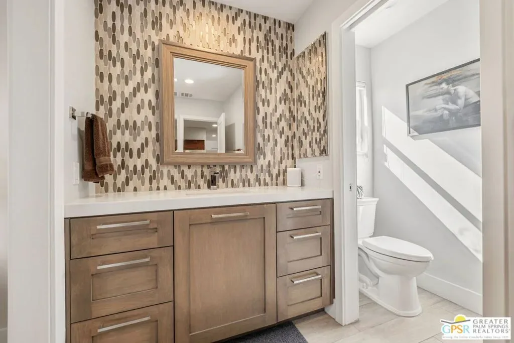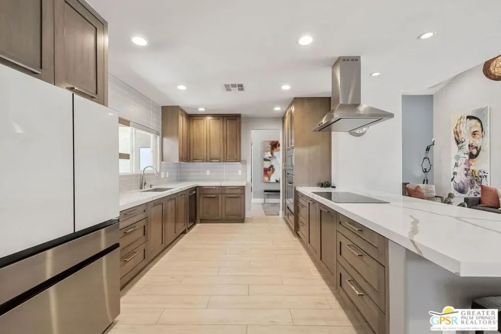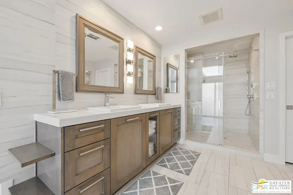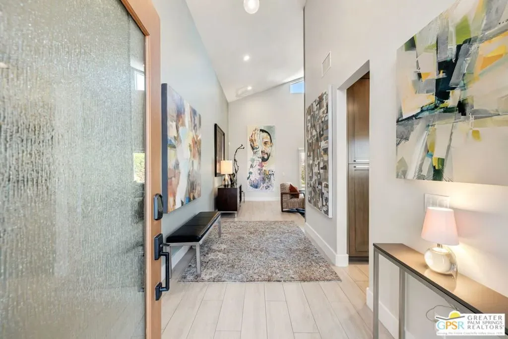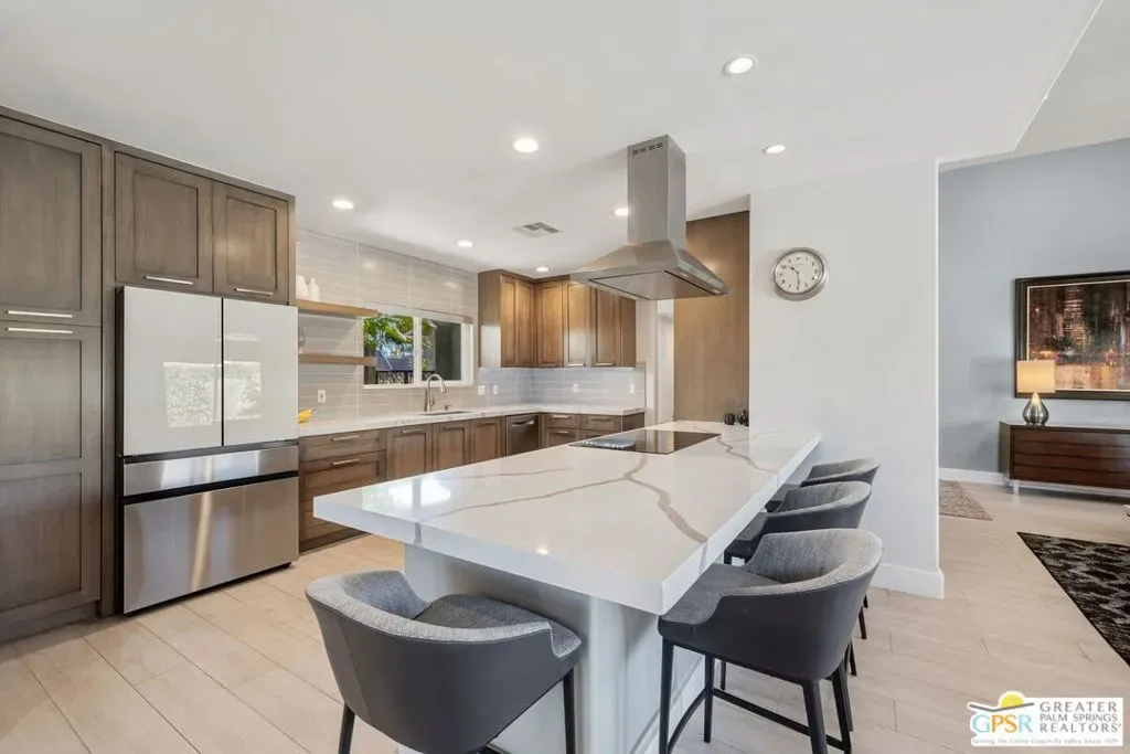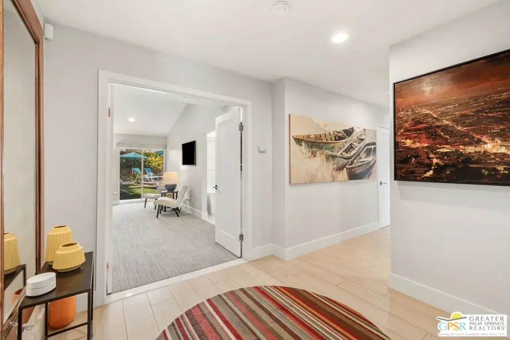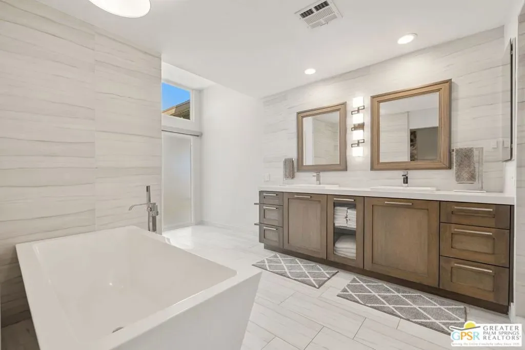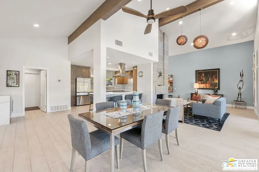 Don’t let the curb fool you…this one’s a jaw-dropper the moment you walk through the door! Welcome to one of Tamarisk’s most treasured address — a meticulously upgraded desert sanctuary where timeless architecture meets modern luxury living. Set on a quiet, tree-lined street with NO HOA, this 3-bedroom, 2.5-bath home has been thoughtfully transformed from the inside out. Soaring vaulted and beamed ceilings, dramatic clerestory windows, and two floor-to-ceiling cantera stone fireplaces set a spirited tone the moment you step inside. The open living and dining areas flow effortlessly into a sunken family room, creating an ideal canvas for entertaining or quiet relaxation. A series of sliding glass doors dissolves the boundary between indoors and out, drawing you toward the resort-like backyard sanctuary beyond. The newly remodeled kitchen is a showstopper featuring fresh counters, new backsplash, a new 220 volt induction cooktop, dishwasher, and refrigerator, all bathed in natural light with counter seating for casual dining. A nearby bar with wine refrigerator keeps the entertaining seamless. The primary suite is a true retreat: vaulted ceilings, dual walk-in closets, and a spa-like bath with freestanding soaking tub, tiled shower, and private water closet. Sliders from both the bedroom and bath open directly to a private patio with outdoor shower. A recently completed primary bath extension adds an additional 60 square feet of luxury. En Suite #2 enjoys its own full bath, while the third bedroom, currently configured as an office, offers flexible use. A powder room serves guests along the hallway. Step outside and the magic truly unfolds. The west-facing backyard captures spectacular Coachella Valley sunsets over a pebble-lined saltwater pool and spa, newly upgraded with a chiller, new filter and pumps, and a fresh acid wash in 2026. A permanently covered patio, gazebo with new enclosure, outdoor shower, and professional misting system create an outdoor living experience that rivals any resort. Among the standout improvements: two new HVAC heat pumps, a new electrical panel, 34 solar panels, Lutron automatic remote shades throughout, new solid wood interior doors, USB/USC charging outlets in every room, and an 220 volt car charger in the garage. Thanks to the solar and heat pump systems, owners enjoy significantly lower electric bills year-round. Water-wise desert landscaping with native plantings and synthetic turf complete this effortlessly maintained exterior. All wall-mounted flat screens are included in the sale. This is a home that has been loved deeply and upgraded purposefully – ready for its next chapter.
