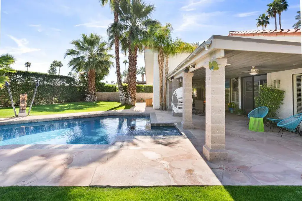 Step into resort-style living at Presidential Estates, an exclusive and tranquil gated community in Rancho Mirage. This breathtaking property features a dramatic peak elevation roofline that floods the space with natural sunlight. The open concept seamlessly blends indoor and outdoor living, creating an effortless flow. Soaring ceilings and an atrium just off the kitchen add to the airy and welcoming atmosphere.The formal dining room offers stunning views of the expansive yard with pool / spa, surrounded by lush landscaping. A stunning mosaic tile pool and spa serve as your own private backyard retreat, framed by a canopy of mature palms and majestic mountain views to the west. A spacious covered patio provides ample entertaining space, offering both shade and a cool respite from the sun. The primary suite is a true sanctuary, offering a great sense of separation and privacy. Adjacent to the suite are two generous guest bedrooms, ensuring comfort for all.All these amenities are provided at a low HOA fee, making this one of Rancho Mirage’s most desirable communities. Located close to shopping and dining, it offers the perfect blend of luxury and convenience.