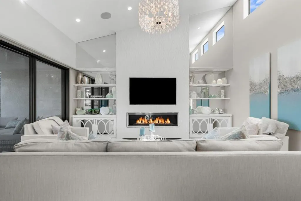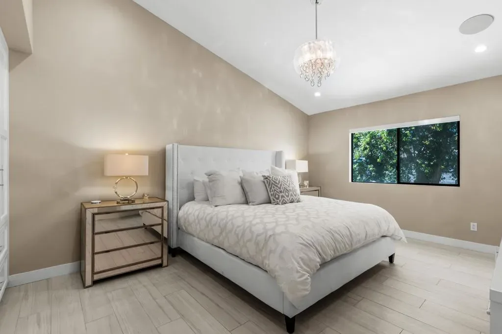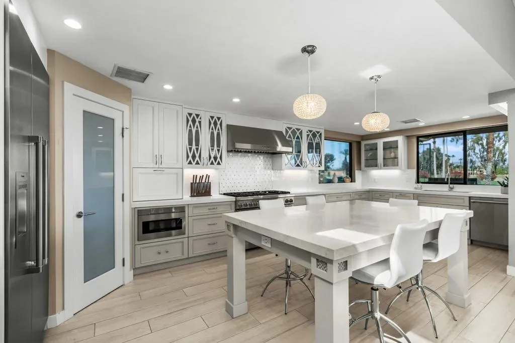 Set at the end of a quiet cul-de-sac just moments from the clubhouse and pro shop, this completely remodeled residence enjoys a rare combination of privacy, panoramic golf course vistas, and effortless access to the community’s premier amenities. Inside, a light-filled open floor plan unfolds beneath dramatic vaulted ceilings and clerestory windows, creating an airy architectural presence throughout the main living spaces. The living room is anchored by a sleek linear fireplace set within a sculptural feature wall, flanked by custom built-ins and illuminated by a statement chandelier that adds a touch of modern sophistication. The fully remodeled kitchen is both stylish and functional, featuring custom cabinetry with designer glass detailing, quartz countertops, stainless steel appliances, and a generous center island designed for gathering and entertaining. Expansive windows frame lush golf course views, bringing the beauty of the surrounding landscape into the heart of the home. The spacious primary suite offers a peaceful retreat with high ceilings, abundant natural light, and a beautifully appointed spa inspired bath with dual vanities, custom lighting, and a large glass enclosed shower. Two additional guest suites provide comfortable accommodations for visitors while maintaining privacy. Outdoors, a covered patio with power awnings extends the living space, creating an inviting setting for morning coffee, alfresco dining, or evenings around the firepit while enjoying sweeping fairway and mountain views. The patio’s generous scale and intimate seating areas make it ideal for both relaxed everyday living and entertaining guests. Residents of Rancho Las Palmas Country Club enjoy access to an exceptional collection of amenities including 27 holes of championship golf, tennis and fitness facilities, a vibrant clubhouse with dining, and 29 pools and spas throughout the community. Ideally located in the heart of Rancho Mirage, the property is also just moments from The River, where shopping, dining, and entertainment can be reached in minutes, even by golf cart. A rare opportunity to enjoy effortless desert living in one of Rancho Mirage’s most beloved golf communities.