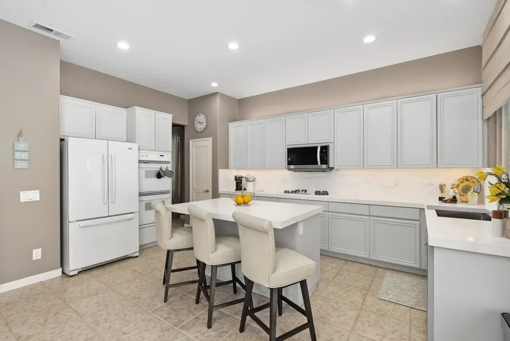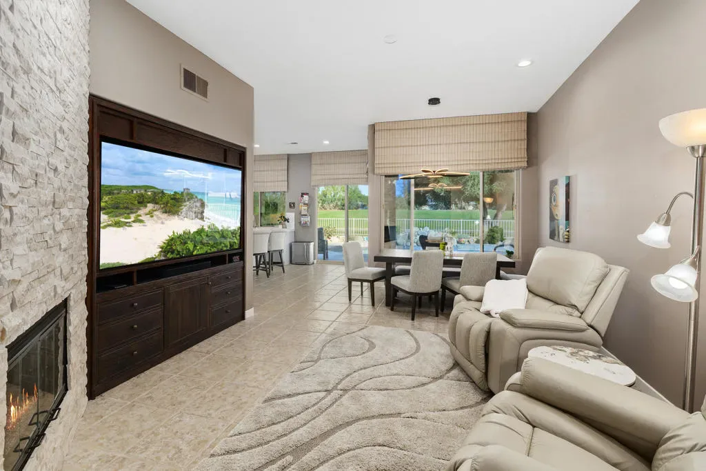 This beautiful remodeled single-story move-in ready 2600 sq ft home offers spacious living featuring 2 Bedrooms, 3 full baths and is set up with an open office/den with elegant built-ins. The quest bedroom with it’s own outside private entry also has access directly from the home. This bedroom/casita has it’s own full bath and walk-in closet. The third full hallway bathroom suffices as a guest bathroom. The home has stunning fairway, mountain, lake and pool views! There are no attached walls, no stairs, and is the largest single-story floor plan in this community. As you enter the home through the double front doors you immediately notice the openness of this home with its tall ceilings, new tile flooring, and the focal point of the stunning split stone floor to ceiling double fireplace facing both the living room and family room… all of which adds to the light and bright atmosphere of this gorgeous home. The chef’s kitchen with quartz countertops includes a center island offering casual seating. From the kitchen you can exit the sliding glass doors to the inviting private back yard patio with professional desert landscaping, pool/spa with new pebble-tec finish and rock waterfall, built-in BBQ, and a automated awning for additional shade. The enormous Master Suite w/fairway and pool views has a massive walk-in closet with built-ins, custom cabinets with loads of storage, dual sinks, a large tub with a separate shower. This home also has it’s own separate laundry area with a sink and storage. Additional highlights include an attached 2-car garage plus a 3rd garage for a golf cart. This golf community also offers a 10-hole golf course at a minimal annual cost! Rancho Mirage CC is ideally located in Rancho Mirage and is close to Eisenhower Medial Center, shopping, dining and entertainment, minutes to the The River, and of course the El Paseo Shopping and Dining District. This home has it all and can be either your perfect seasonal retreat or your full-time sanctuary. Don’t miss out this one!