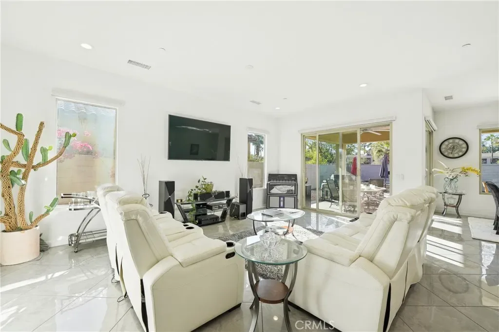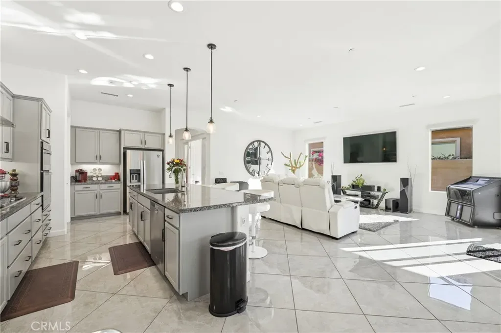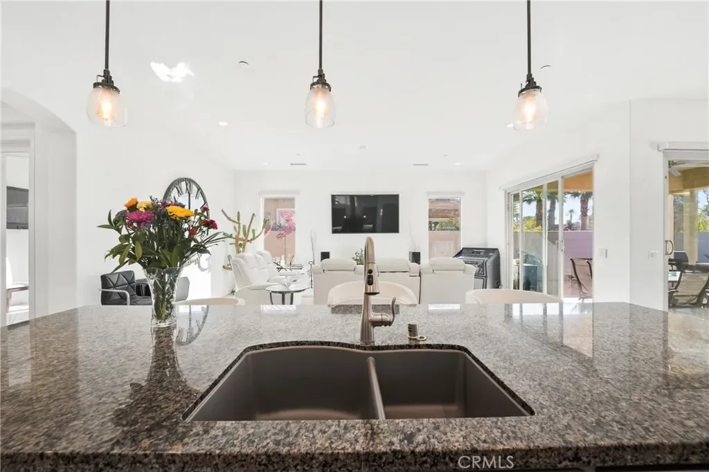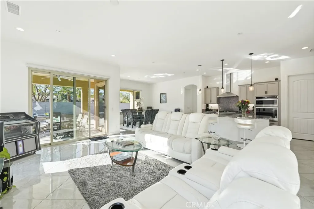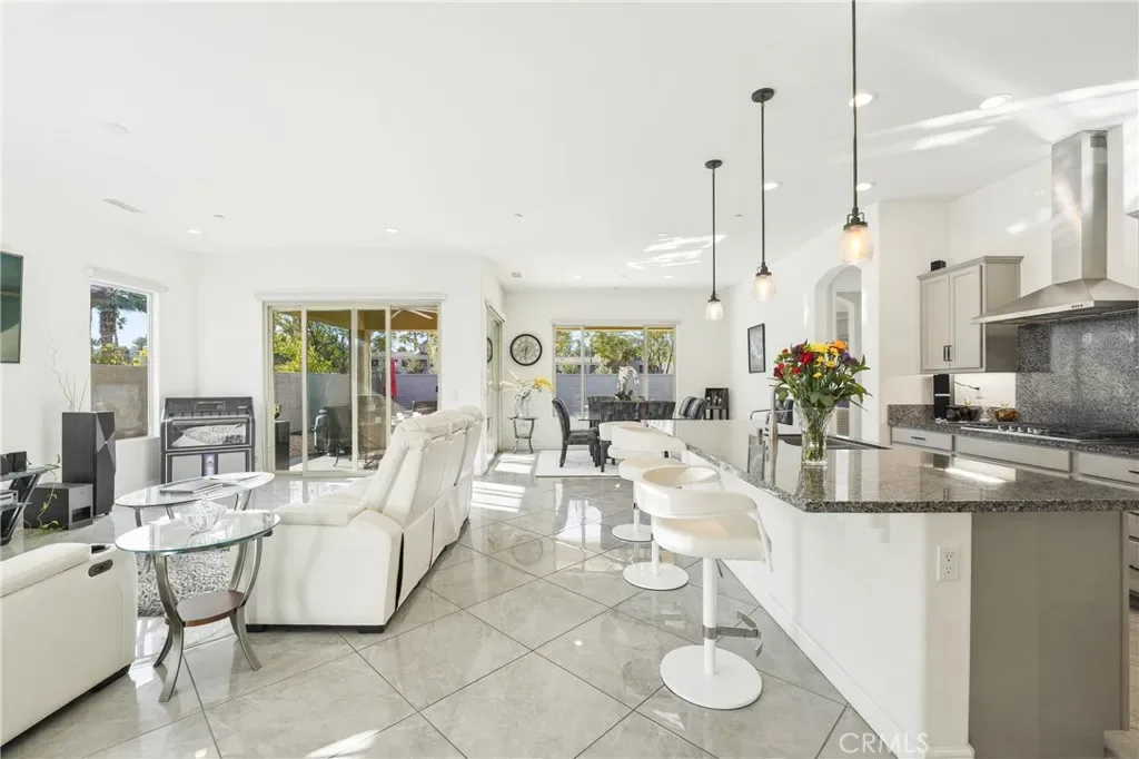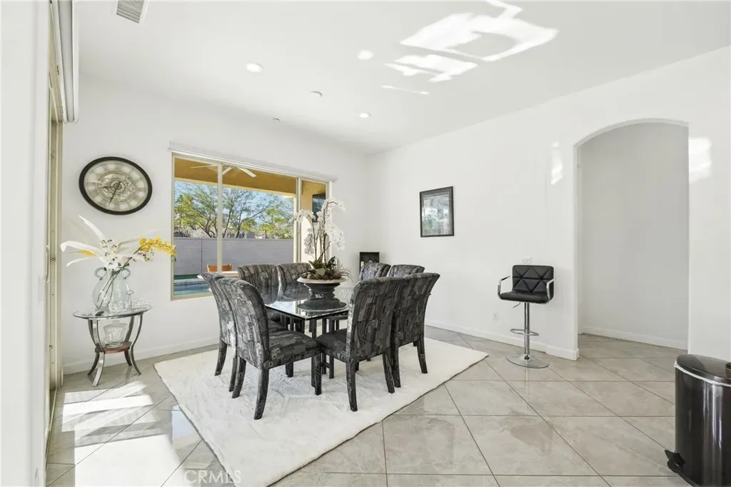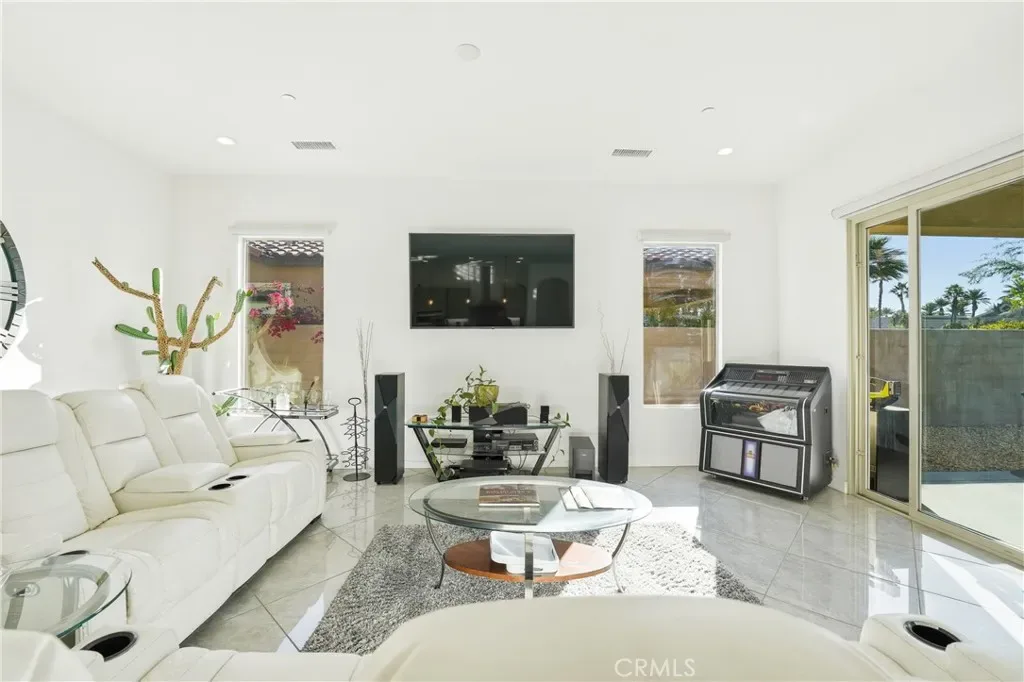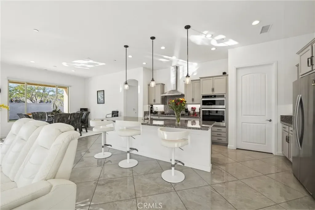 Welcome to 61 Cabernet in Del Webb Rancho Mirage. This 2-bedroom, 2-bath residence features a thoughtfully designed open-concept layout with seamless flow between the great room, dining area, and kitchen, creating a comfortable and functional living environment. The kitchen is well-appointed with granite countertops, upgraded cabinetry, a spacious peninsula with seating, and a walk-in pantry, offering both convenience and connection to the main living space. Interior highlights include porcelain tile flooring, custom window treatments, ceiling fans, and a built-in surround sound system in the great room.