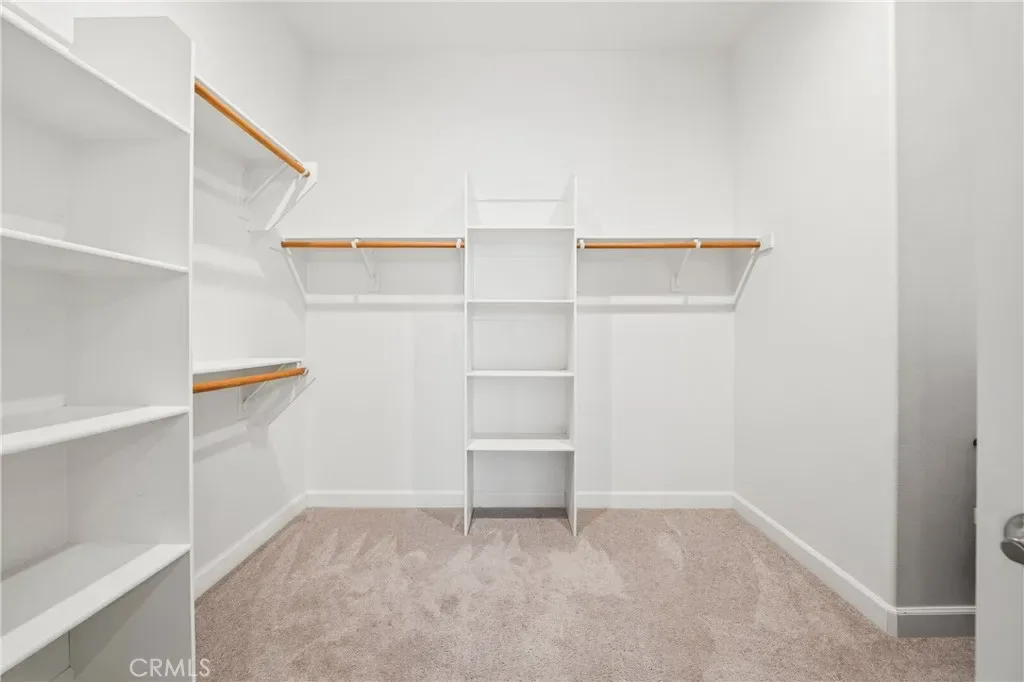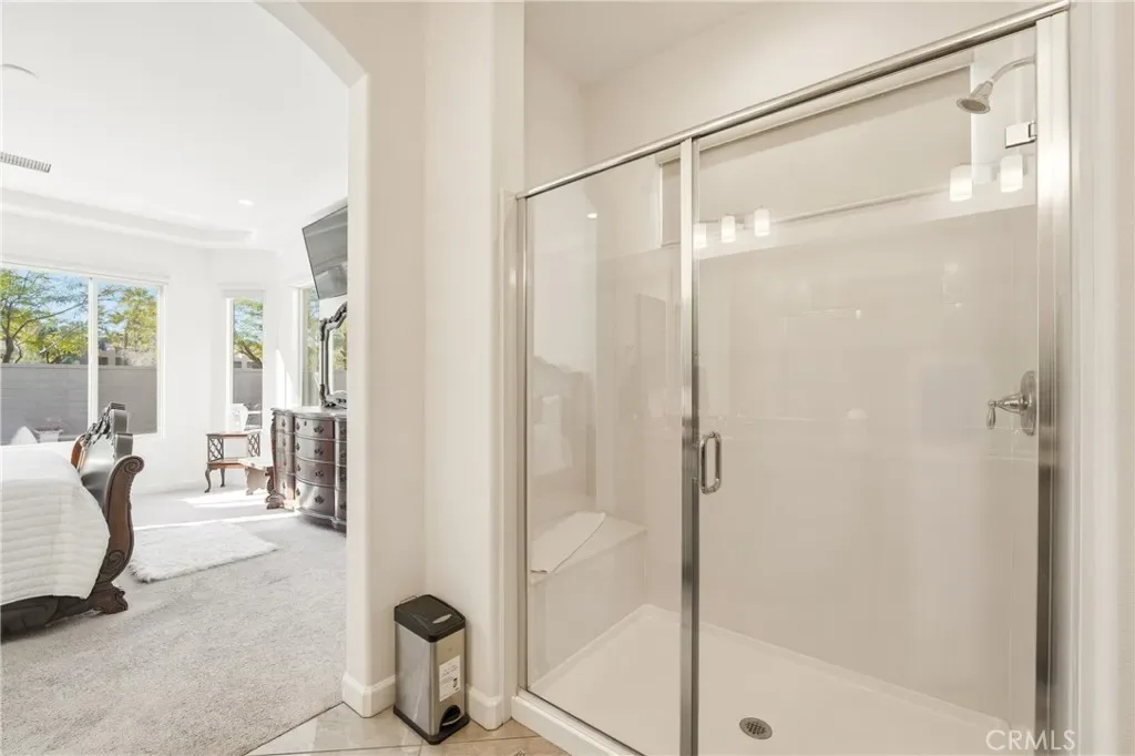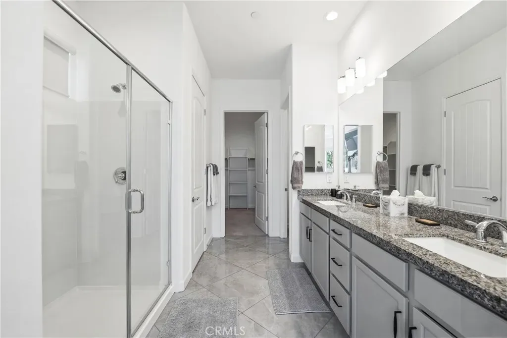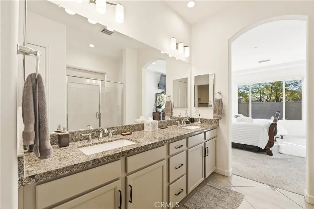The primary suite includes a spacious walk-in closet and an ensuite bath with dual vanities and a glass-enclosed shower. The guest bedroom is positioned on the opposite side of the home, providing privacy with easy access to a nearby full bathroom. A dedicated laundry room with washer and dryer, leased solar, and a 2-car garage add to the home’s functionality.