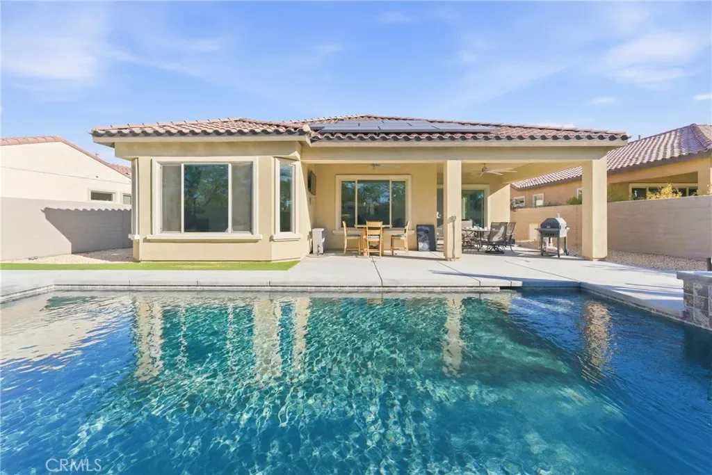 The outdoor space is designed for everyday enjoyment, featuring a covered patio, private pool and spa, built-in speakers, and mountain views. The yard offers a peaceful setting for relaxing or entertaining.