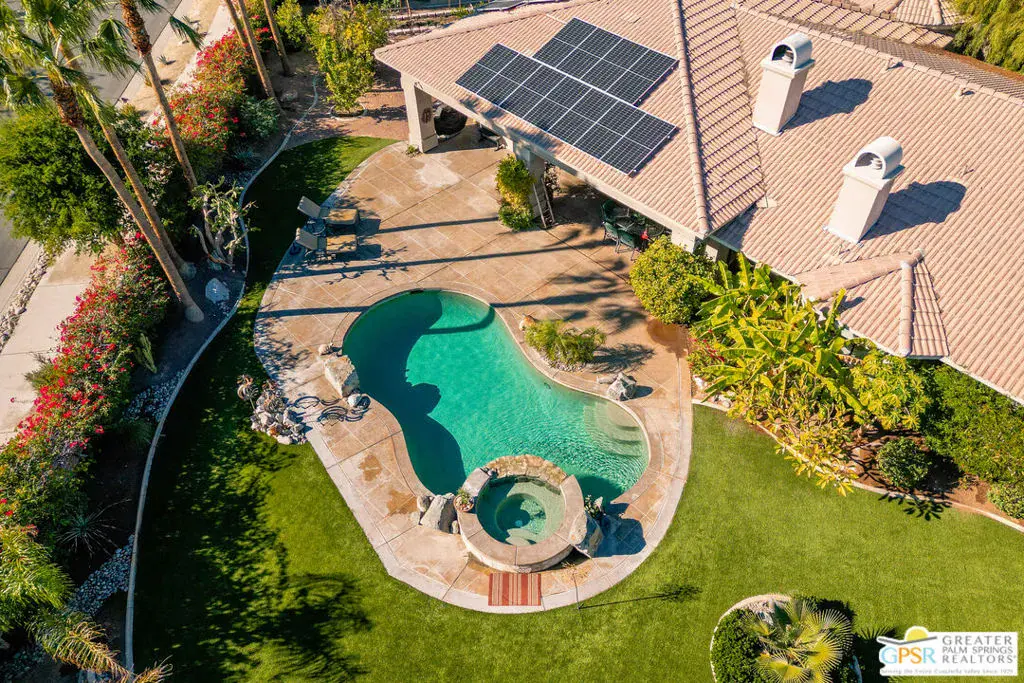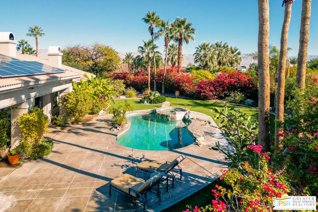 Welcome to your private escape within this contemporary Mediterranean oasis. One of just ten homes in a gated community, this professionally designed residence offers three bedrooms plus a den/office, three bathrooms, and sits on an expansive lot of over 16,000 square feet at the end of the cul-de-sac.From the moment you arrive, you are welcomed through a gated front courtyard adorned with lush landscaping and a tranquil bubbling fountain. Inside, the foyer showcases soaring ceilings and generous wall spaceideal for displaying art and treasured collections. The open living areas are both gracious and well defined, featuring a breakfast nook with bay windows, a formal dining area, and a comfortable living room anchored by a fireplace.The open kitchen is perfectly suited for both everyday living and entertaining, offering guest seating and a spacious pantry. French doors off the south-facing living area open wide to invite natural light and breezes, leading to a private lanai and BBQ, surrounded by verdant backyard complete with a custom salt water pebble tech pool and slate rock waterfall spa.The oversized lot provides ample room for a future ADU and includes a generous garden area with mature fruit treesincluding Lemon, Mexican Lime, Pomegranate, and Fig. Ideal for those with a green thumb. Back inside, the primary bedroom is a true retreat, featuring French doors that open to a seating area and a spa-inspired bath, large walk-in closet, and a fireplace. With direct access to the backyard, the suite offers seamless enjoyment of the outdoor spa on relaxing evenings.Just across the hall one will find a flexible room (listed on records as the fourth bedroom) that opens to the front courtyard and serves beautifully as an office, media room, or creative space.Continuing down the hall, you’ll find a convenient powder room with nearby linen storage, along with two additional bedrooms that share a full bathroom. Additional amenities include a three-car garage, a spacious laundry room with extra storage, paid-for solar panels (installed but not connected), and a dual-zone HVAC system.This sophisticated home offers remarkable versatility ideal as a full-time residence, weekend retreat, work-from-home haven, or peaceful escape from the bustle just beyond. Conveniently located near Mission Hills Country Club and a short drive to shopping and dining, this quiet, well-maintained community offers a truly special desert lifestyle.