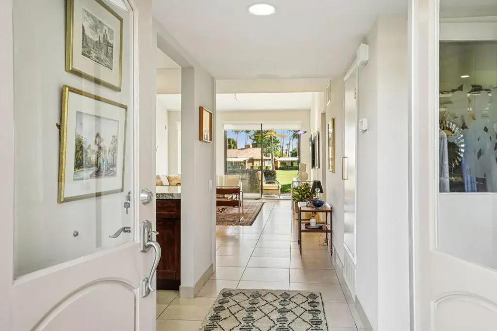 Welcome to one of the crown jewels of Sunrise Country Club! This stunning condo isn’t just beautiful and spacious, it comes with true STAR POWER. Having once belonged to the iconic CAROL CHANNING and where her memoirs were written, this home carries a touch of Hollywood history and charm. If she loved it… you will absolutely fall in love too! Step inside this light, bright, and updated Granada floor plan (2 bedrooms, 2 bathrooms, nearly 1,400 sq. ft.) and soak in the gorgeous fairway and mountain views that set the tone for relaxed resort living. As you approach the property, you’re welcomed by a warm and beautifully landscaped front courtyard, an ideal spot for morning coffee or unwinding by the fire with your favorite evening drink. Through the stylish French doors, the home opens into an elegant living space that immediately brings a feeling of peace and sophistication. The upgraded kitchen shines with beautiful granite slab countertops, a chic glass tile backsplash, custom wood cabinetry, stainless steel appliances, a large picture window over the patio, and plenty of counter space for cooking or entertaining. The living room is equally impressive, featuring a dramatic wall of glass overlooking the fairway, soaring cathedral ceilings that is unique to only a few condos, and a lovely dining area perfect for gatherings with friends and family. The primary suite is a true retreat, complete with serene mountain views from the bed, direct access to the oversized back patio, a beautifully updated bathroom with a seamless glass walk-in shower, spacious vanity, and a huge custom walk-in closet. The guest bedroom offers wonderful separation from the rest of the home, sliding glass door to the front patio, a built-in desk area, and access to the stylish guest bath, giving it an en-suite feel your visitors will love. Throughout the home, you’ll find thoughtful upgrades like custom shades for privacy and energy efficiency, newer HVAC and water heater systems, and updated glass in the sliding doors and the list continues giving you a turnkey, move-in-ready home from day one. Sunrise CC is a lively, welcoming community offering golf, tennis, a fitness center, and an exceptional dining experience thanks to their new premier chef crafting delicious meals for residents. You won’t want to miss this opportunity, come experience this special home for yourself!