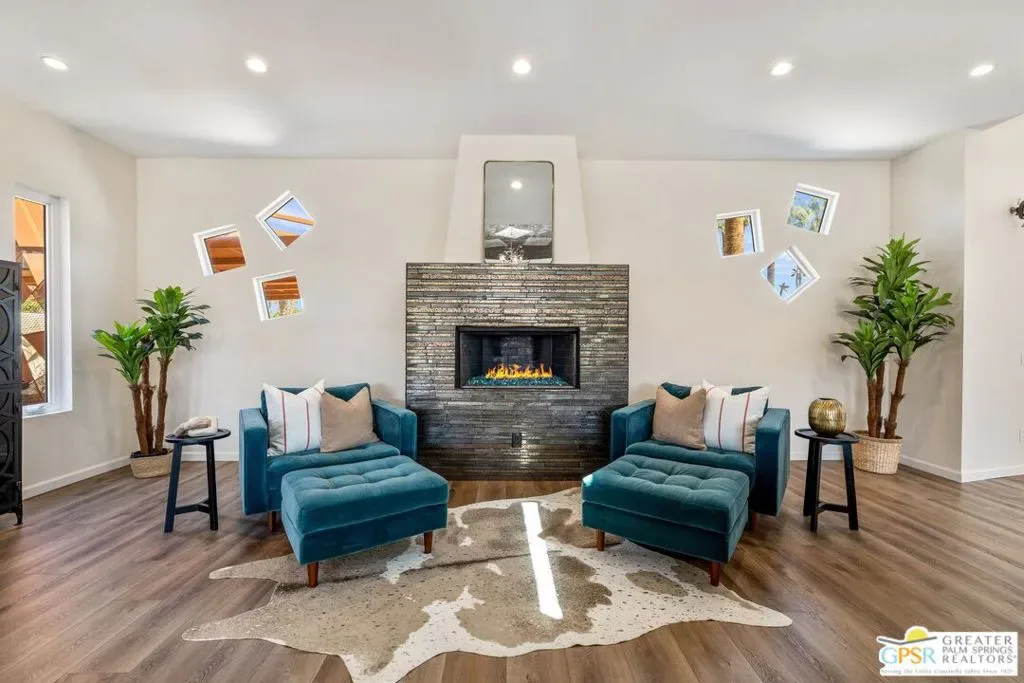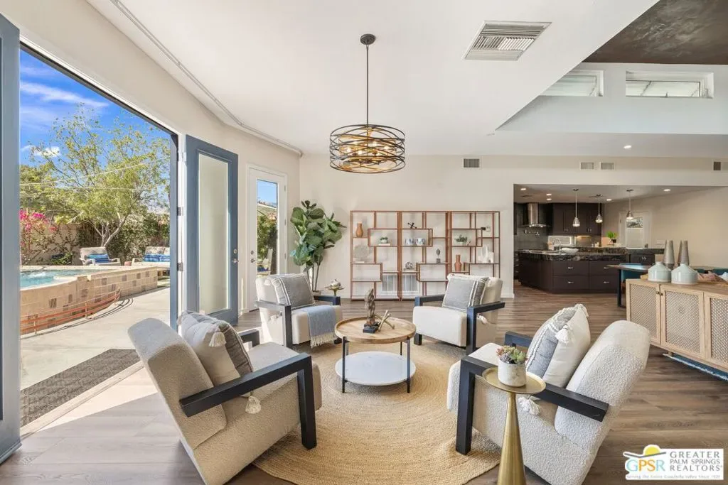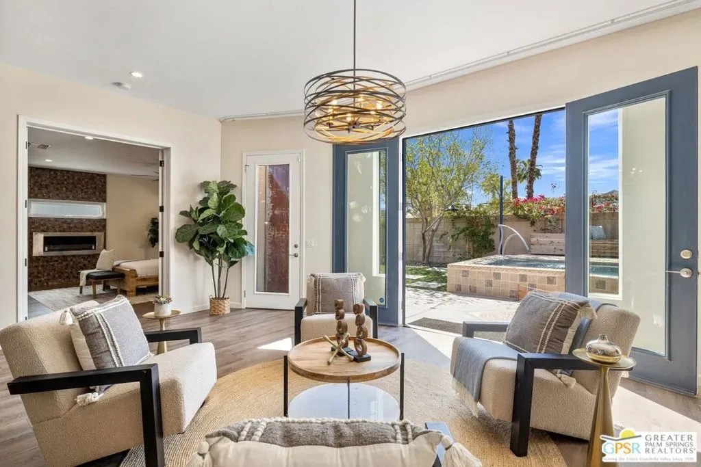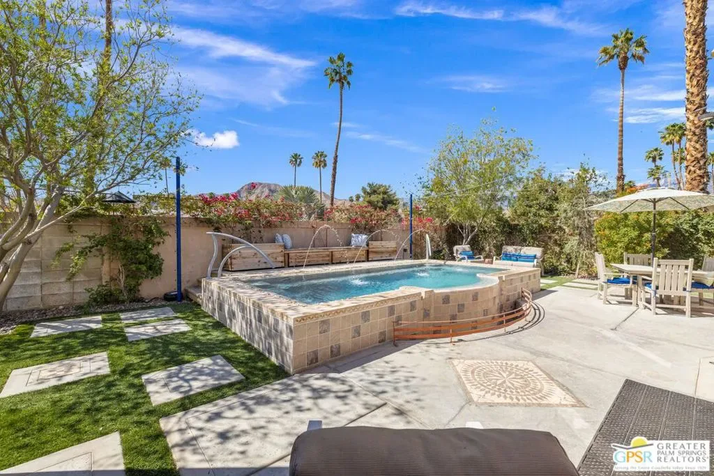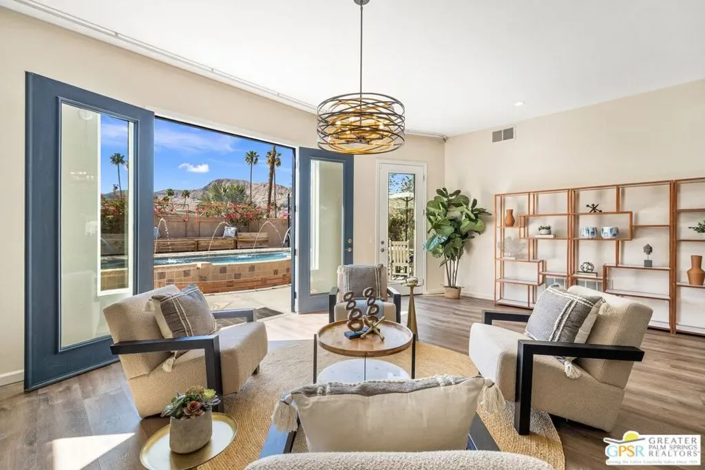WOW! Check out this FANTASTIC opportunity in Tamarisk Heights that is an ideal match for those seeking CONTEMPORARY LIVING in South Rancho Mirage! Located within minutes to restaurants, retailers, and multiple country clubs, this home has been FRESHLY STYLED UP! Key highlights include tall ceilings, clerestory windows, open floor plan, contemporary finishes and tile flooring throughout, great separation of bedrooms, and an ultra-private south-facing backyard that includes a private saline pool, mature landscaping, and views of the surrounding mountains! Fresh interior paint plus recent system upgrades including a HVAC unit and tankless water heater. No land lease and no HOA fee, either! Custom-designed front door and formal entry with clerestory windows work to create a scene of magic that continues into the grand Great Room that features tall ceilings, eight clerestory windows, mountain views, and three sets of doors that open to the south-facing backyard that is anchored by a refreshing pool with custom water features. Adjacent kitchen, which looks into the Great Room, includes contemporary cabinets, stainless appliance suite including gas range with pot filler, and an oversized detached island with stainless steel farm sink and built-in counter bar ideal for both casual living as well as entertaining! This IS the floor plan for people who love to entertain! Primary Ensuite has been styled up with a fireplace, large walk-in closet, and private contemporary bath with dual sinks, quartz counters, large walk-in shower with four showerheads, and a separate jetted tub. A true SPA experience! On the other side of the house is Junior Ensuite Two with clerestory window, access to the outside, and a private bath that includes a walk-in shower. Separate powder/guest bath, too! Don’t miss out on this incredible opportunity in Tamarisk Heights!