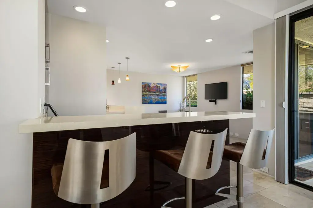 Situated on a desirable corner lot, this property offers mountain views from each patio along with its highly sought-after Shaughnessy floorplan, celebrated at The Springs for its open layout, natural light, and exceptional indoor-outdoor flow. The residence has been thoroughly updated and recently repainted, providing a clean and welcoming environment.The expansive great room is enhanced by a fireplace, creating an inviting space for both relaxation and social gatherings. The home features three en-suite bedrooms, for families or accommodating guests. The gourmet kitchen is equipped with Caesarstone countertops, stainless steel appliances, and thermofoil cabinetry, delivering a modern and sophisticated aesthetic.Significant upgrades include a new HVAC system installed in 2024 and a new roof completed in 2025, ensuring long-term comfort and reliability. The 3-car garage includes an EV charger, 2 car spaces, and a golf cart garage.The Springs Country Club HOA includes a Social Club Membership, sports, and fitness – Tennis and Pickleball courts and Bocce courts, Cable/internet, roof replacement/maintenance, and exterior painting. Common area landscaping, including planting areas in front of the home. Maintenance grounds, game room and 24-hour gate and home alarm monitoring systems.