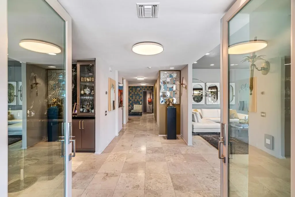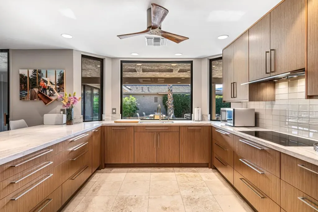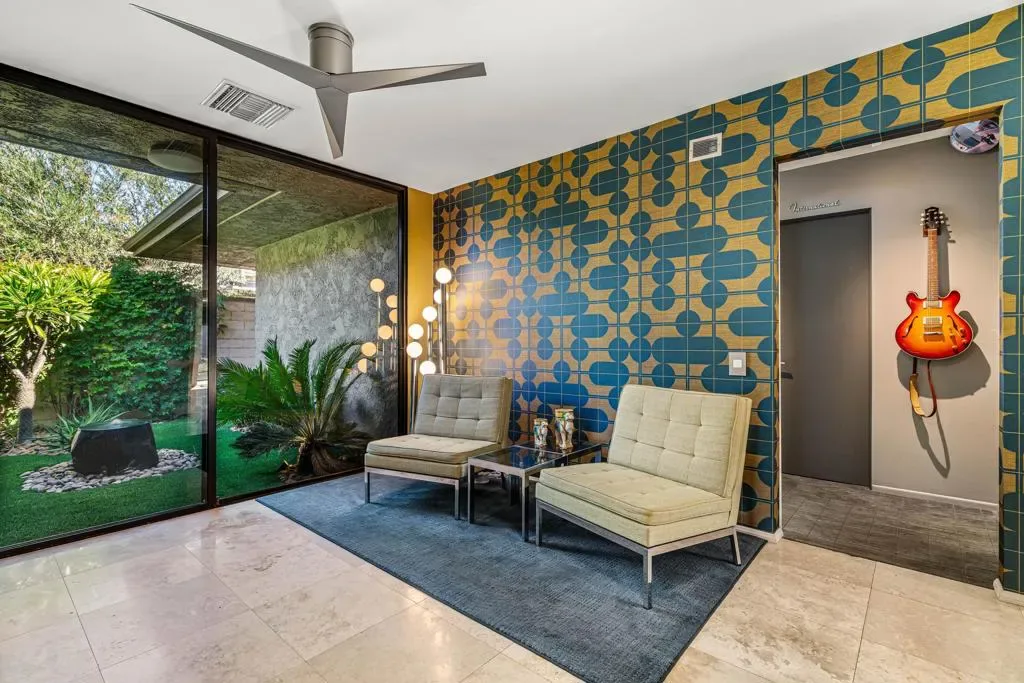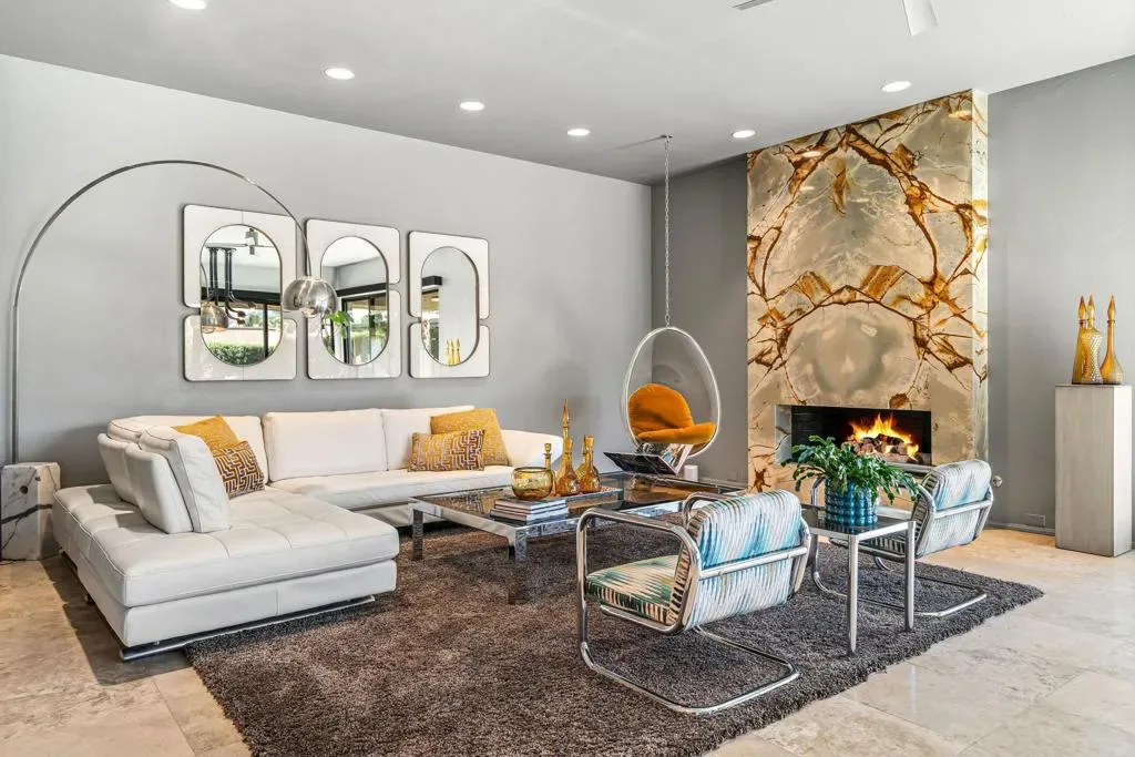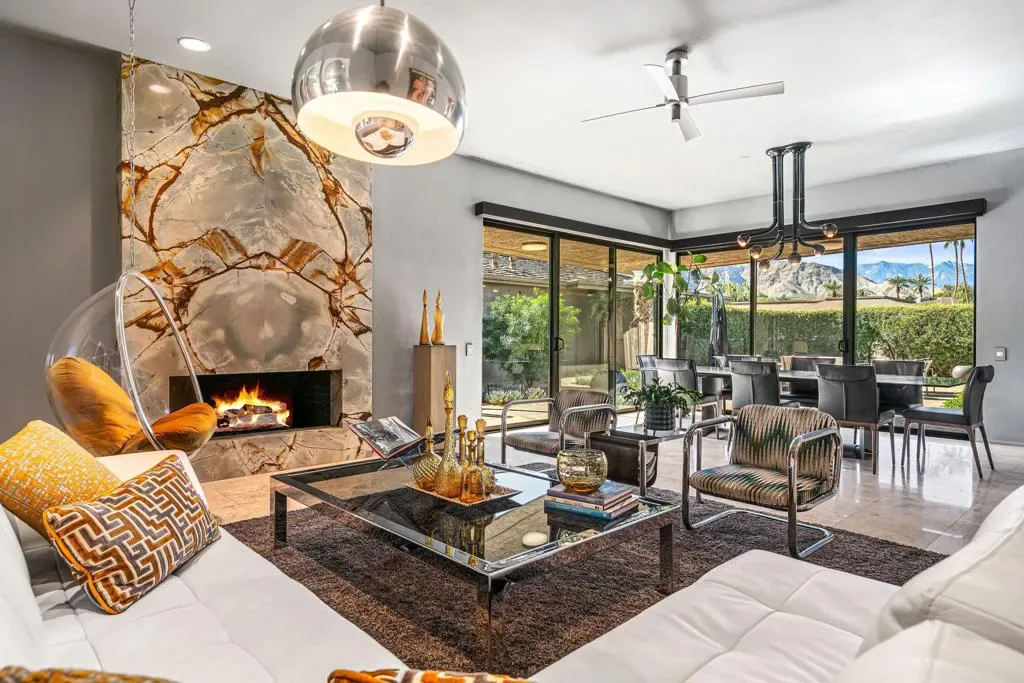 This stand-alone home has no attached neighbors. And although a 3-bedroom, it includes an additional large office space. Fully furnished with collectible mid century pieces, Jonathan Entler Chandelier, Natuzi sectional, custom bar and amazing kitchen.Full Miele kitchen with 2-dishwashers, wall mounted espresso machine, induction cooktop, convection oven and steam oven. Custom bar for entertaining and open floor plan. With custom stone, ice maker, insta-hot faucet and lux barstools.Open plan gives light and sight lines of mountain views and Sunnylands-style desert landscaping. Leased solar, skylights and on-demand hot water all add to energy efficiency.Along with the 3-ensuite bedrooms, you’ll see a lovely office space with garden featuring a fountain. Design continuity throughout. High quality, thoughtful materials. Statement fireplace and Johnathan Entler dining chandelier over 10′ table invite guests to enjoy the views while the sunsets.2-car attached garage, golf cart garage and built-in storage. A mix of mid century, 70s glam, and modern furniture add to the fun spirit of desert life.