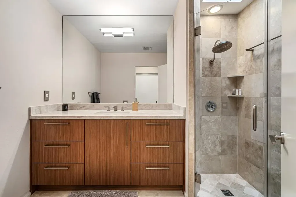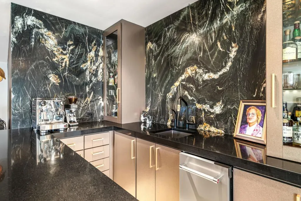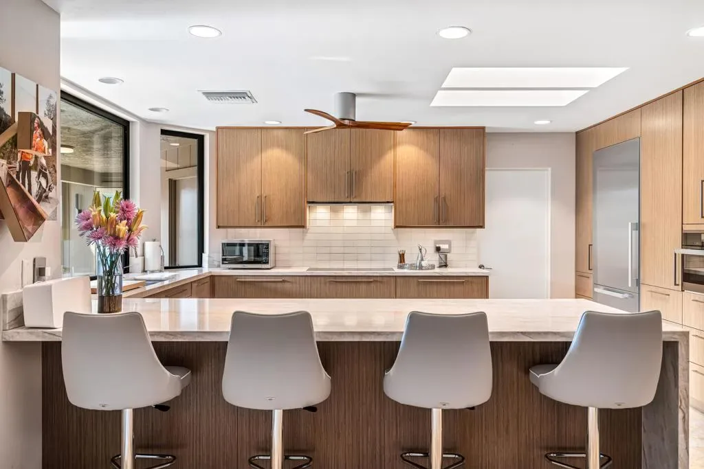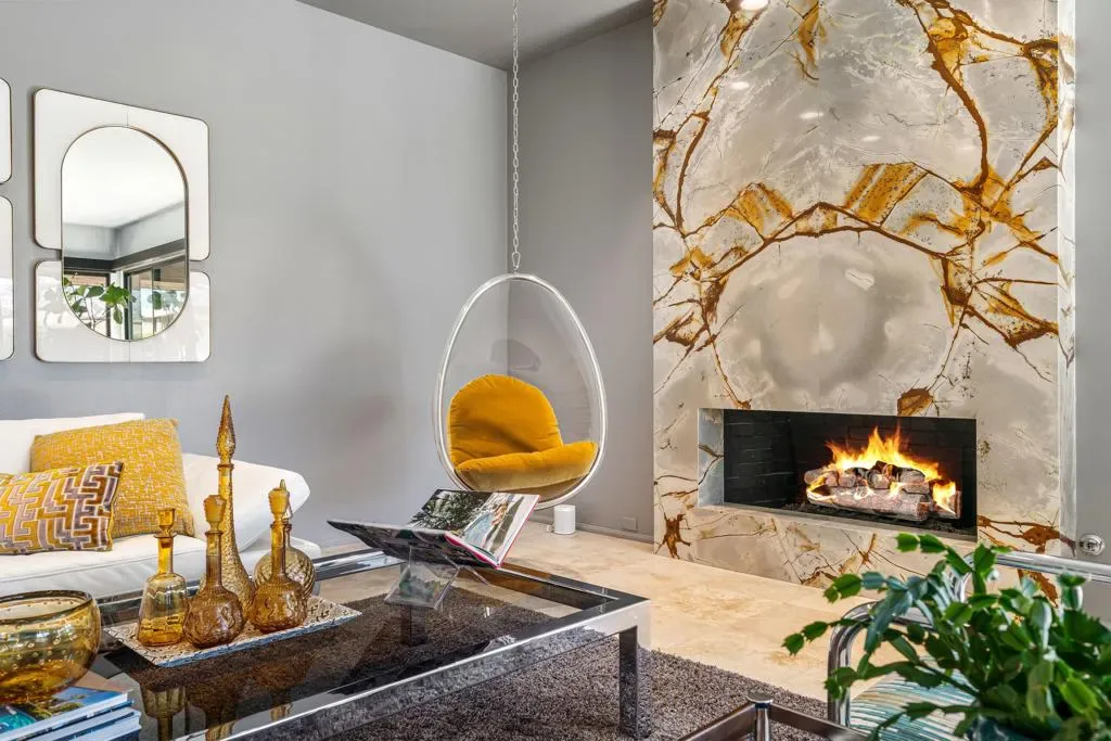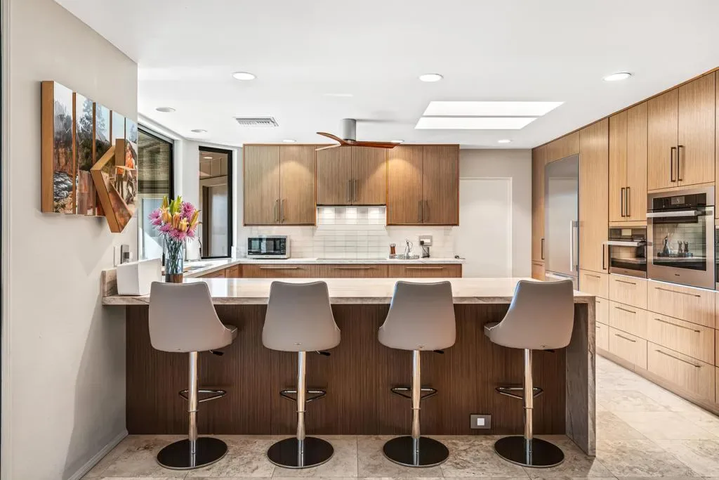 This stand-alone home has no attached neighbors. And although a 3-bedroom, it includes an additional large office space. Fully furnished with collectible mid century pieces, Jonathan Entler Chandelier, Natuzi sectional, custom bar and amazing kitchen.Full Miele kitchen with 2-dishwashers, wall mounted espresso machine, induction cooktop, convection oven and steam oven. Custom bar for entertaining and open floor plan. With custom stone, ice maker, insta-hot faucet and lux barstools.Open plan gives light and sight lines of mountain views and Sunnylands-style desert landscaping. Leased solar, skylights and on-demand hot water all add to energy efficiency.Along with the 3-ensuite bedrooms, you’ll see a lovely office space with garden featuring a fountain. Design continuity throughout. High quality, thoughtful materials. Statement fireplace and Johnathan Entler dining chandelier over 10′ table invite guests to enjoy the views while the sunsets.2-car attached garage, golf cart garage and built-in storage. A mix of mid century, 70s glam, and modern furniture add to the fun spirit of desert life.