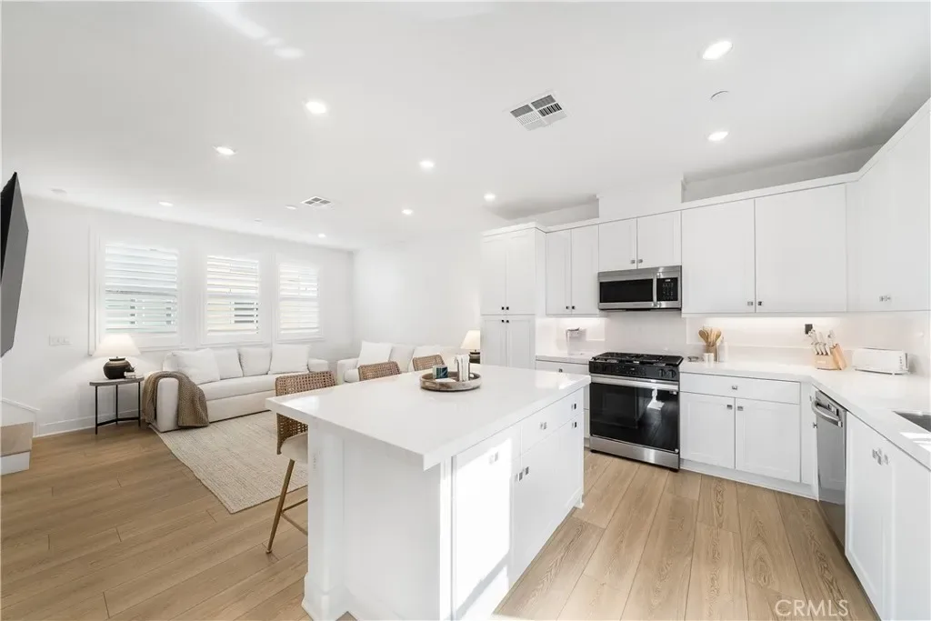 Experience modern living at it’s best in this three-level townhome located in the desirable Mariposa neighborhood of Rancho Mission Viejo. The entry level features a convenient one car garage with epoxy flooring and plantation shutters. The main level showcases an open-concept layout that seamlessly connects the kitchen and family room, creating the perfect space for everyday living and entertaining. This home is equipped with designer upgrades including vinyl flooring, plantation shutters, stainless appliances, quartz counter tops and white cabinets. Upstairs is the laundry room and private owners suite, featuring a large bathroom and walk-in closet.