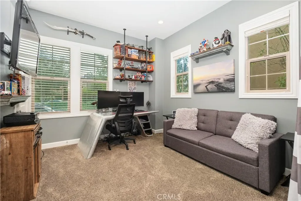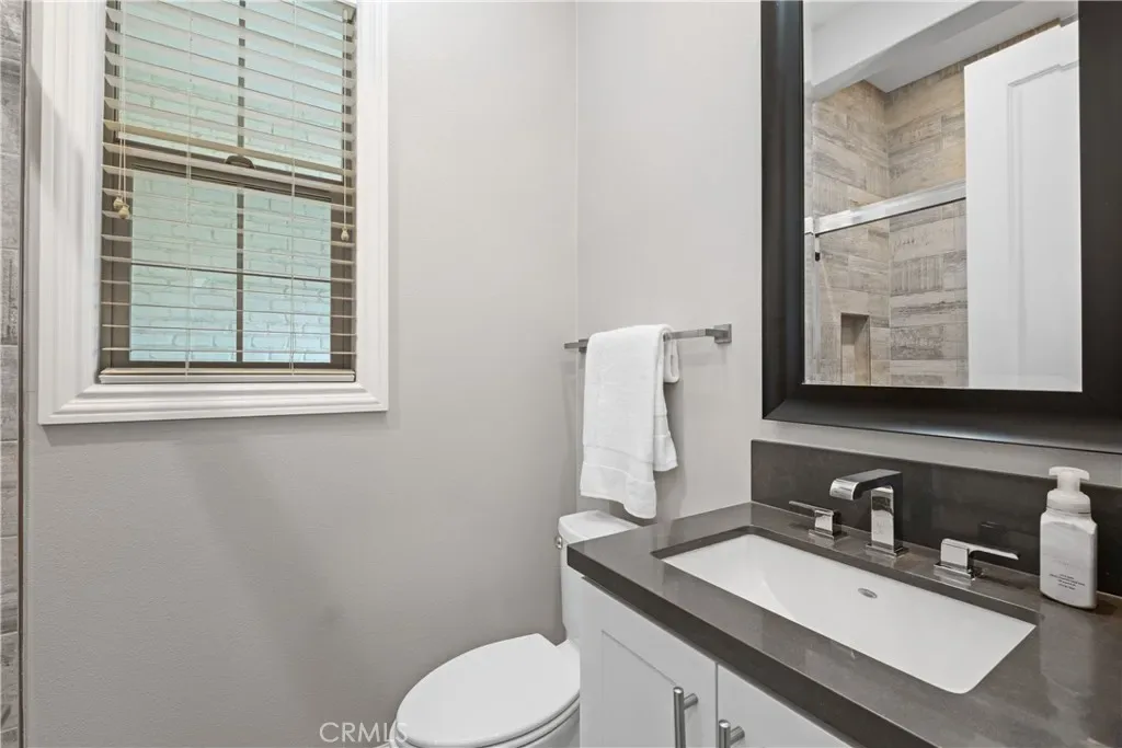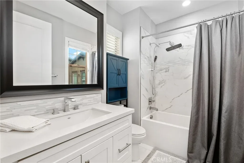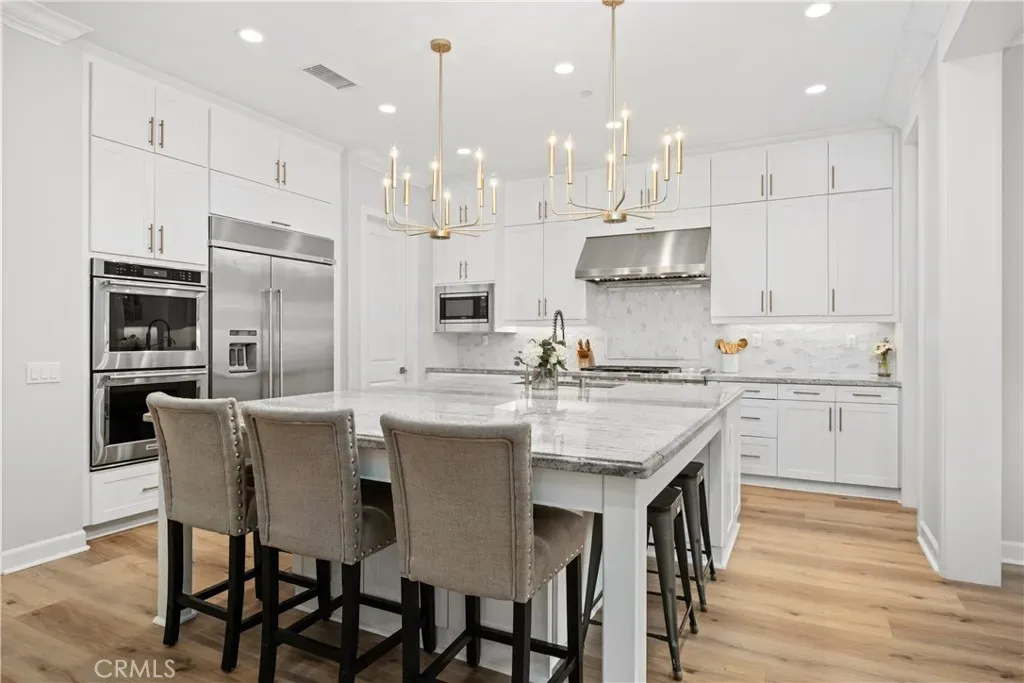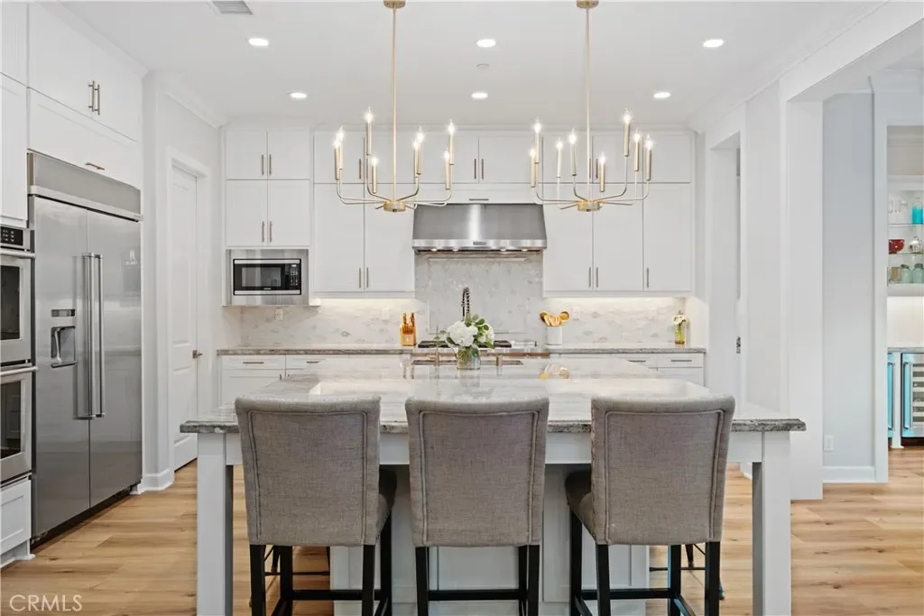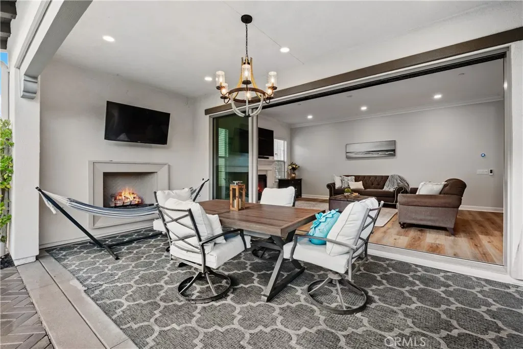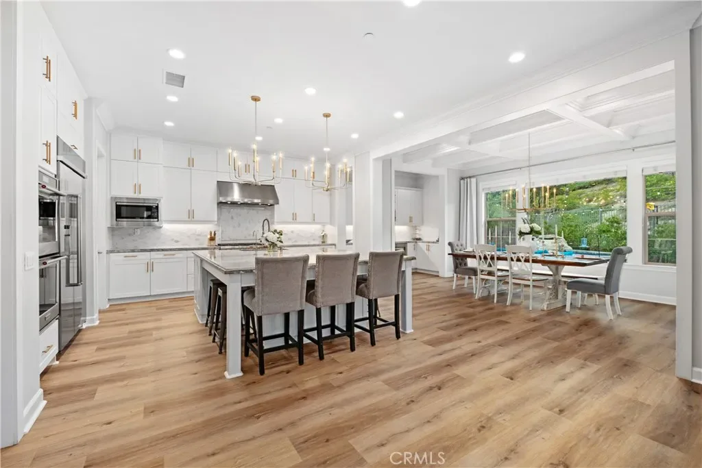 Nestled within the coveted Esencia community of Rancho Mission Viejo, this exceptional 5-bedroom, 5.5-bath Aubergine Plan 3 residence has been thoughtfully upgraded and meticulously designed. Refreshed with new exterior paint, the home offers impressive curb appeal. A charming courtyard welcomes you and separates the home from the casita, ideal as an office or guest suite with its own entrance, newer AC, and full bathroom. Inside, wainscoting frames the grand staircase and elegant foyer. Fresh interior paint and new luxury vinyl flooring on the first level create a bright, contemporary aesthetic. Every window features custom casing, complemented by 10″ crown molding and dimmable smart switches. A flexible downstairs den offers endless possibilities. The open-concept living space is the heart of the home, where the kitchen seamlessly connects to the family and dining areas. The kitchen showcases white cabinetry with new champagne gold hardware, an oversized granite island, and premium stainless-steel appliances including a built-in refrigerator, double oven, 6-burner cooktop, and microwave. Coffered ceilings and new chandeliers elevate the dining area, while the extended dry bar has dual beverage refrigerators. A walk-in pantry and timeless backsplash complete the space. Stackable sliders open to a serene California room, where you can enjoy fireplaces both inside and out. The private backyard features low-maintenance turf with app-controlled sprinklers, pavers, apple trees, and a saltwater pebble tech spool with waterfall and fire pit. Upstairs, the primary suite offers beautiful views and a coffered ceiling. The upgraded bathroom includes herringbone tile flooring, marble countertops, a soaking tub, walk-in shower, and dual walk-in closets. Three additional bedrooms—two with ensuite baths—plus a hallway bath, laundry room, and bonus/movie room complete the upper level. The bonus room includes projector wiring, 5.1 surround sound, and movie screen paint creating a 115″ viewing wall. Additional highlights include a 3-car garage with epoxy flooring, overhead storage, and two prewired EV outlets. The home also features two tankless water heaters and fully paid solar panels for energy efficiency. Residents enjoy top-rated schools and resort-style amenities including pools, spas, playgrounds, fitness centers, tennis and pickleball courts, bocce ball, an arcade, and more—offering an unparalleled lifestyle in one of Orange County’s most desirable communities.