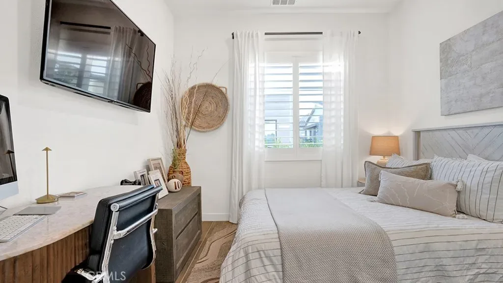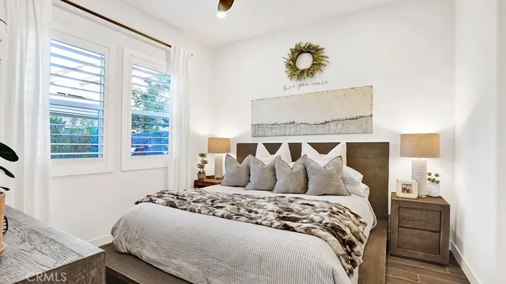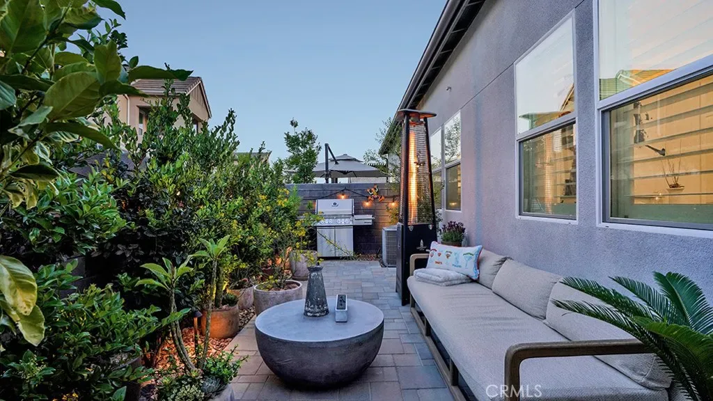 833 Sunrise Road is a single story condo that lives like an SFR in the 55+ age restricted community of Haven within Gavilan of Rancho Mission Viejo. Built in 2023, this home is tastefully upgraded with high end finishes throughout. Showcasing approximately 1,112 sqft with two bedrooms, two bathrooms, fully paid for solar, central AC, a tankless water heater, dual pane windows, a large backyard with beautiful mature landscaping and a two car direct access garage with custom epoxy flooring and overhead storage as well as built in storage cabinetry. As soon as you walk into your new home, you’ll notice the porcelain tile wood style flooring throughout as well as solid wood plantation shutters, which were both builder upgrades. Your chef’s kitchen has white shaker cabinetry with soft close hinges, quartz countertops, modern subway tile backsplash, stainless steel appliances and a large kitchen island with an oversized sink. The living room has a ceiling fan and plenty of windows that overlook the side yard. The dining room is very spacious and has access to the backyard via a sliding glass door that has custom vertical blinds. The primary bedroom has a ceiling fan and an ensuite bathroom with dual sinks, quartz countertops, a walk in glass shower and a spacious walk in closet. The guest bedroom also has a ceiling fan and a closet. The guest bathroom is in the hallway by the guest bedroom and features a quartz vanity with a tiled shower tub combo. The laundry area has side by side appliances with additional cabinetry nearby. Your gorgeous backyard has a custom built in gas fireplace, mature landscaping with custom landscaping lights around the entire perimeter and pavers throughout for easy maintenance. The front yard also has mature landscaping with custom landscaping lights. Enjoy all of Rancho Mission Viejo’s HOA amenities including multiple pools, spas, gyms, parks, sport courts, playgrounds as well as the 55+ exclusive amenities. Haven has their own saltwater pool, spa and entertainment complex just down the street. All 55+ residents will also have access to the future clubhouse and pool being built in the Gavilan Ridge opening later this year.