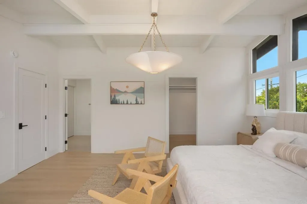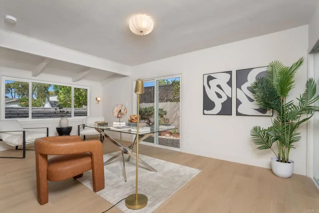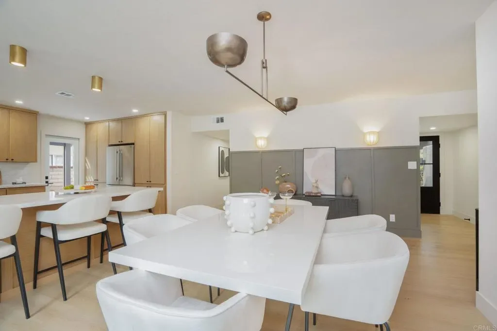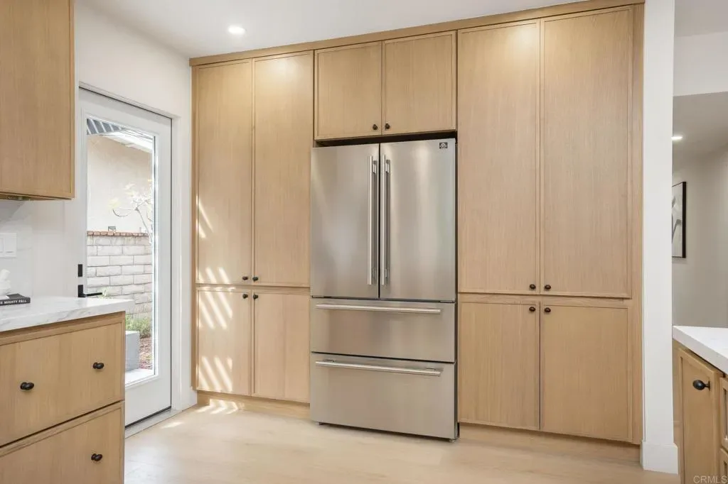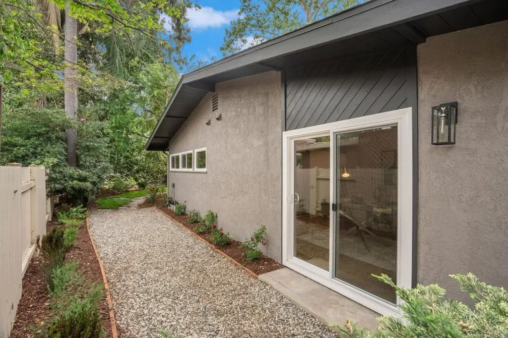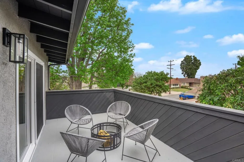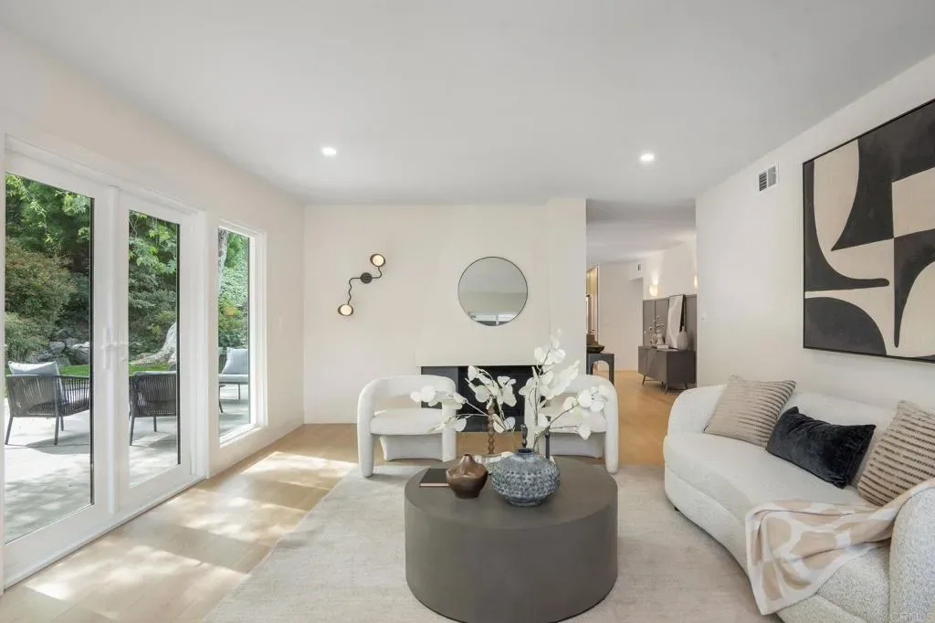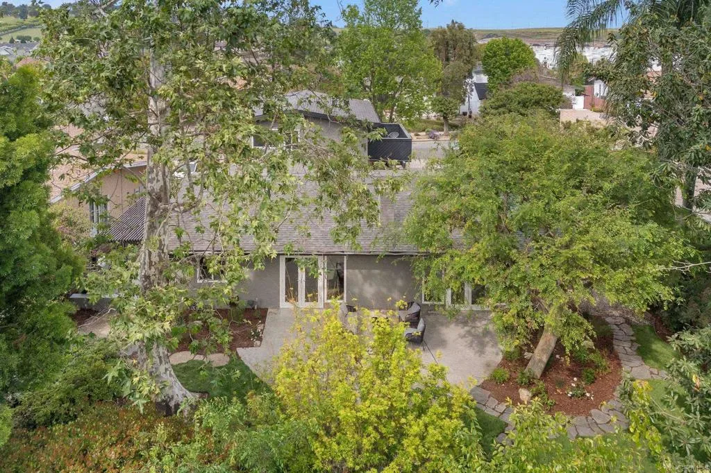 This top-to-bottom renovation of a two-story mid-century modern in Rancho Palos Verdes has been thoughtfully reimagined. A bold stucco-and-black-wood facade, new roof, and white oak-toned plank flooring throughout set the tone for what’s inside. A sunlit living room with a plaster-surround fireplace, picture windows, and French doors opening to the backyard anchors the main floor. The open-concept kitchen and dining area is the heart of it all — white oak cabinetry with black hardware, Calacatta quartz countertops and full-slab backsplash, professional-grade range with pot filler, and a generous island beneath gold pendants and a botanical wallpaper accent. Upstairs, the primary suite feels like a private retreat — vaulted shiplap ceilings, a balcony with treetop views, and a spa-caliber en-suite with a freestanding soaking tub against a brick accent niche, rain shower with hand-textured plaster walls, and a white oak vanity with Calacatta countertops and shiplap-framed mirror wall. Every bathroom has been renovated with designer tile and curated fixtures. Outside, a rear patio flows beneath a black pergola to an outdoor kitchen with built-in grill, while a landscaped lawn stretches under mature trees bordered by roses. Close proximity to Terranea Resort, Point Vicente Lighthouse, coastal trails, and top rated schools — make this one of the South Bay’s most coveted addresses.