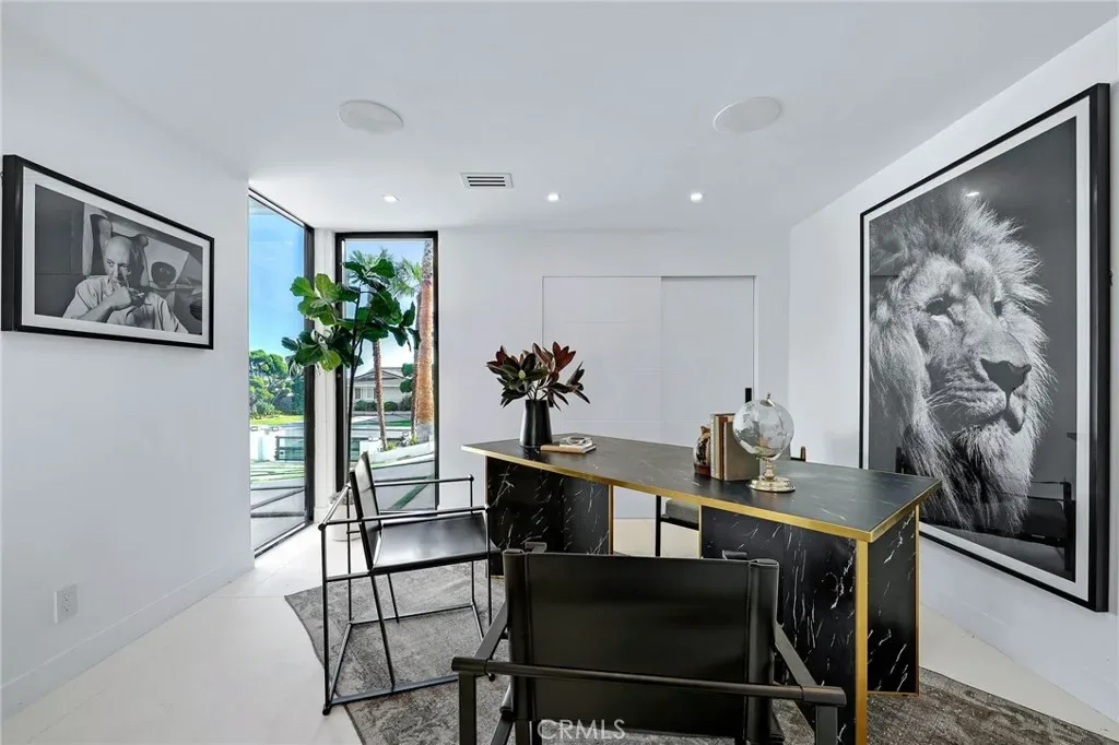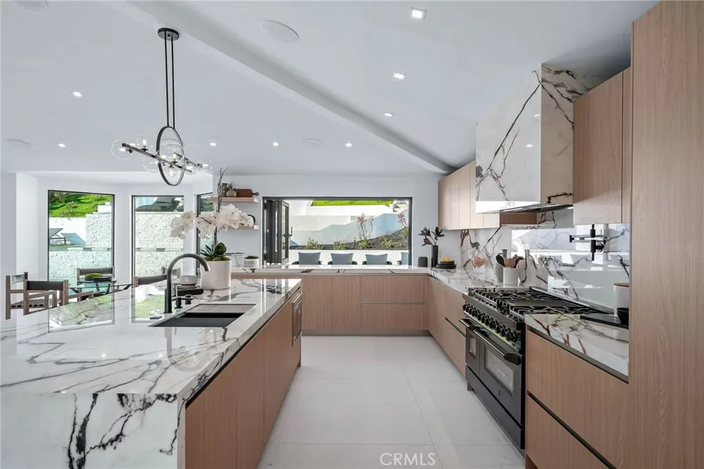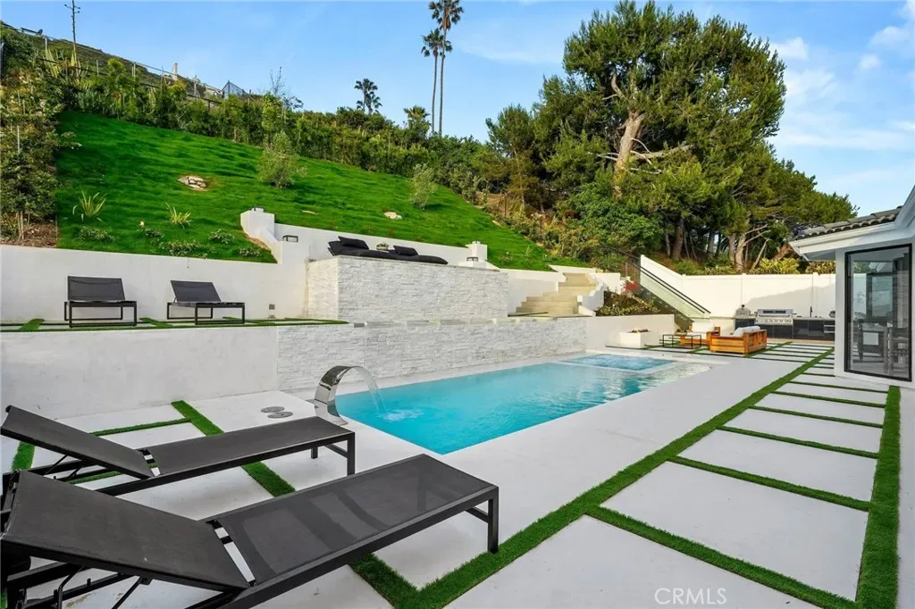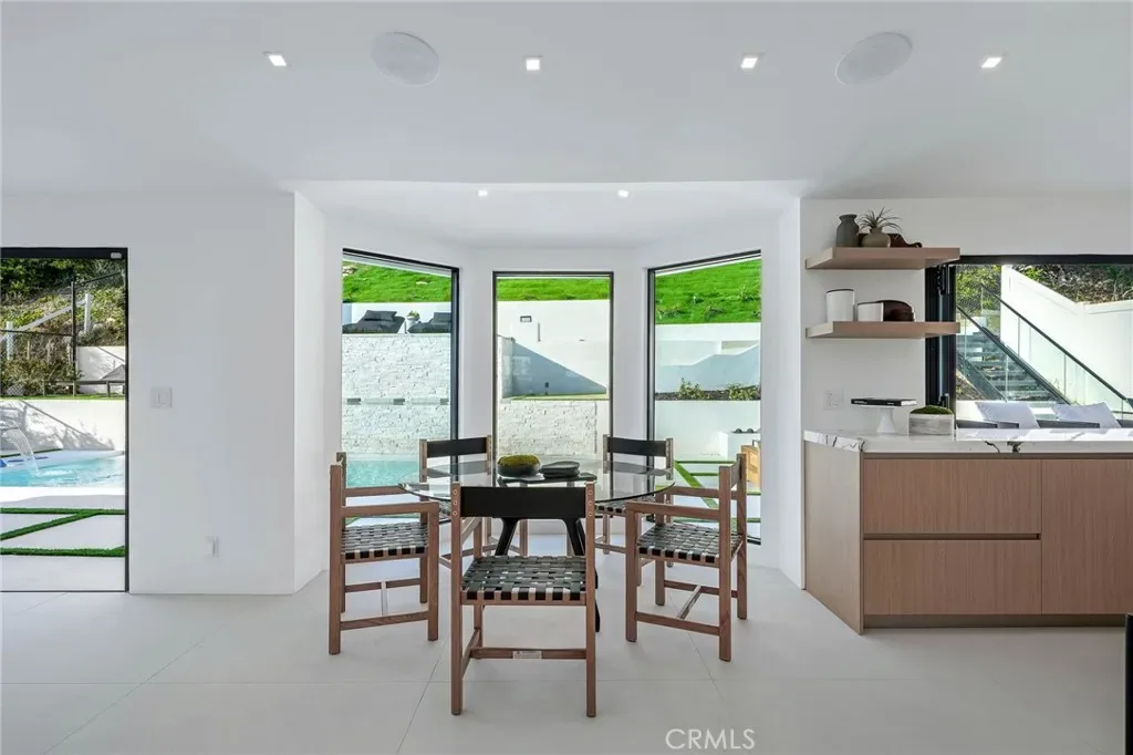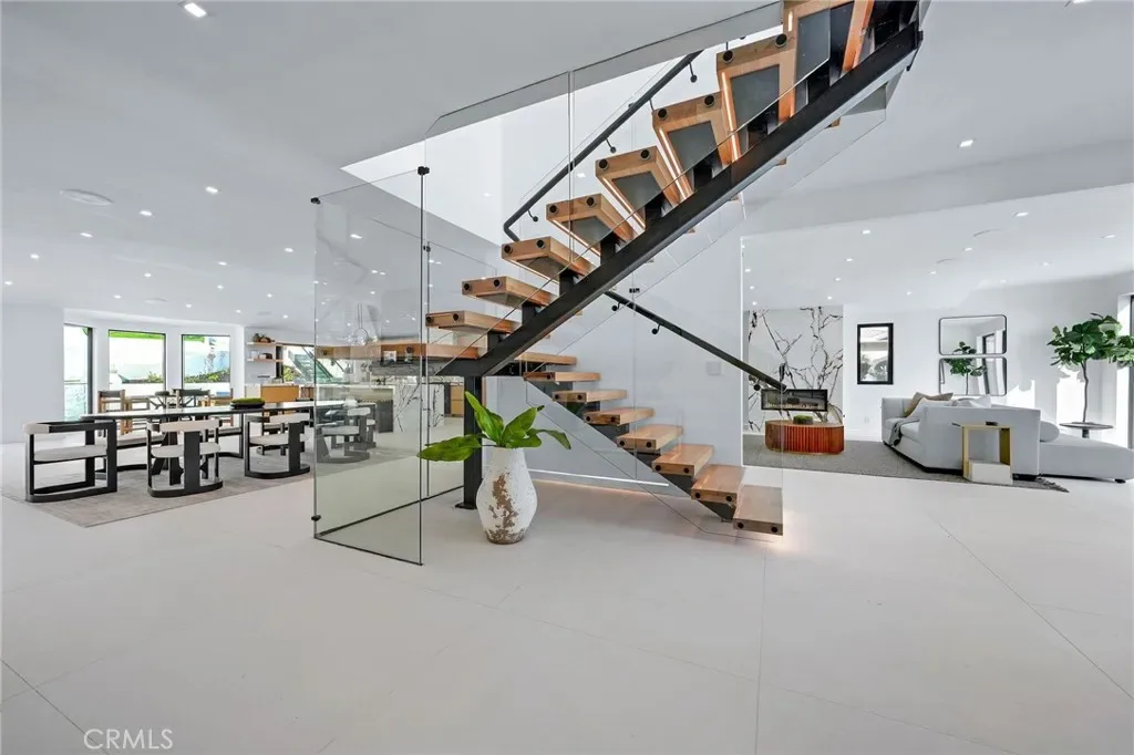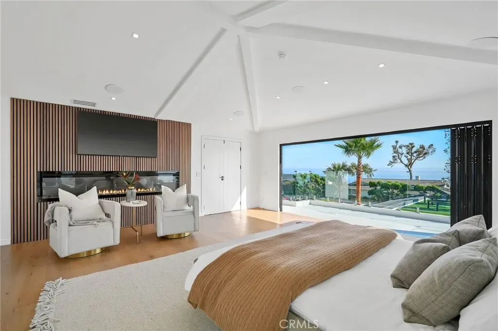 Perched above the coastline with sweeping ocean and Terranea Resort views, the property is an exquisitely designed and thoughtfully curated contemporary residence just moments from a world-class, Pete Dye-designed golf course. Entering the main level, the home unfolds through a light-filled open floor plan defined by vaulted beamed ceilings, Italian porcelain flooring, and expansive windows that frame the coastal backdrop. At the heart of the home, a custom Snaidero kitchen appointed with Thermador appliances features a large center island with breakfast bar seating, complemented by a sunlit breakfast nook surrounded by floor-to-ceiling windows. The kitchen flows seamlessly into the dining area and rear family room, where sliding glass doors open to the backyard, creating a natural extension of indoor-outdoor living. A custom wet bar sits adjacent to the dining space, enhancing the home’s effortless entertaining design. A striking glass and steel staircase serves as an architectural focal point, connecting the home’s two levels with a refined modern presence. The main level offers three en-suite bedrooms, a dedicated home office, and a temperature-controlled wine cellar. Upstairs, the primary suite provides a private retreat with a fireplace, spa-inspired bath, dual walk-in closets, and an oversized terrace with sweeping ocean views. An additional en-suite bedroom features its own private balcony, capturing the same panoramic views of the Pacific. Designed for both relaxation and entertaining, the resort-style backyard includes a pool and spa, outdoor kitchen, fire pit, and lush landscaping, offering a true lifestyle experience. A versatile converted flex space with new flooring and custom cabinetry is ideal for a home office, gym, or studio, while still offering the flexibility to be used for parking if desired. Additional features include smart home integration, built-in audio, and thoughtfully executed modern finishes. A rare convergence of design, setting, and lifestyle, the home offers a seamless indoor-outdoor living experience against a sensational coastal backdrop.
