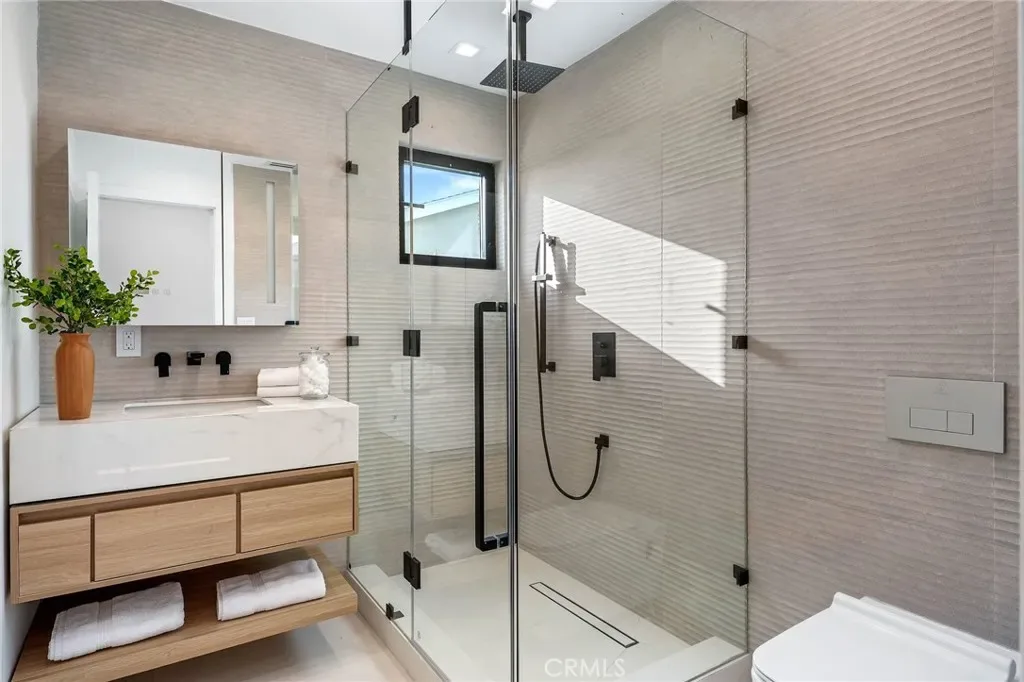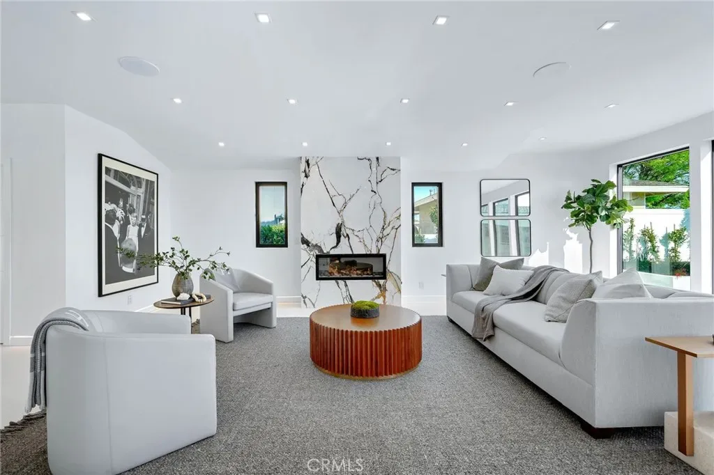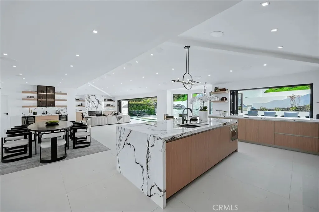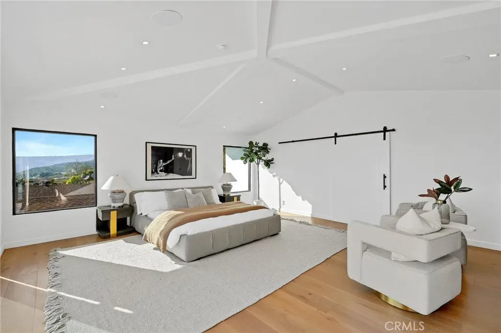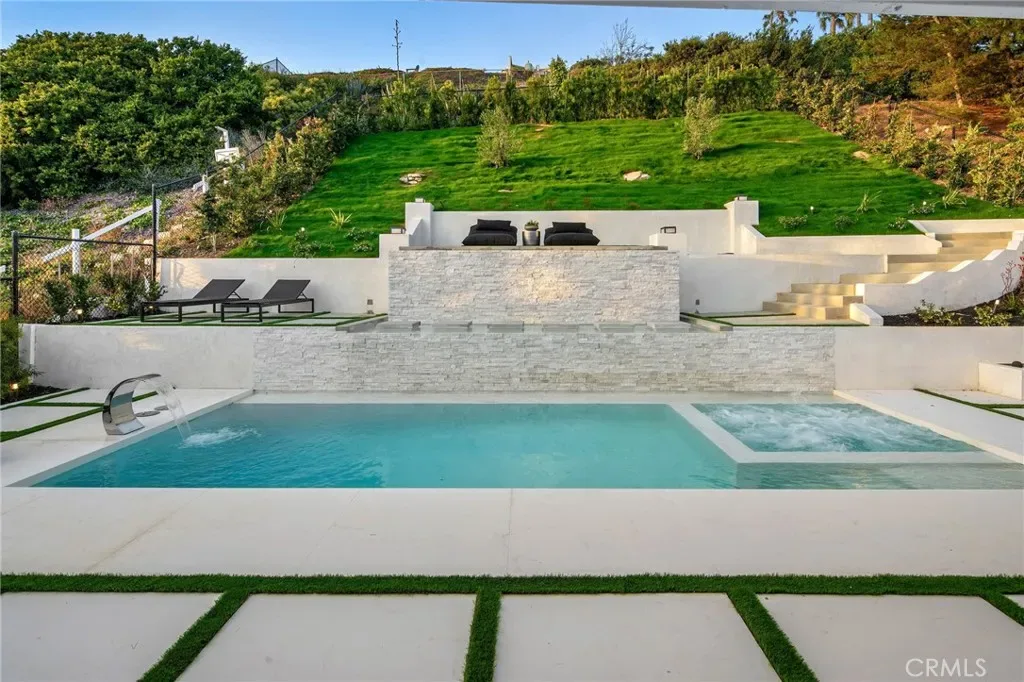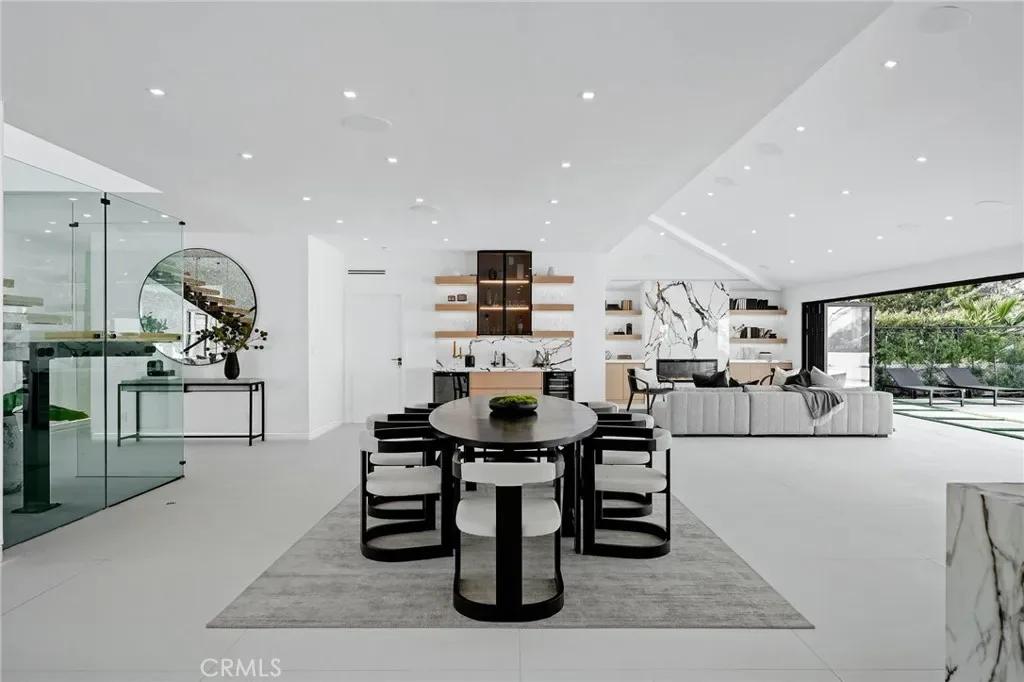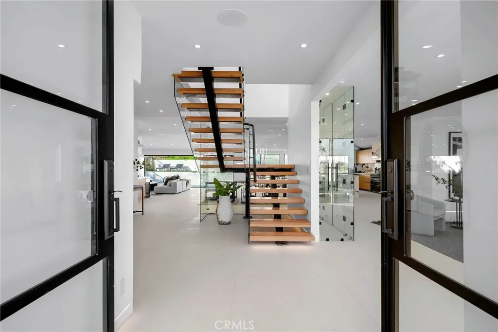 Perched above the coastline with sweeping ocean and Terranea Resort views, the property is an exquisitely designed and thoughtfully curated contemporary residence just moments from a world-class, Pete Dye-designed golf course. Entering the main level, the home unfolds through a light-filled open floor plan defined by vaulted beamed ceilings, Italian porcelain flooring, and expansive windows that frame the coastal backdrop. At the heart of the home, a custom Snaidero kitchen appointed with Thermador appliances features a large center island with breakfast bar seating, complemented by a sunlit breakfast nook surrounded by floor-to-ceiling windows. The kitchen flows seamlessly into the dining area and rear family room, where sliding glass doors open to the backyard, creating a natural extension of indoor-outdoor living. A custom wet bar sits adjacent to the dining space, enhancing the home’s effortless entertaining design. A striking glass and steel staircase serves as an architectural focal point, connecting the home’s two levels with a refined modern presence. The main level offers three en-suite bedrooms, a dedicated home office, and a temperature-controlled wine cellar. Upstairs, the primary suite provides a private retreat with a fireplace, spa-inspired bath, dual walk-in closets, and an oversized terrace with sweeping ocean views. An additional en-suite bedroom features its own private balcony, capturing the same panoramic views of the Pacific. Designed for both relaxation and entertaining, the resort-style backyard includes a pool and spa, outdoor kitchen, fire pit, and lush landscaping, offering a true lifestyle experience. A versatile converted flex space with new flooring and custom cabinetry is ideal for a home office, gym, or studio, while still offering the flexibility to be used for parking if desired. Additional features include smart home integration, built-in audio, and thoughtfully executed modern finishes. A rare convergence of design, setting, and lifestyle, the home offers a seamless indoor-outdoor living experience against a sensational coastal backdrop.