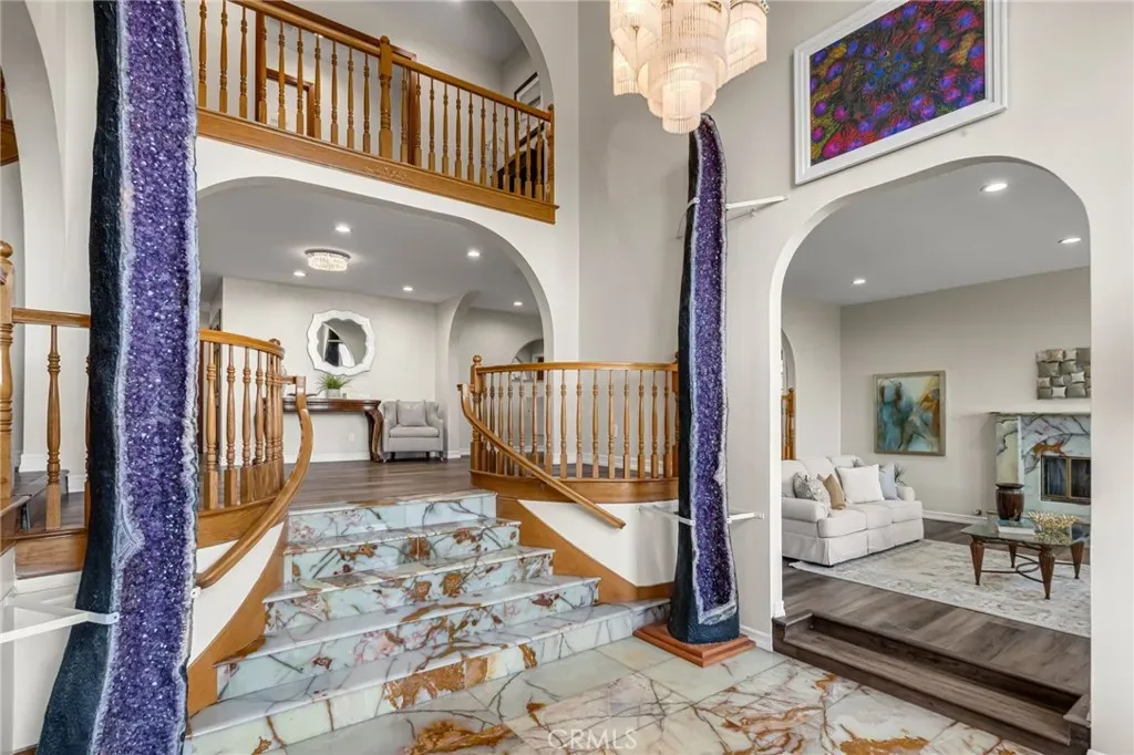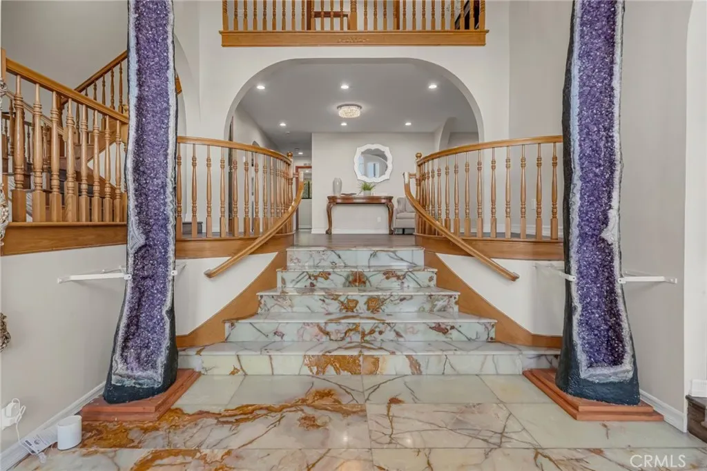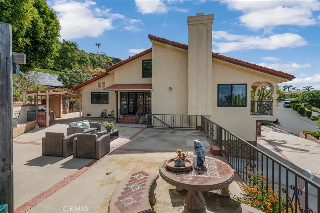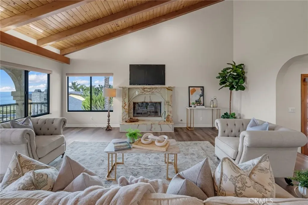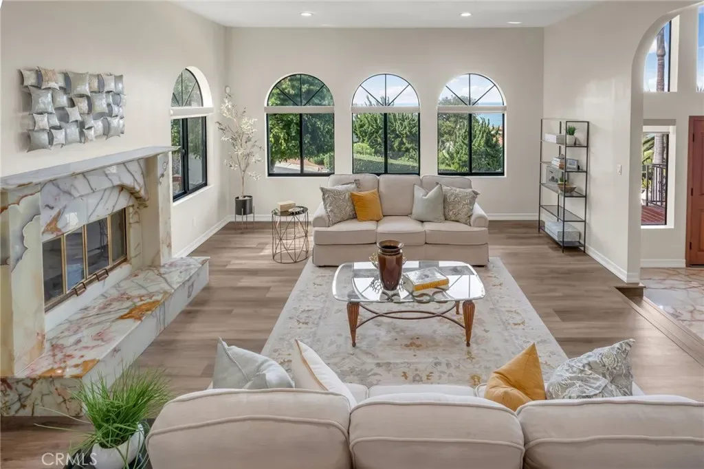 Perched above the Pacific coastline in a private cul-de-sac of just 8 residences, across from Trump National Golf Club, this custom-built estate captures mesmerizing views of the Pacific Ocean and a close and remarkably view of the Catalina Island from multiple vantage points. A concrete and brick-paved driveway leads to a grand double-door entry, opening to a dramatic two-story landing and split-level layout designed to maximize natural light and breathtaking vistas. Inside, the house has been updated throughout the years with wood floor, recessed lights, a remodeled kitchen, bathrooms and powder room. The living room features a fireplace and a wall of garden windows framing the Pacific. Meanwhile, the elevated formal dining room connects seamlessly to a remodeled chef’s kitchen with a breakfast nook, quartz countertops and abundant shaker-style cabinetry. A versatile bonus room next to the dining room offers flexibility as a tea room, office, or fitness space. The front-facing family room showcases soaring cathedral ceilings with exposed beams, a stately fireplace, wet bar with adjacent pantry, and French doors opening to a view balcony, perfectly positioned to take in stunning sunsets over Catalina Island. The private sleeping area includes an en-suite bedroom with walk-in closet, two additional spacious bedrooms each with its own adjacent bathroom, plus a powder room and storage. Occupying its own level, the ocean-facing primary suite is a true retreat, complete with a sitting area, fireplace, dual walk-in closets, and French doors opening to a large private view deck. The expansive primary bath offers dual vanities, a large shower, and a spa-like bath area with a freestanding tub. An additional private room provides ideal flexibility for a lounge, office, or gym. Set on appr. 32,000 sq ft, the outdoor spaces are equally impressive and designed to embrace the coastal backdrop. French doors from the kitchen and family room lead to a spacious view patio with BBQ kitchen, ideal for entertaining and al fresco dining against the ocean horizon. Ascending pathways reveal a large flat pad with potential for an ocean-view ADU, an upper-level view terrace, and a secluded sitting area at the top of the property, each offering serene, unobstructed views of the Pacific and Catalina Island. This is truly a rare opportunity to experience luxury coastal living with exceptional privacy, premier orientation, and seamless indoor-outdoor flow.