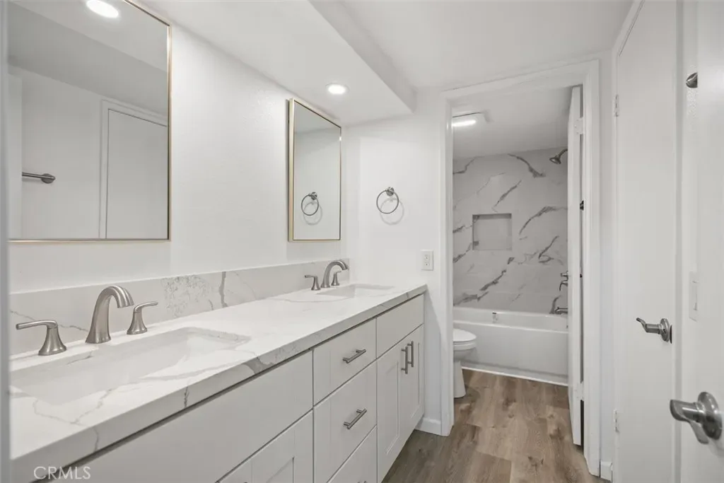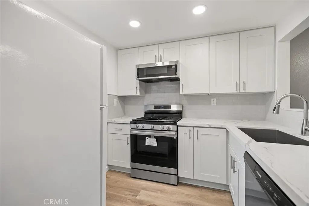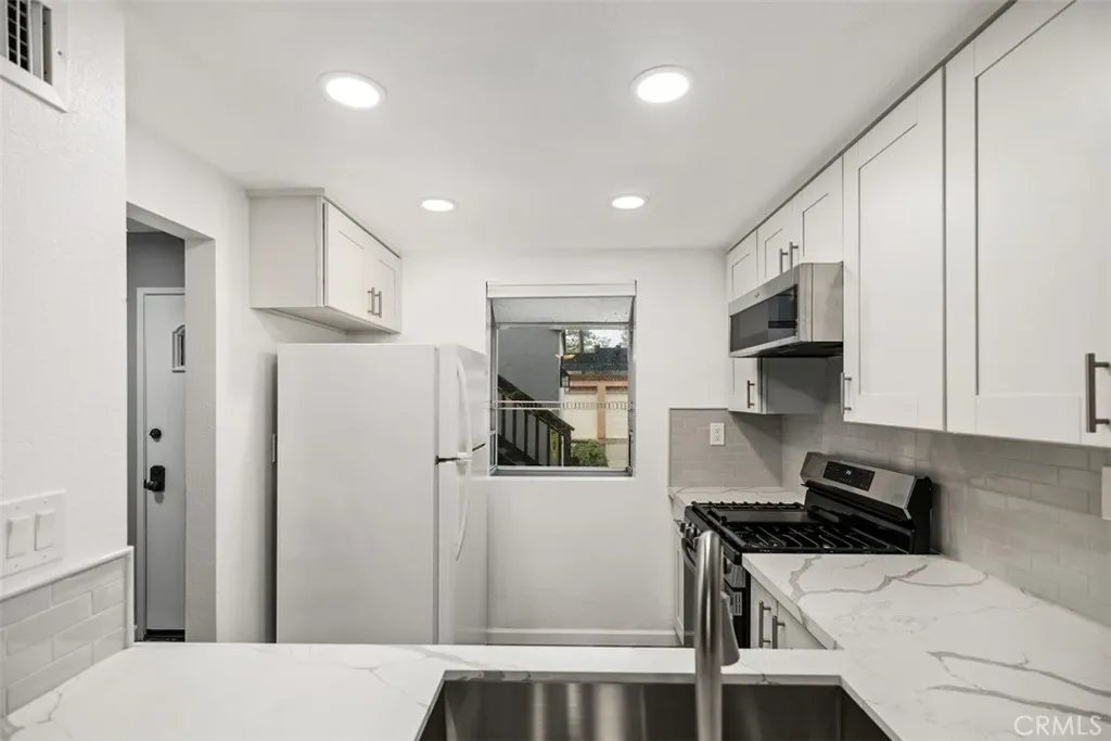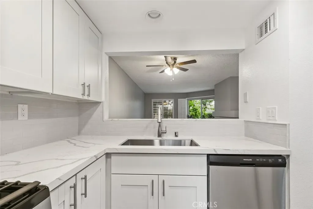 Lower level condo. Newly renovated in the Brisa Del Lago II of Rancho Santa Margarita. This 1 bedroom, 1 bathroom condo boasts a new kitchen with brand new appliances and stainless steel sink. Upgraded white cabinets and quartz countertops. Gas fireplace in living room/dining room. Bathroom has dual sinks, new cabinetry, and upgraded bath with grey tiles. Waterproof vinyl flooring throughout the home. Views of Rancho Santa Margarita Lake from private back patio. 1 car garage attached directly to unit and 1 carport spot as well. Community pool and spa, and walk to lake, shops, restaurants and more!