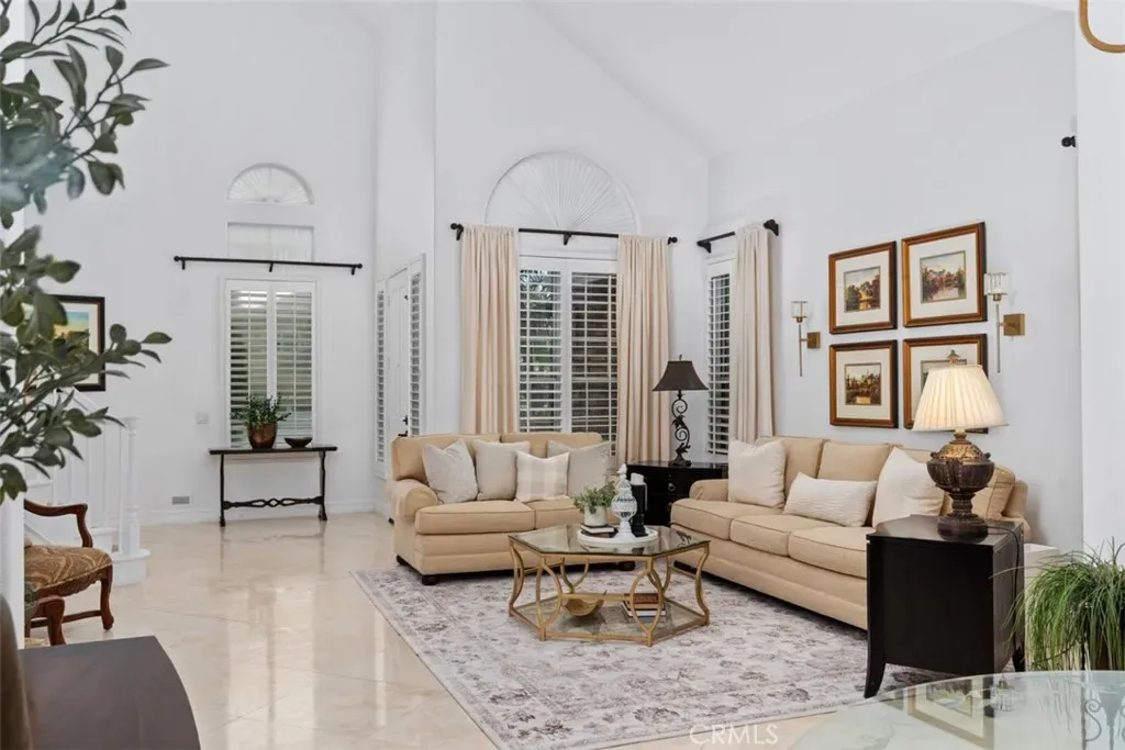 Upon entry, you are welcomed by soaring vaulted ceilings, abundant natural light, and a grand staircase. The main level features 24-inch polished travertine flooring throughout, complemented by plantation shutters. The remodeled kitchen features granite countertops, newer stainless steel appliances, a walk-in pantry, and opens seamlessly to the inviting family room with a fireplace and custom built-ins.