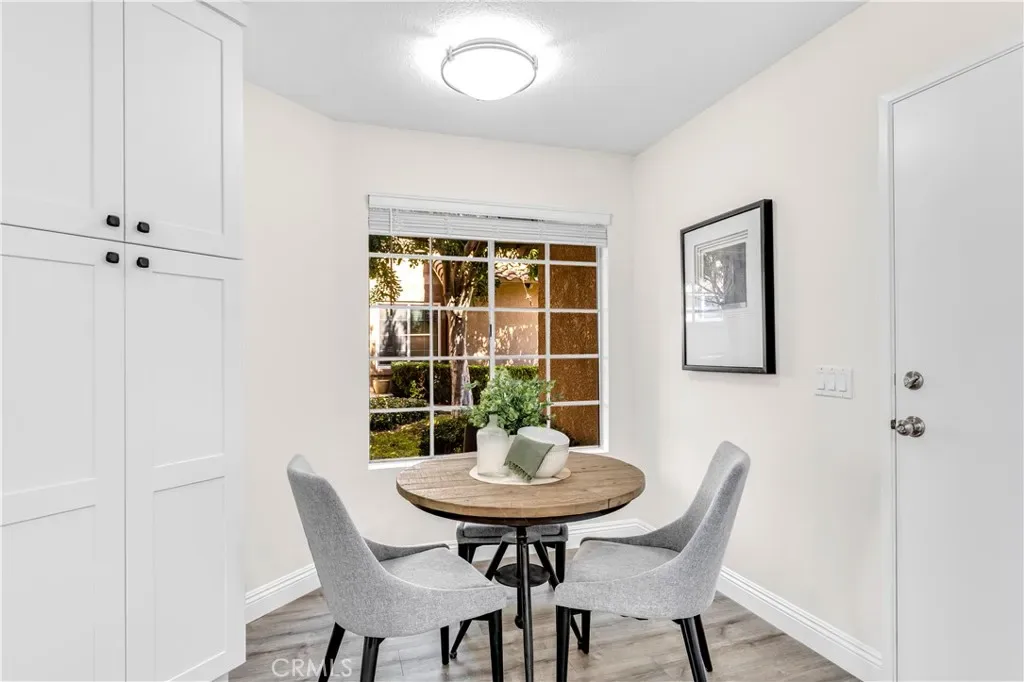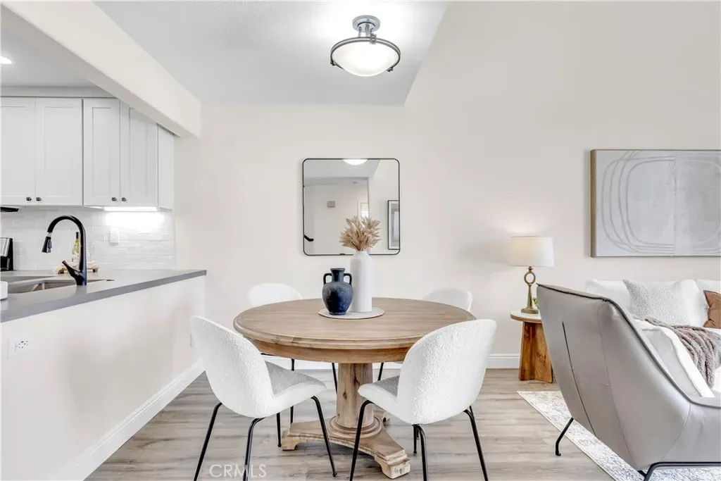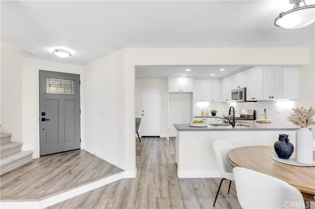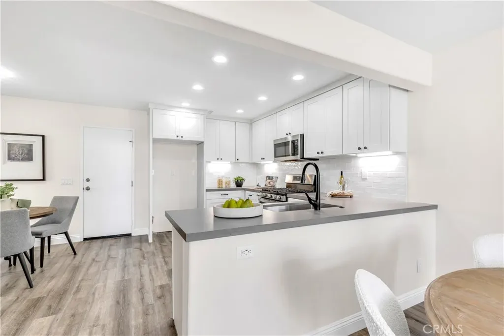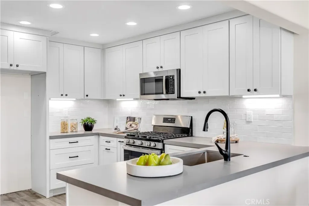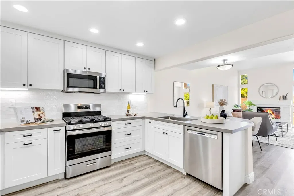 The expanded and remodeled kitchen showcases new cabinetry with soft close features, quartz countertops, stainless steel farm sink, 5 burner gas stove and oven, recessed lighting, and an large eating nook. The downstairs bedroom also has sliding glass doors with direct access to the backyard patio, is perfect for a home office or guest bedroom and is adjacent to a full bathroom. Step outside to a large, sunny backyard with hillside views and enjoy the perfect weather Rancho Santa Margarita offers.
