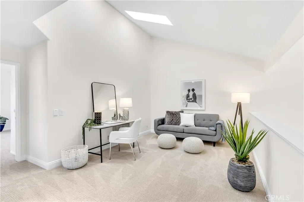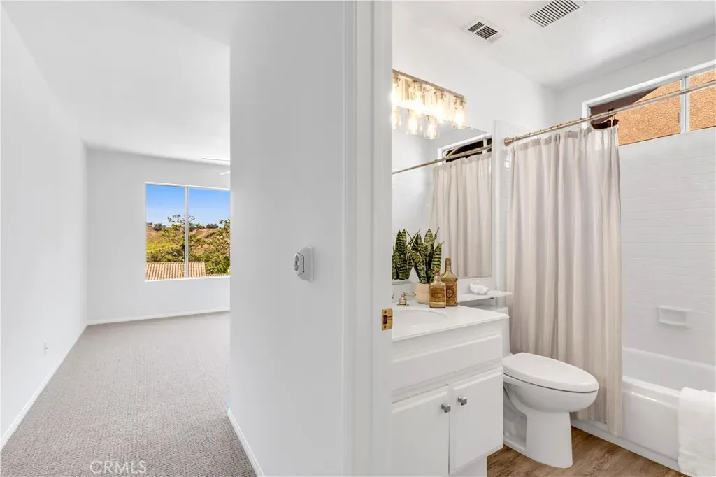 Located in the sought-after Tierra Linda community in the heart of Rancho Santa Margarita, this home offers beautiful hillside views and a highly functional 3 bedroom plus loft floor plan. The layout features one bedroom and full bathroom on the main level and two bedrooms and 2 full bathrooms upstairs, plus a spacious open loft / Flex space. Skylights in both the loft and primary suite bring in abundant natural light, enhancing the bright and airy feel throughout this beautiful home. The open floor plan offers welcoming living and dining spaces anchored by a gas fireplace. Details include sliding glass door leading to the back patio creating seamless indoor-outdoor living, LVP flooring, new carpet, fresh paint.