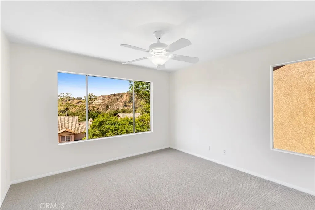 The primary suite is generously sized and offers a comfortable retreat with a skylight, ceiling fan, a large walk-in closet and a ensuite bathroom showcasing dual vanities, new light fixture, wood cabinetry, and a frameless glass walk-in shower with a new door. The third bedroom offers panoramic hillside views and can easily accommodate a Queen sized bed. An oversized loft / Flex space with large skylights offers endless possibilities: a tv room, a kid space, a craft room – anything you need extra space for.