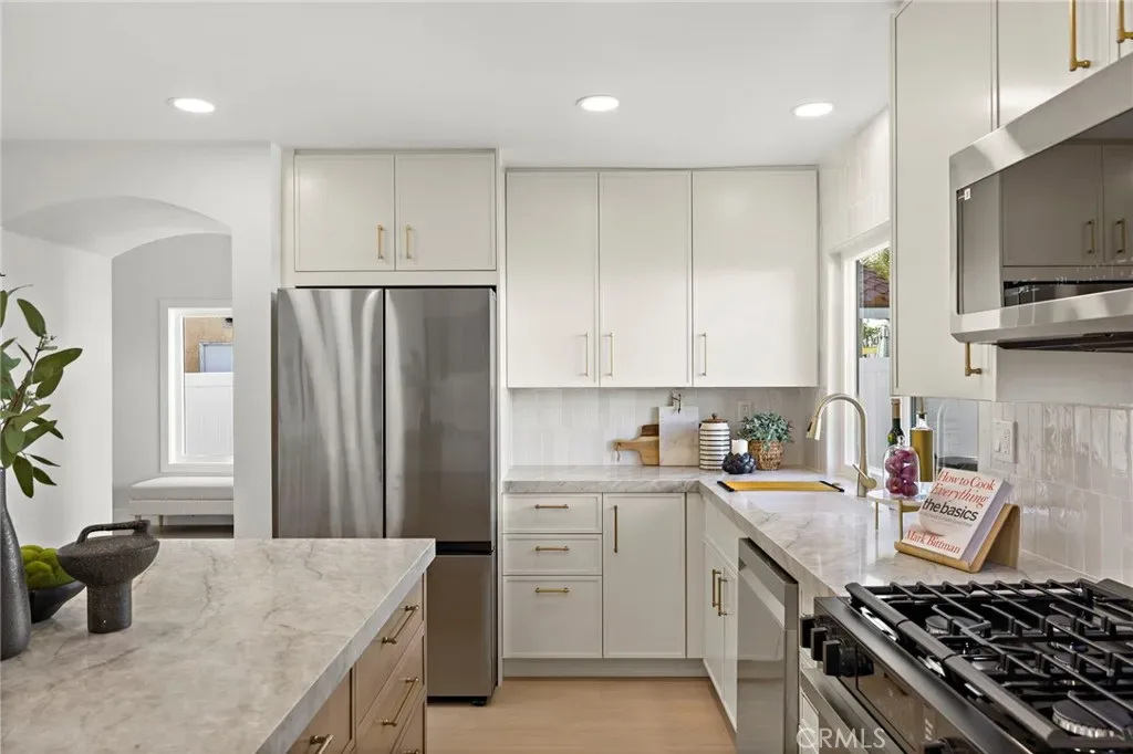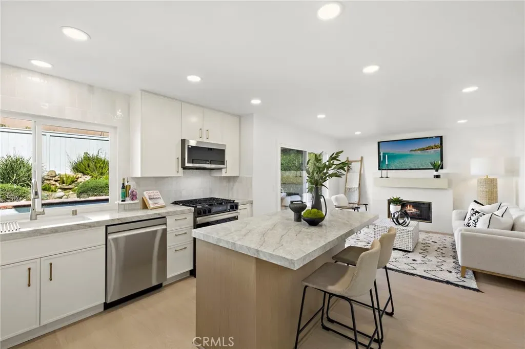 The stunning kitchen is the centerpiece of the home, highlighted by an oversized island, brand-new appliances, stylish lighting, and fresh finishes—perfect for entertaining and everyday living.