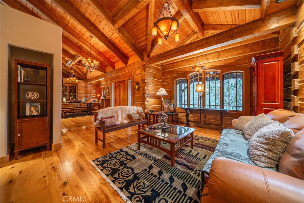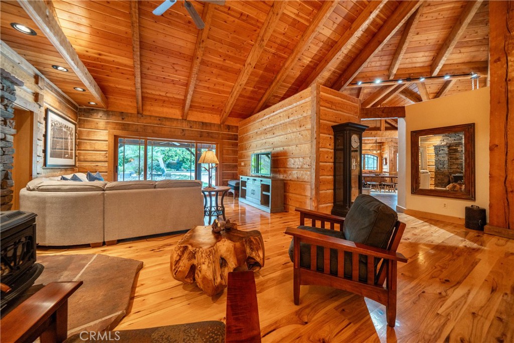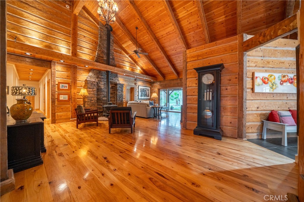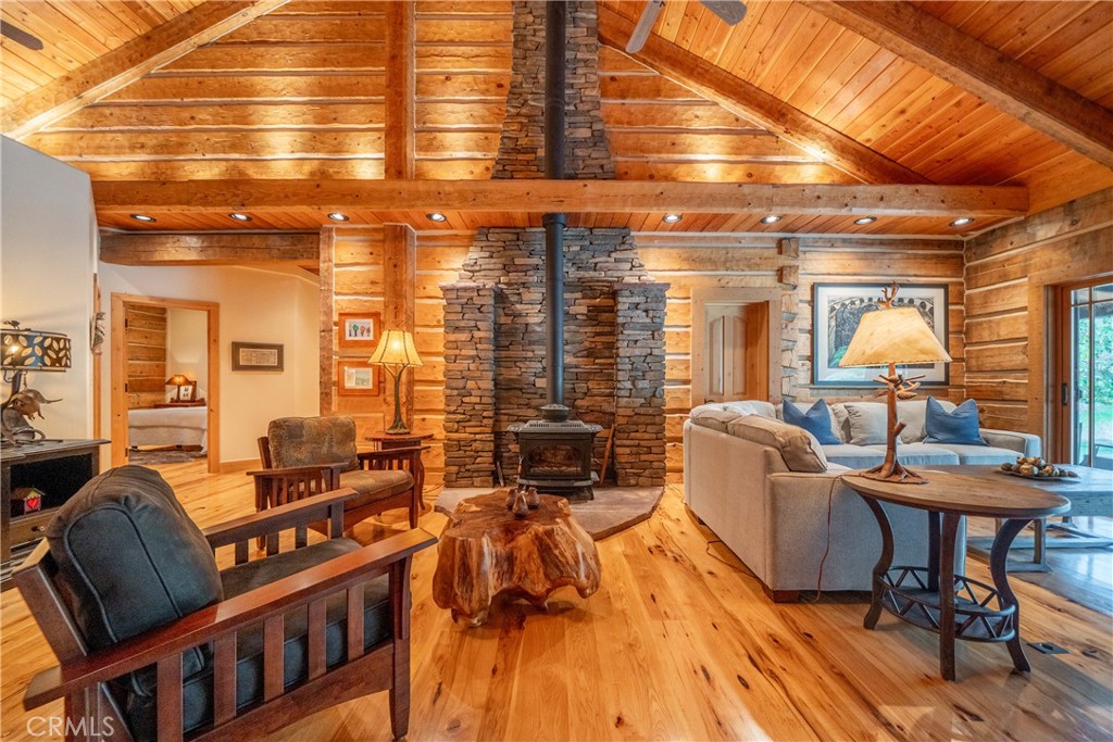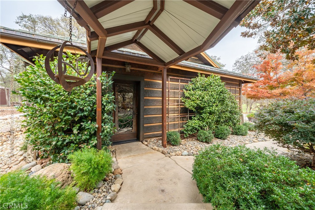 Incredible Custom Hand-Hewn Log Home on 5 Private Acres Prepare to be amazed by this one-of-a-kind, custom-built hand-hewn log home that perfectly blends rustic charm with modern elegance. *Scan the QR code (picture #2) to experience a 3D Virtual Tour!* Featuring 12-foot walls and soaring 25-foot ceilings, this architectural masterpiece offers a warm yet luxurious atmosphere throughout its nearly 3,500 sq. ft. of living space. Inside, you’ll find hickory plank hardwood floors, granite countertops, and a commercial-grade chef’s kitchen equipped with premium appliances. The stone hearth wood-burning fireplace creates a stunning focal point in the great room, while arched windows fill the home with natural light and showcase views of the surrounding landscape. With 4 spacious bedrooms—each featuring at least one wall of exposed logs—and 3.5 beautifully appointed bathrooms, this home offers both character and comfort. Step outside to enjoy the full wraparound covered porch, perfect for relaxing or entertaining. The in-ground gunite pool, garden boxes, and built-in fire pit make outdoor living exceptional. A poured concrete driveway and sidewalks are finished with natural, wavy edges and etched twig-and-leaf details for a custom artisan touch. Additional highlights include a Metal Class A fire-rated roof, detached 4-car garage, detached metal shop, and walking paths throughout the property. Every inch of this home reflects craftsmanship, creativity, and care. This absolute stunner and truly one of a kind was featured in Log Home Design magazine and found a spot in Redding, California’s AAUW prestigious annual home tour.